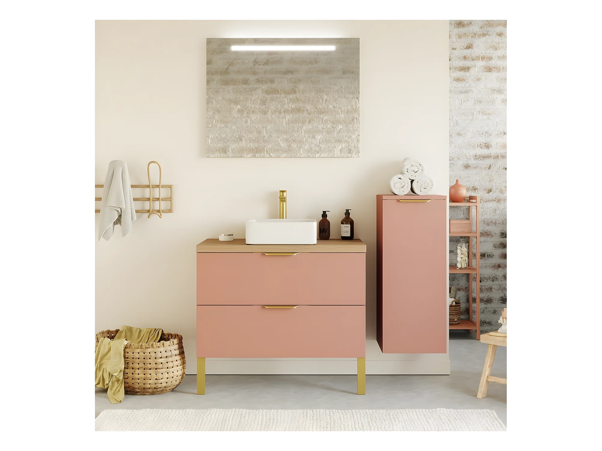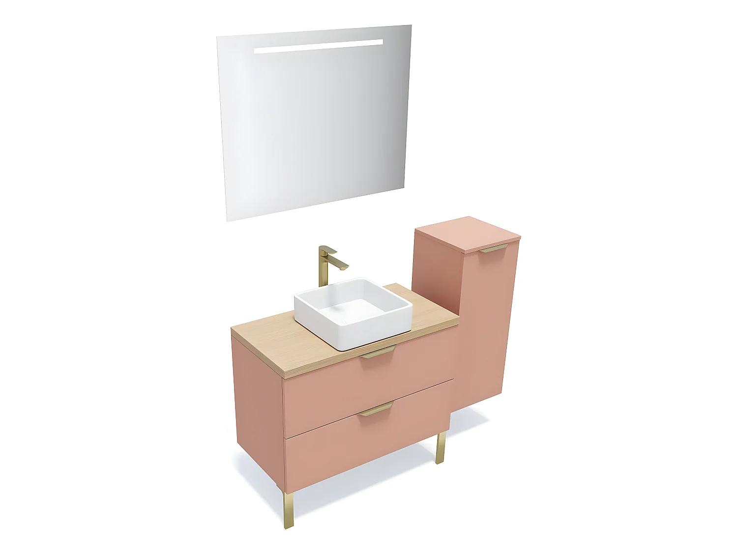 Meuble de salle de bain suspendu vasque à poser 90cm 2 tiroirs Abricot + miroir + colonne ouverture droite - Venice