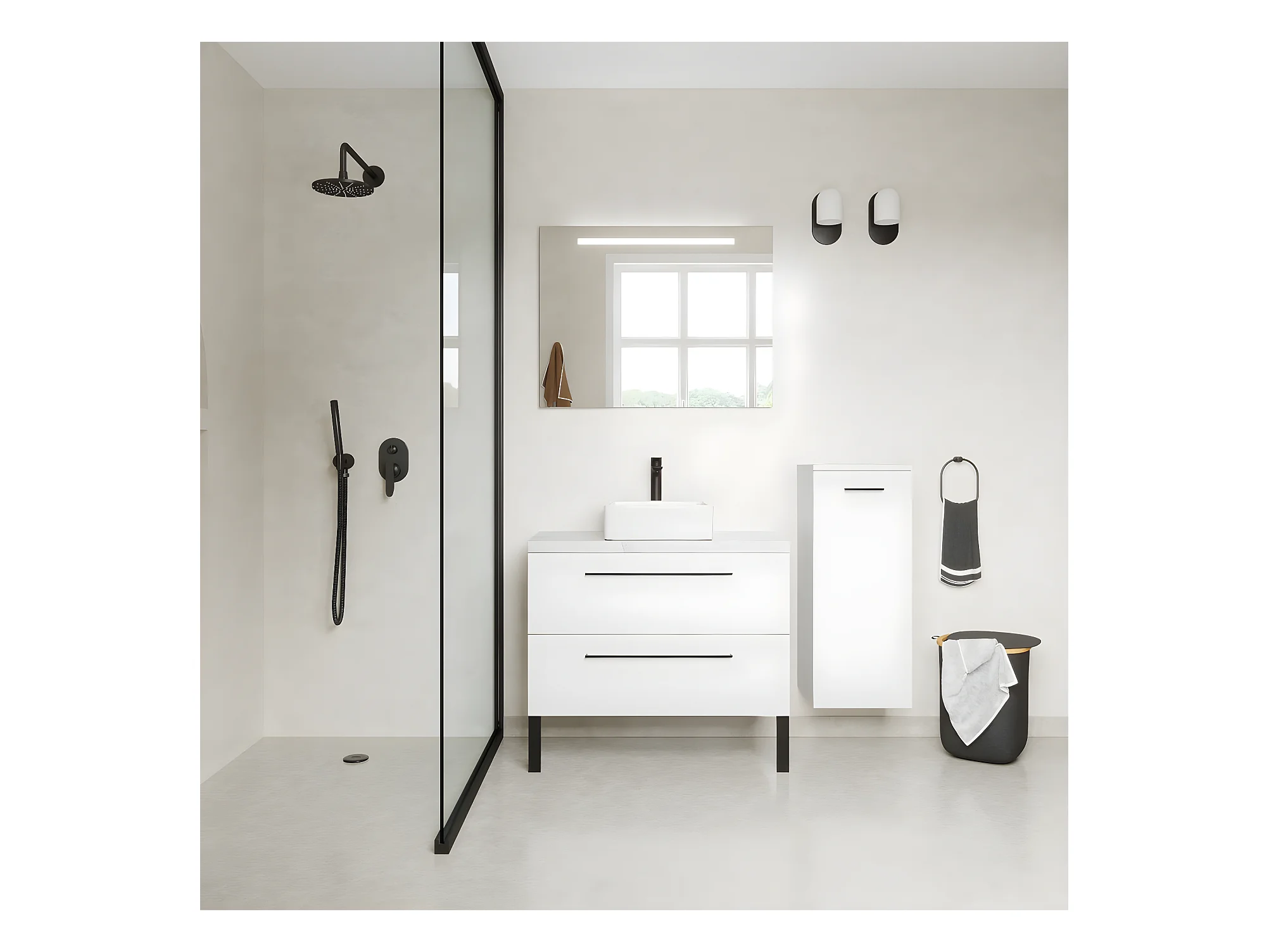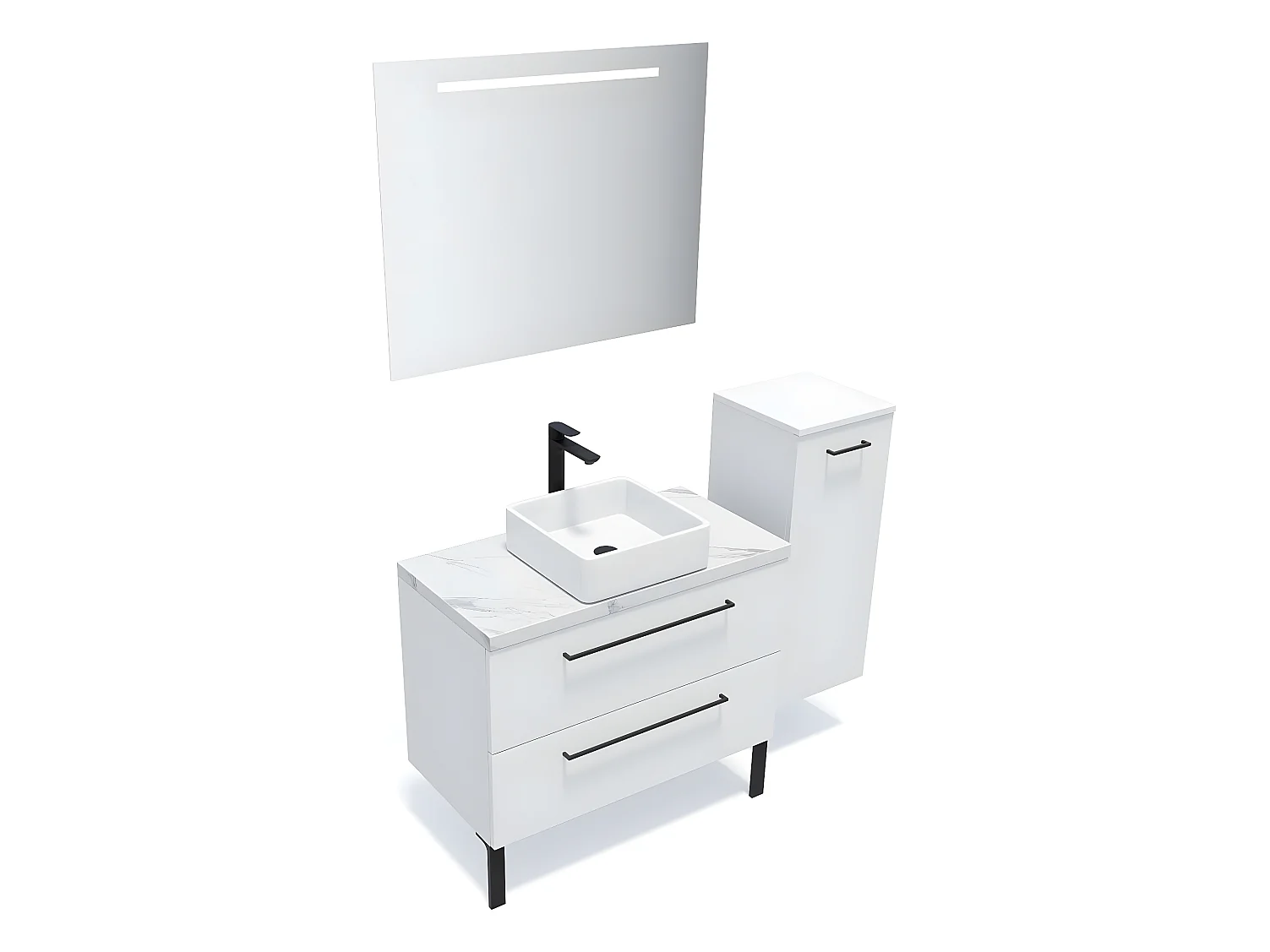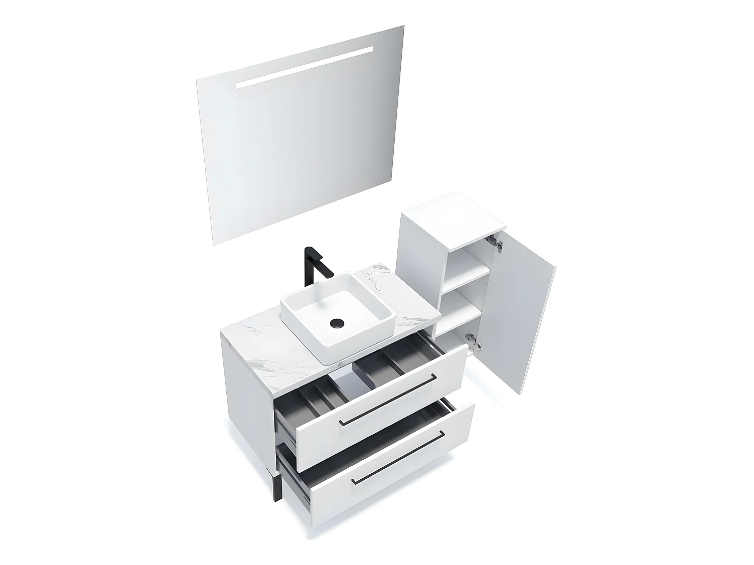 Meuble de salle de bain suspendu vasque à poser 90cm 2 tiroirs Blanc + miroir + colonne ouverture droite - Glasgow