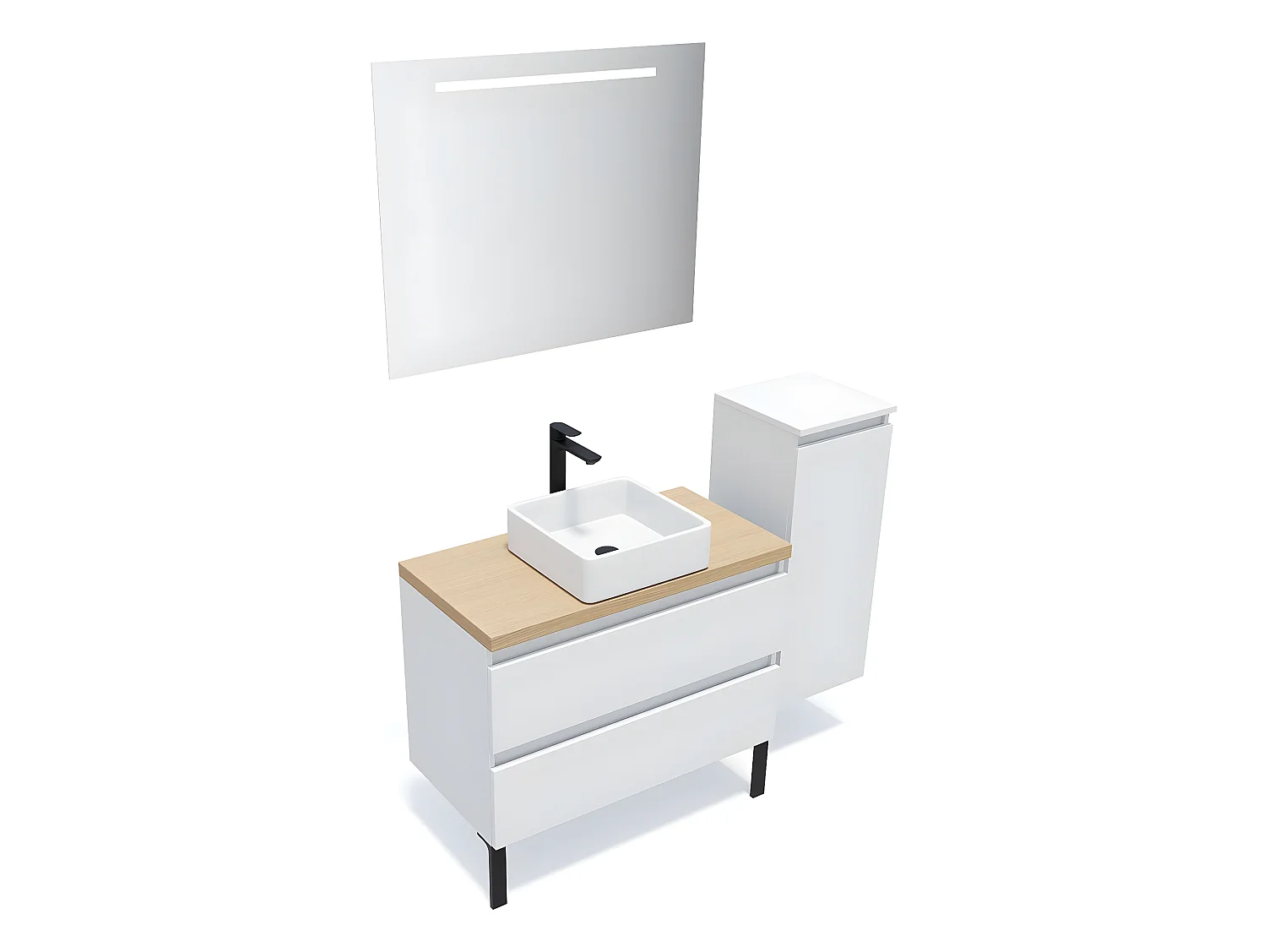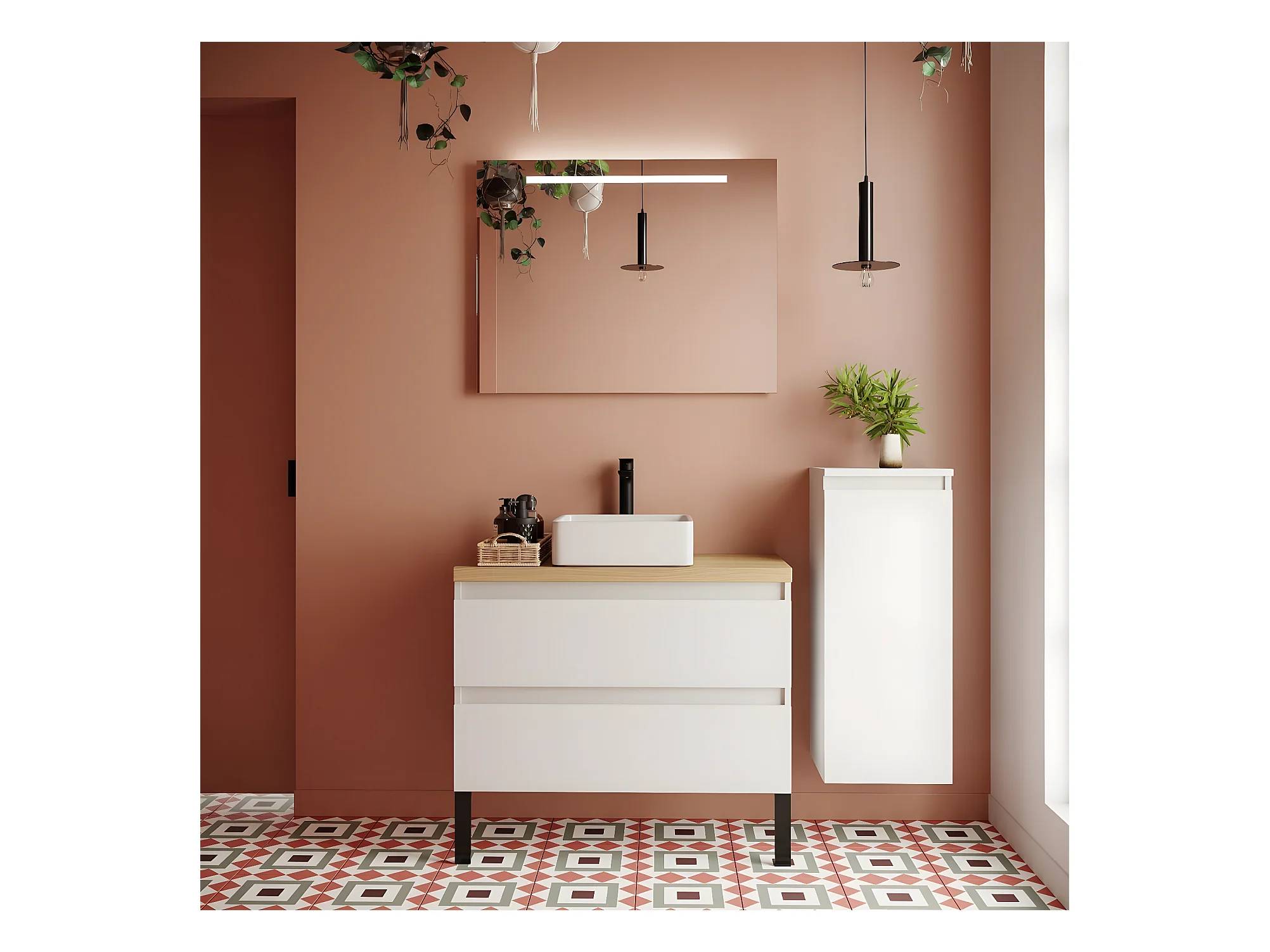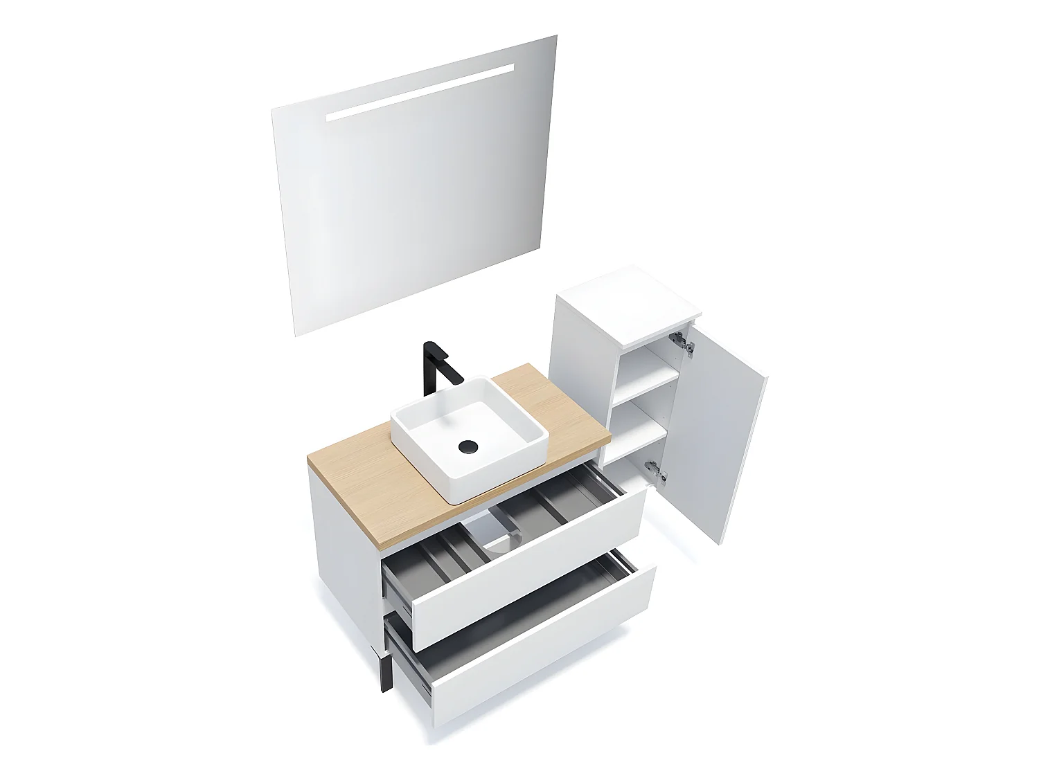 Meuble de salle de bain suspendu vasque à poser 90cm 2 tiroirs Blanc + miroir + colonne ouverture droite - Hudson