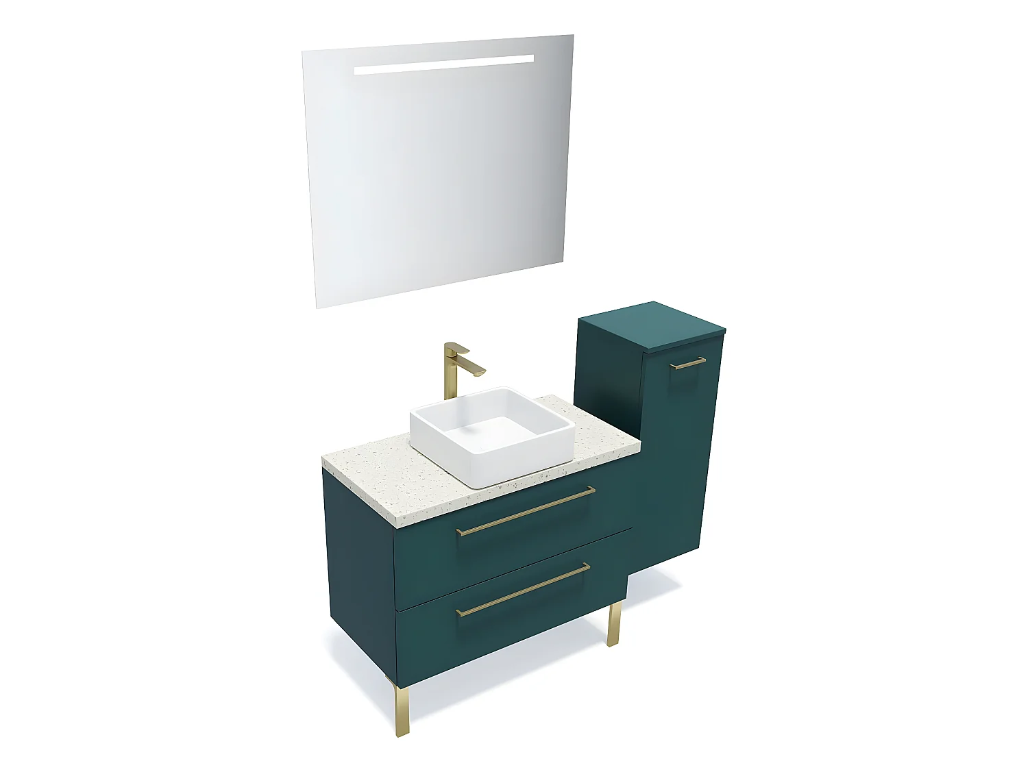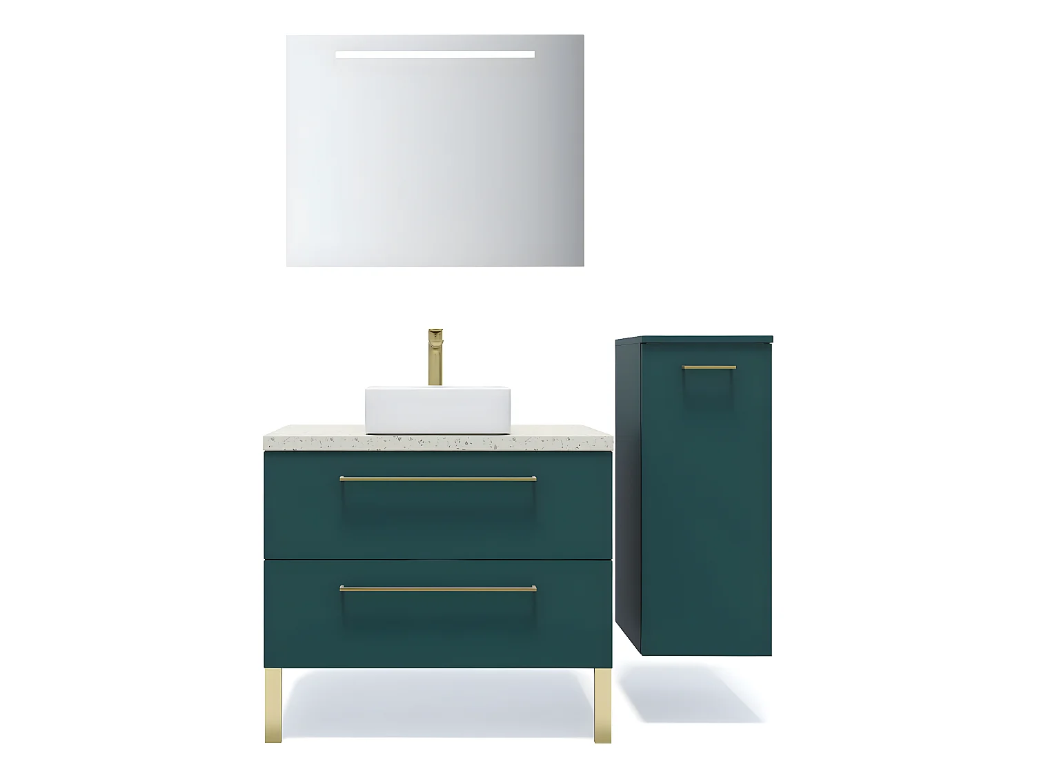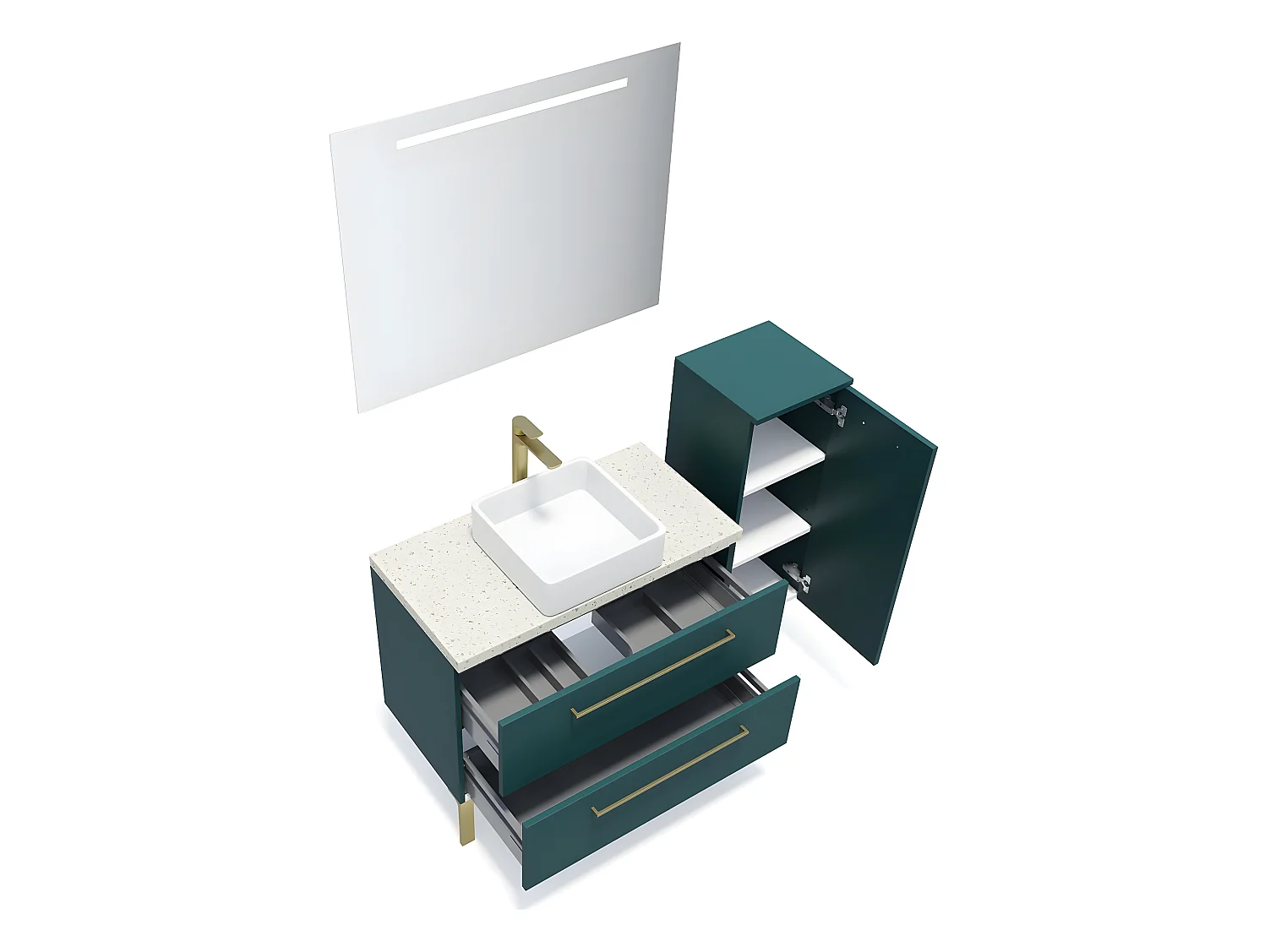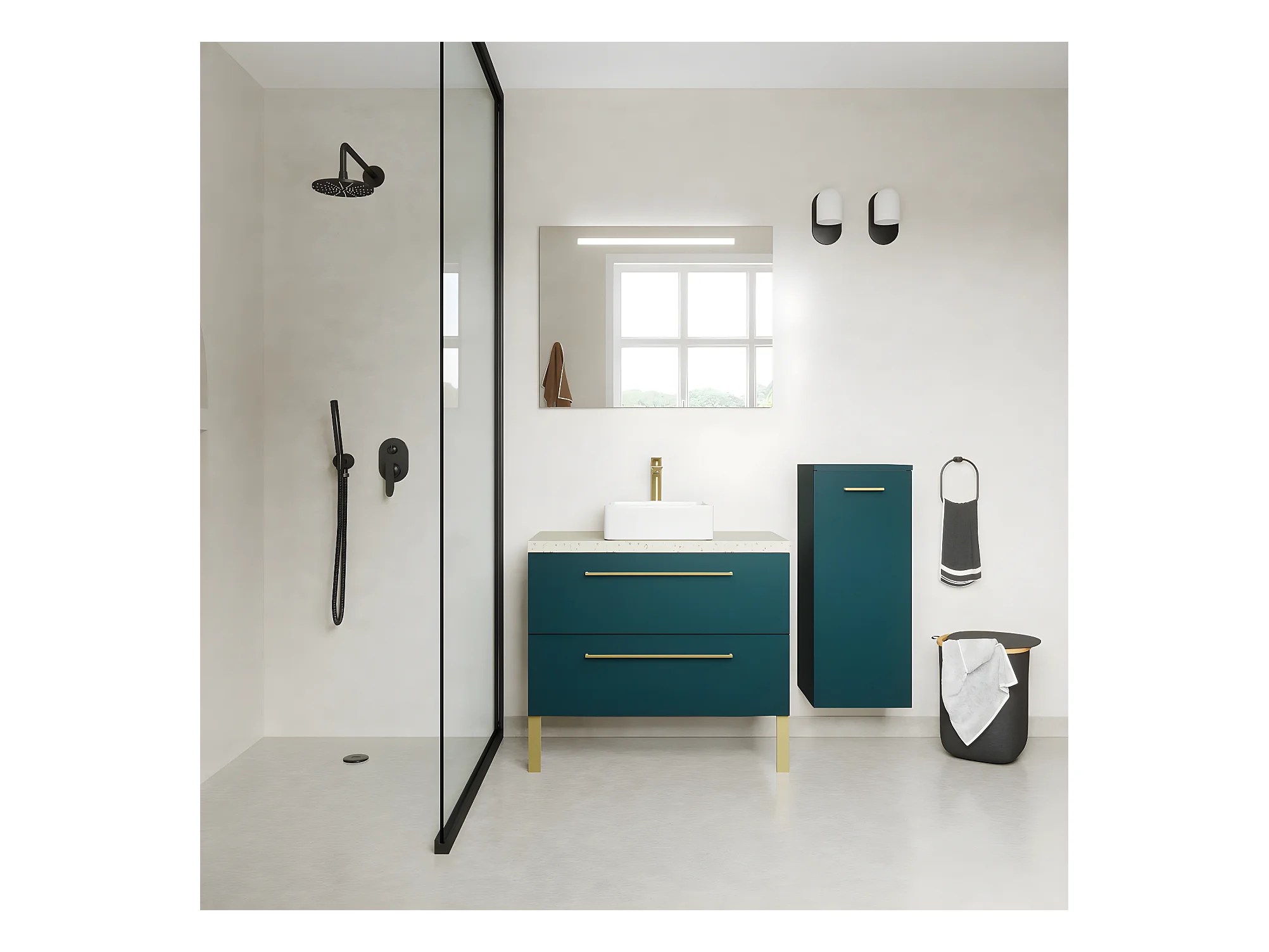 Meuble de salle de bain suspendu vasque à poser 90cm 2 tiroirs Bleu + miroir + colonne ouverture droite - Glasgow