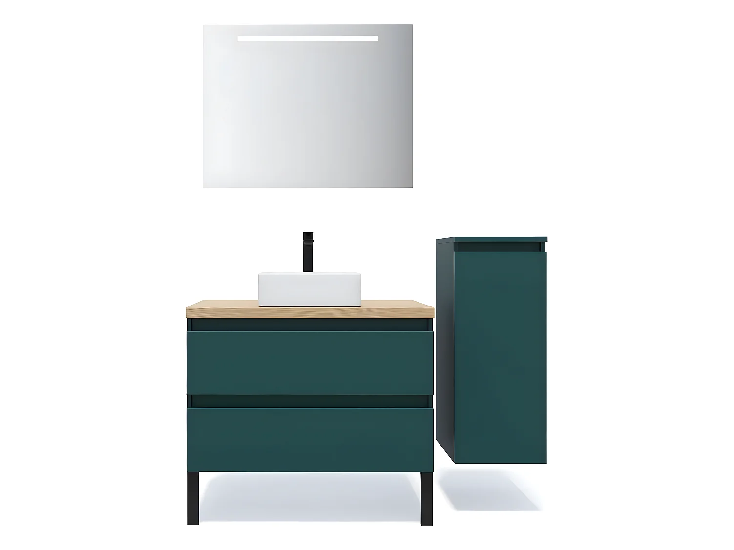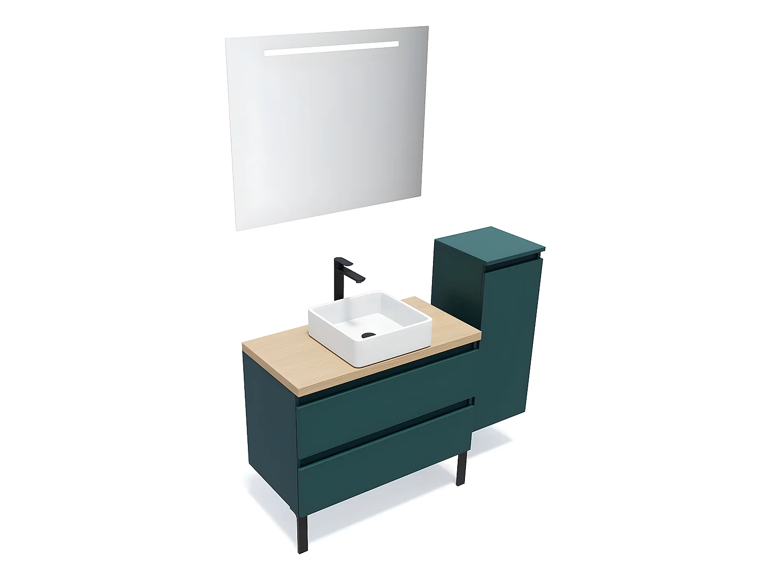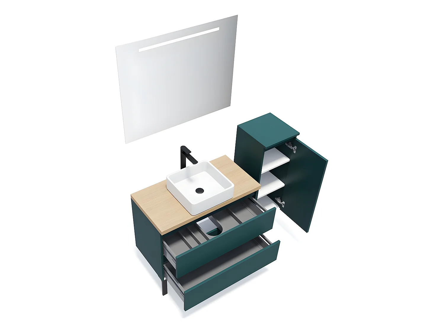 Meuble de salle de bain suspendu vasque à poser 90cm 2 tiroirs Bleu + miroir + colonne ouverture droite - Hudson