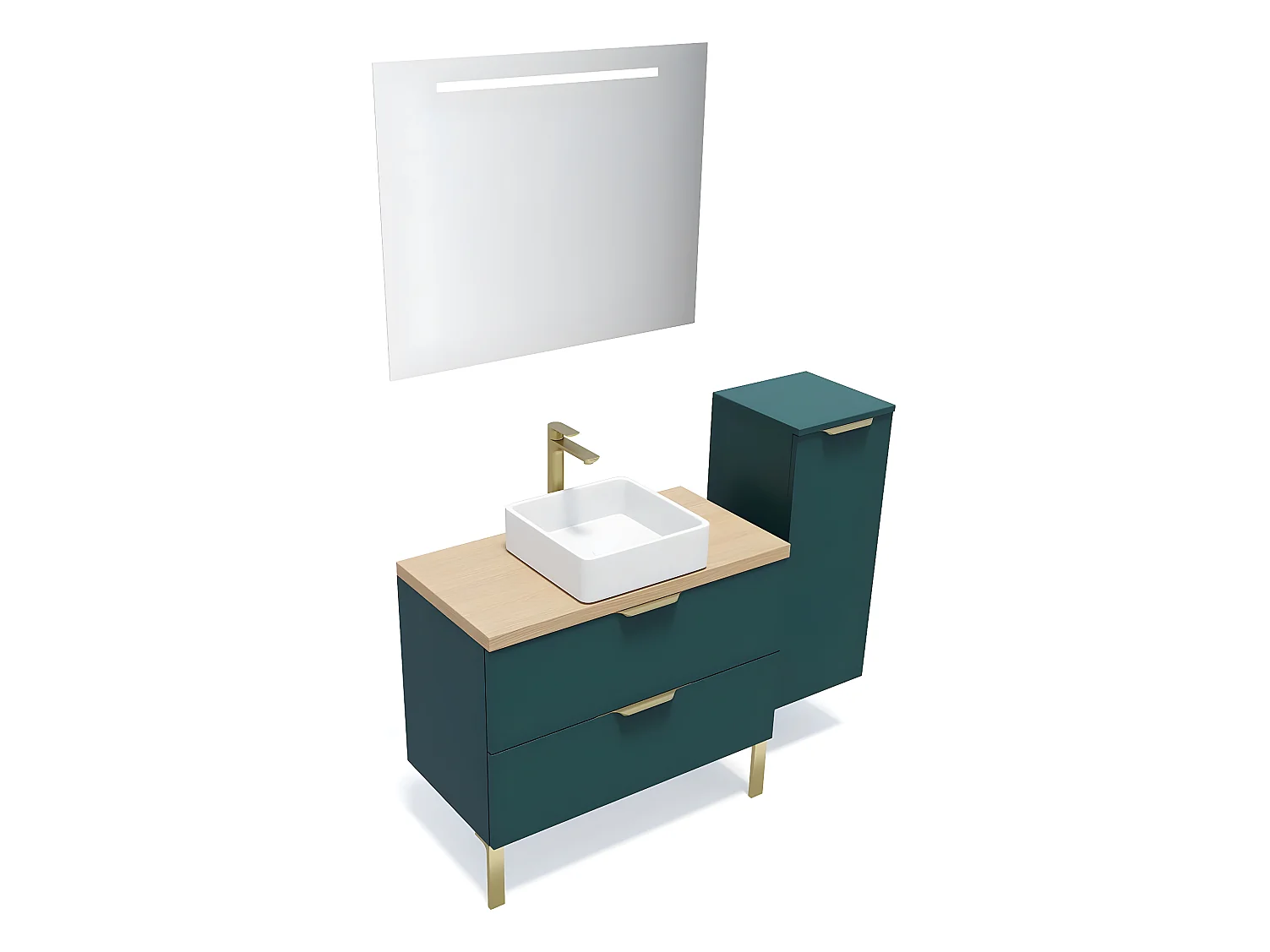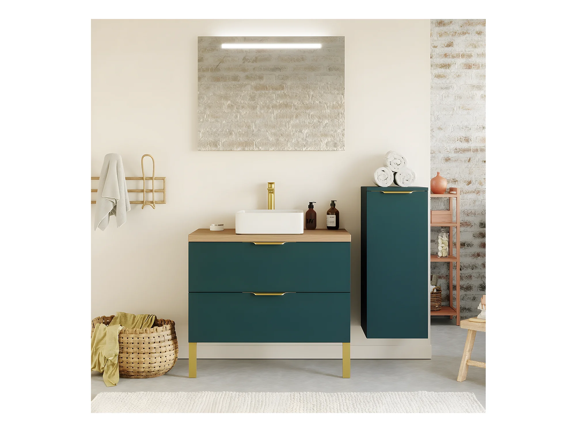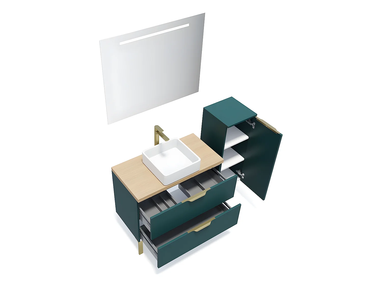 Meuble de salle de bain suspendu vasque à poser 90cm 2 tiroirs Bleu + miroir + colonne ouverture droite - Venice