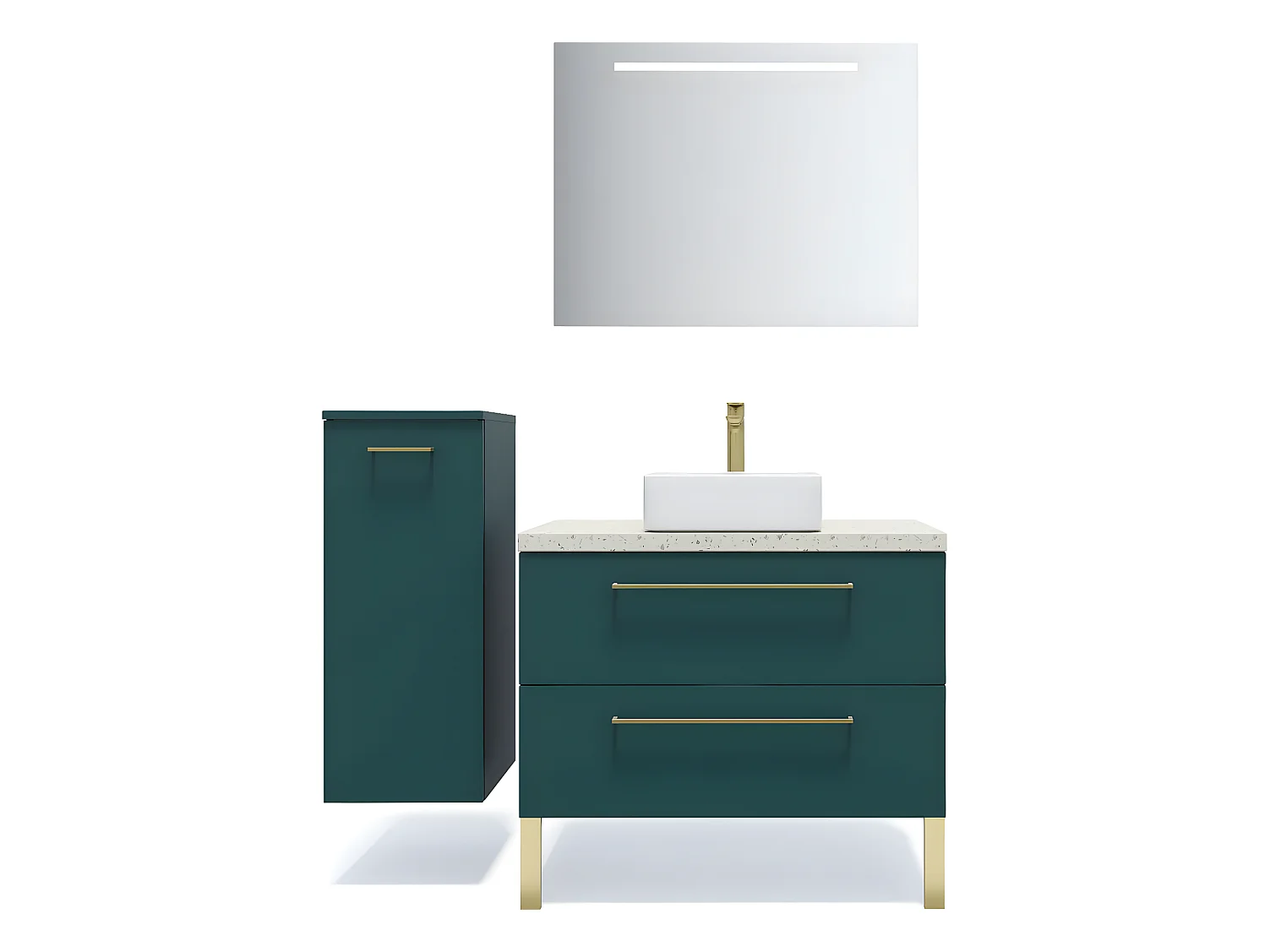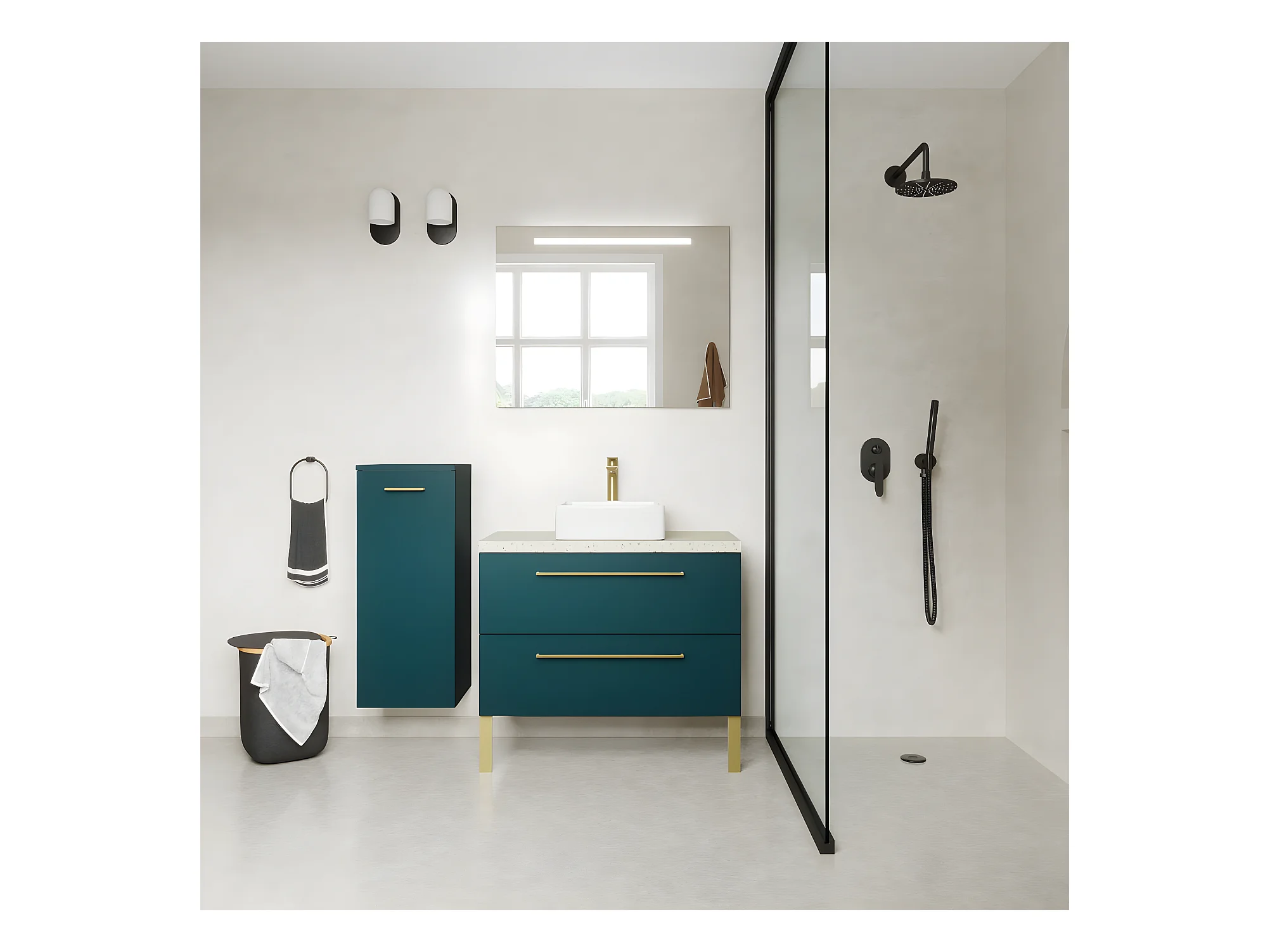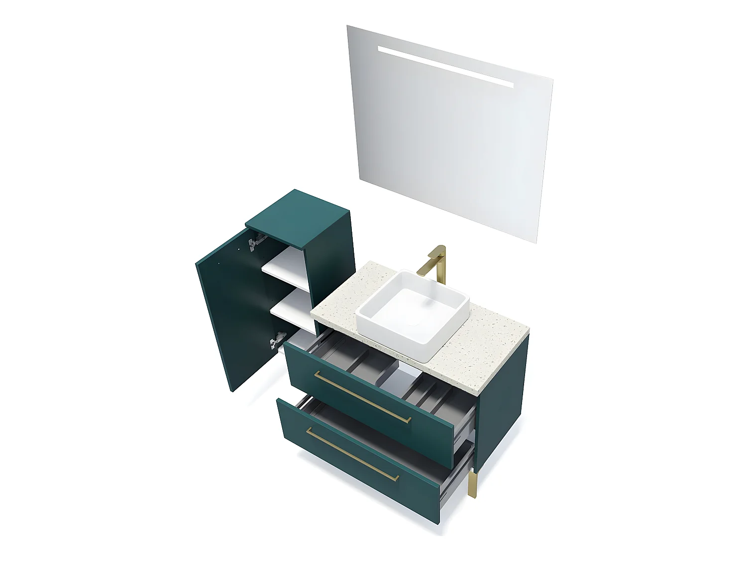 Meuble de salle de bain suspendu vasque à poser 90cm 2 tiroirs Bleu + miroir + colonne ouverture gauche - Glasgow