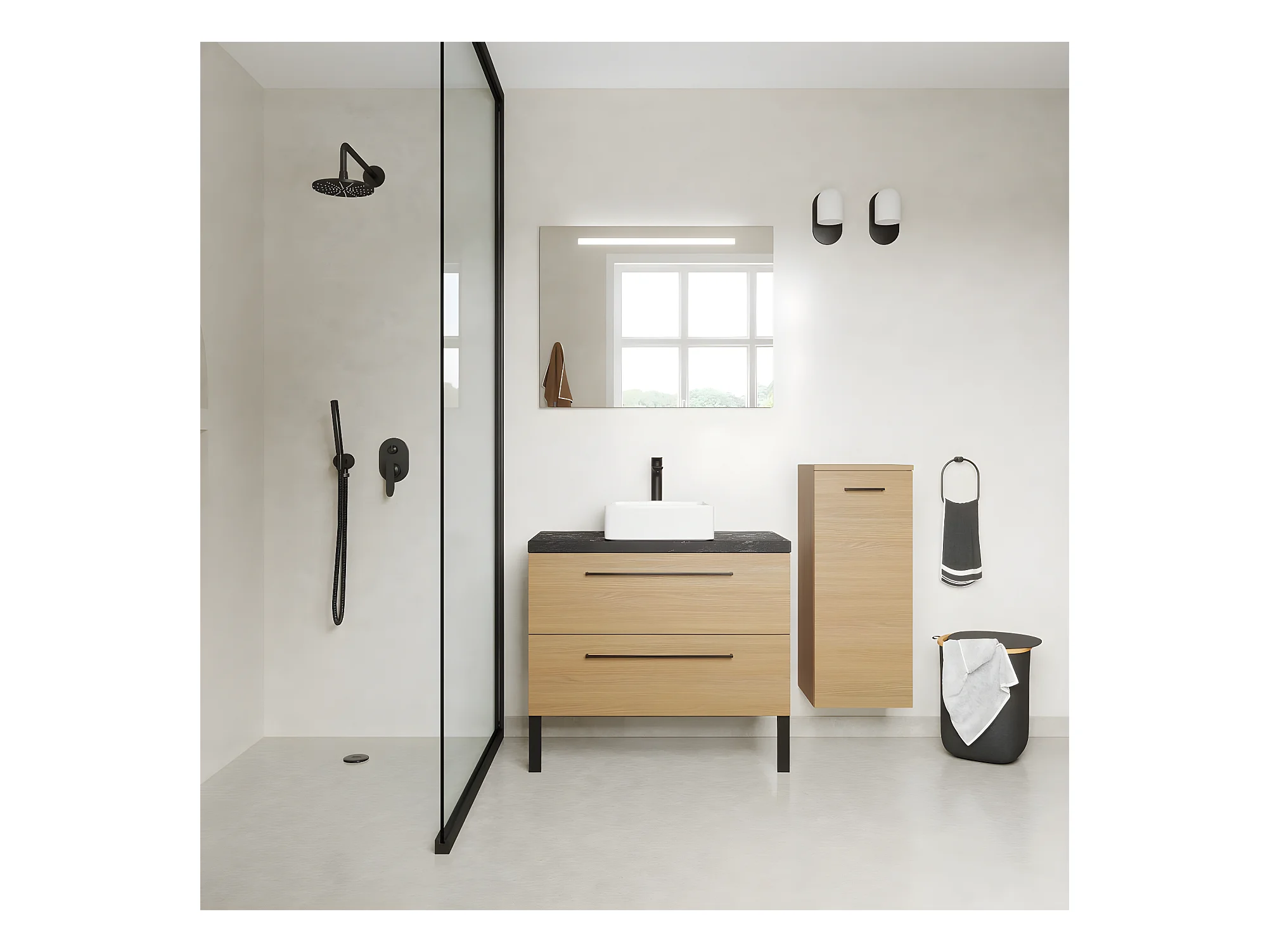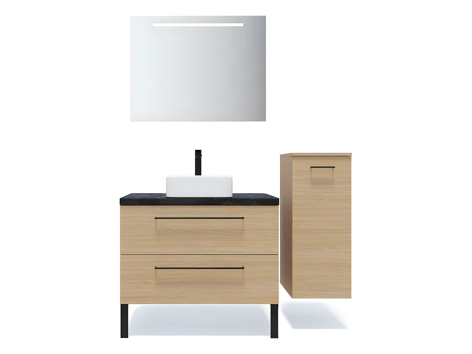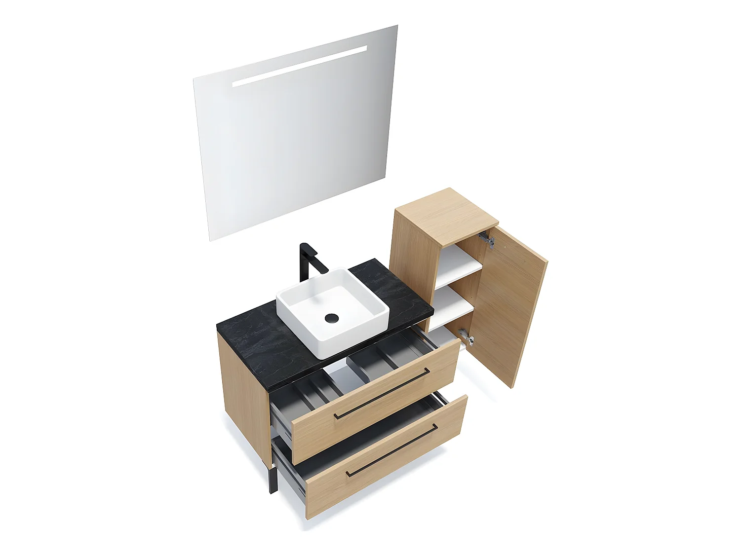 Meuble de salle de bain suspendu vasque à poser 90cm 2 tiroirs Chêne clair + miroir + colonne ouverture droite - Glasgow