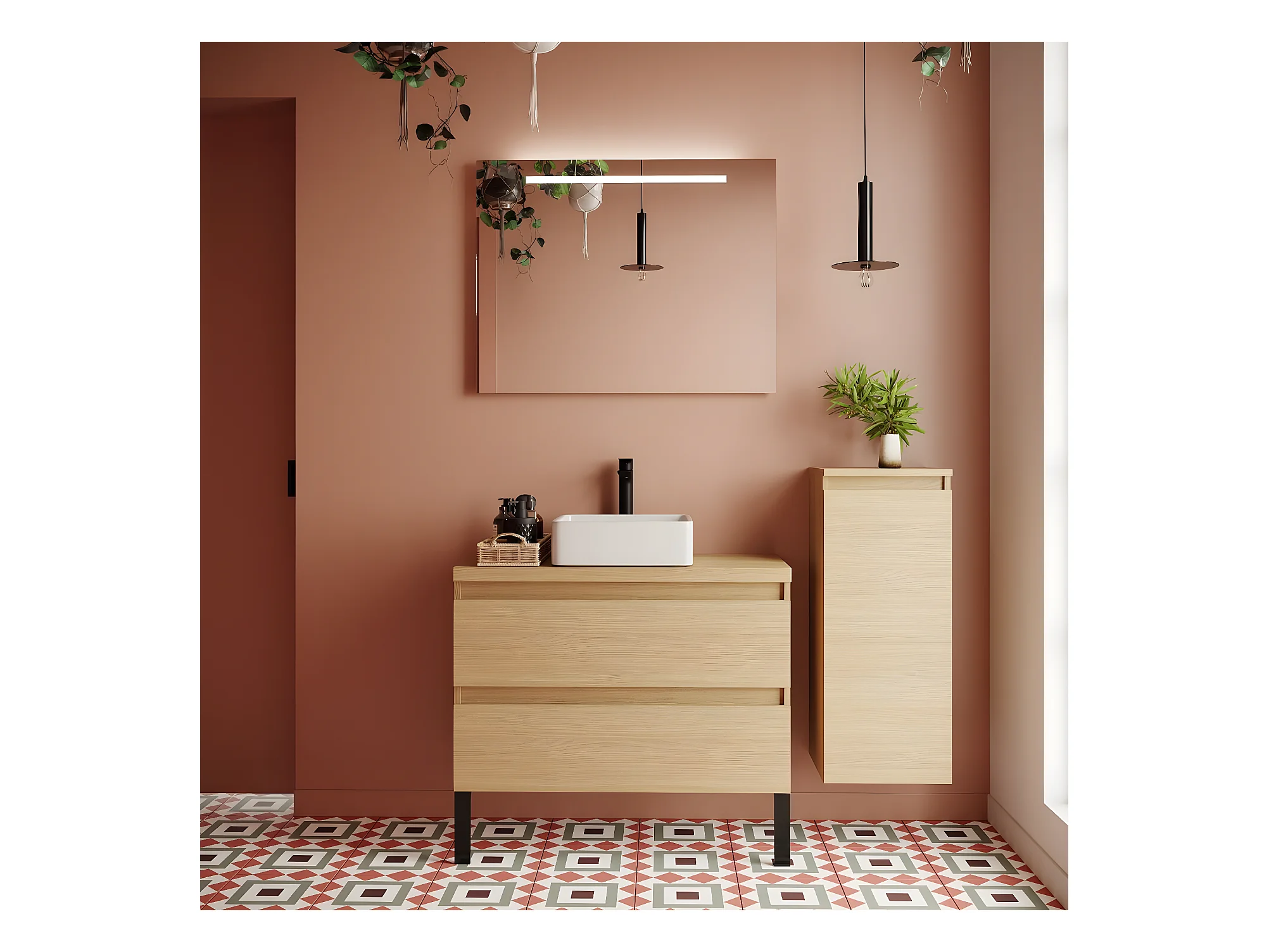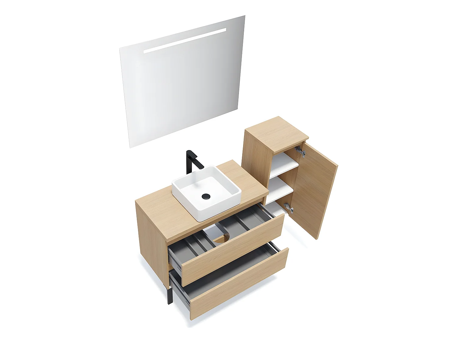 Meuble de salle de bain suspendu vasque à poser 90cm 2 tiroirs Chêne clair + miroir + colonne ouverture droite - Hudson