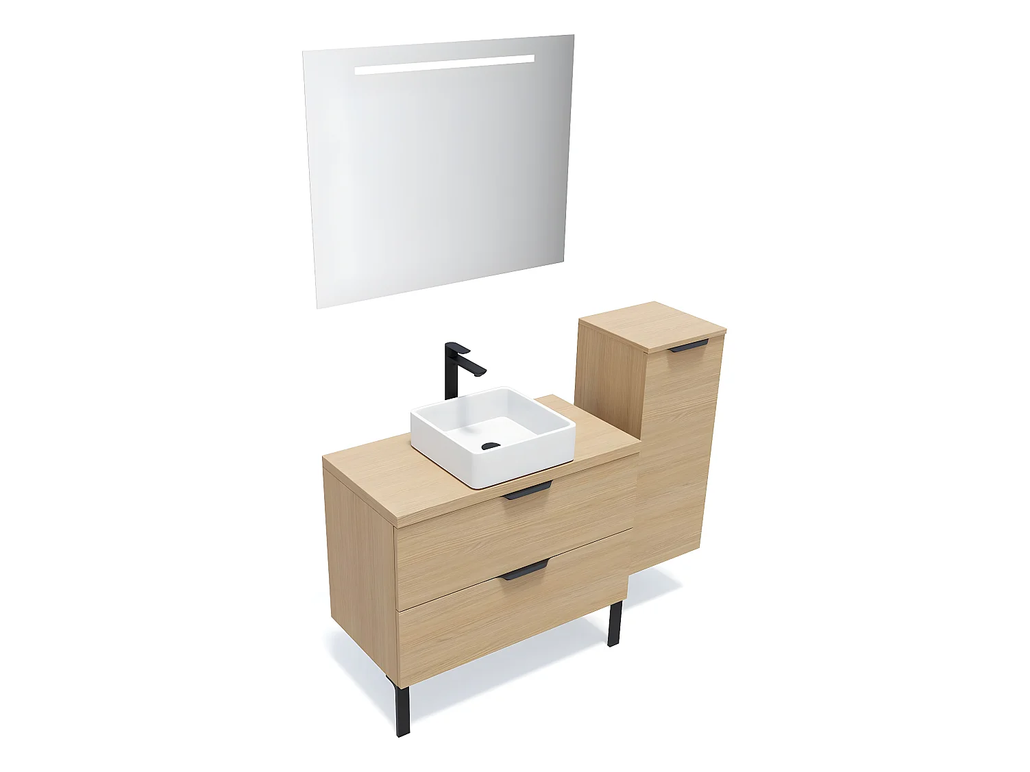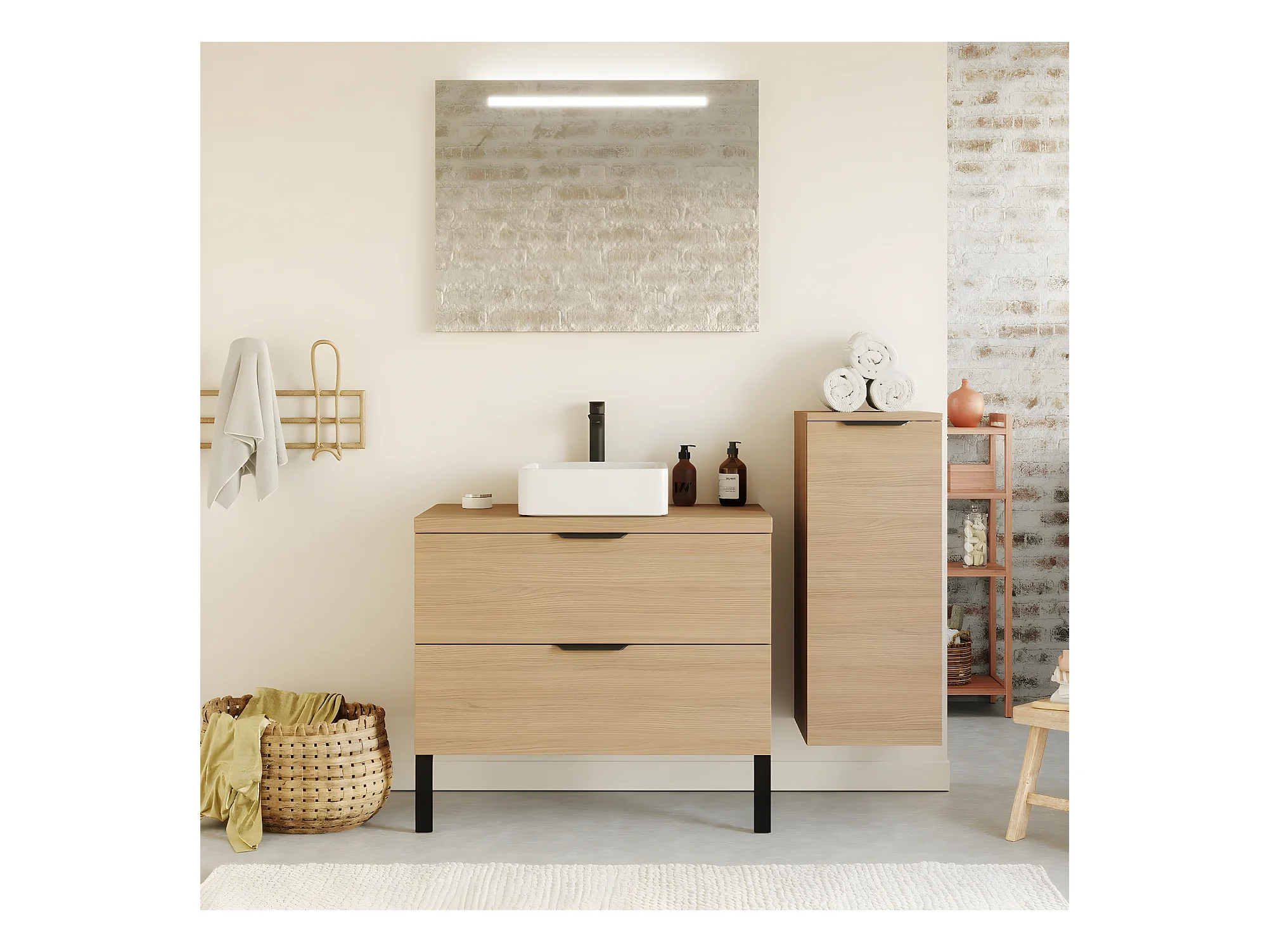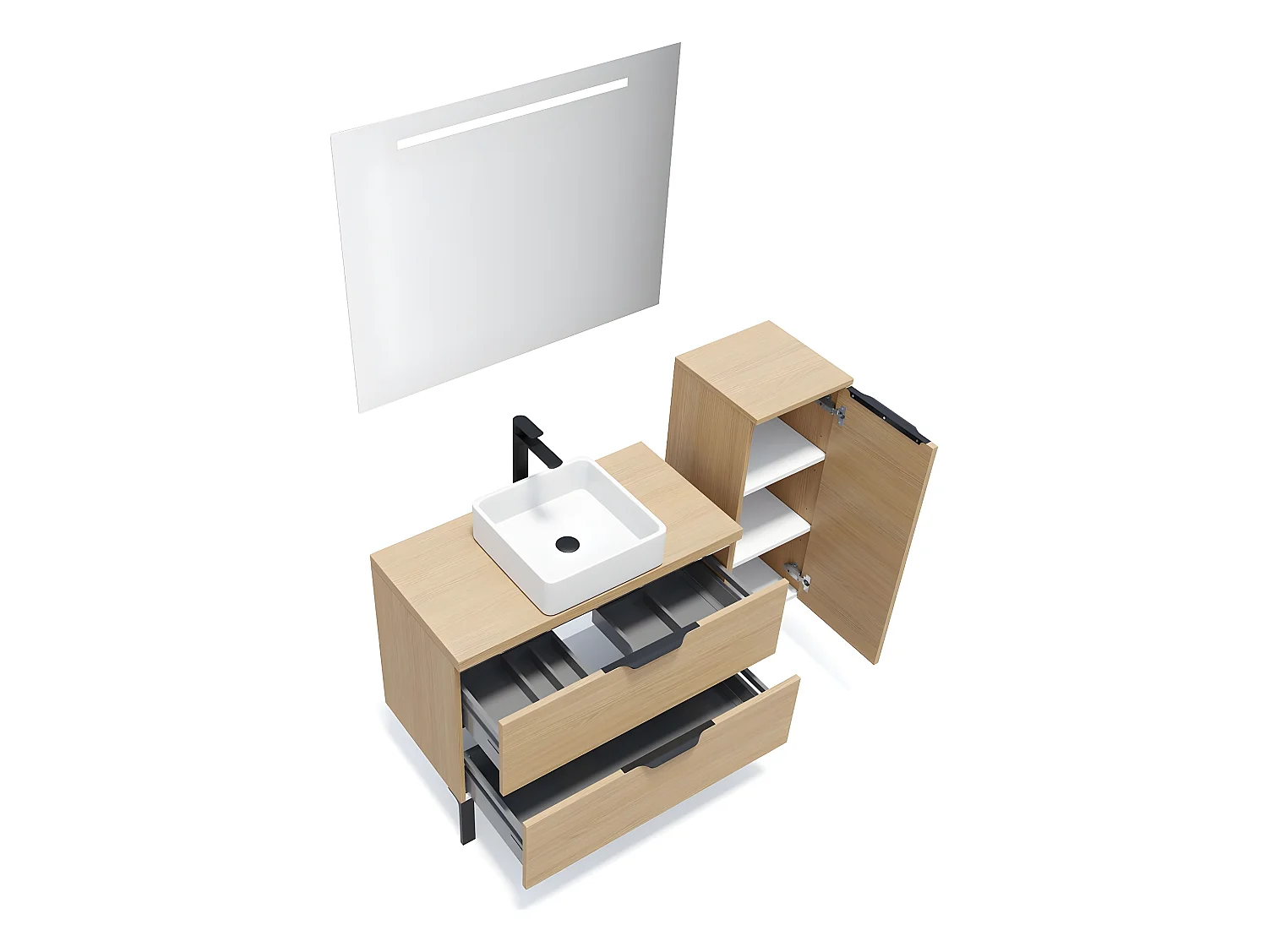 Meuble de salle de bain suspendu vasque à poser 90cm 2 tiroirs Chêne clair + miroir + colonne ouverture droite - Venice