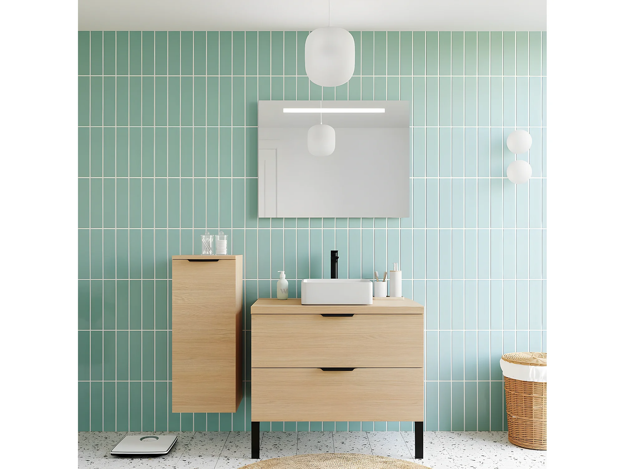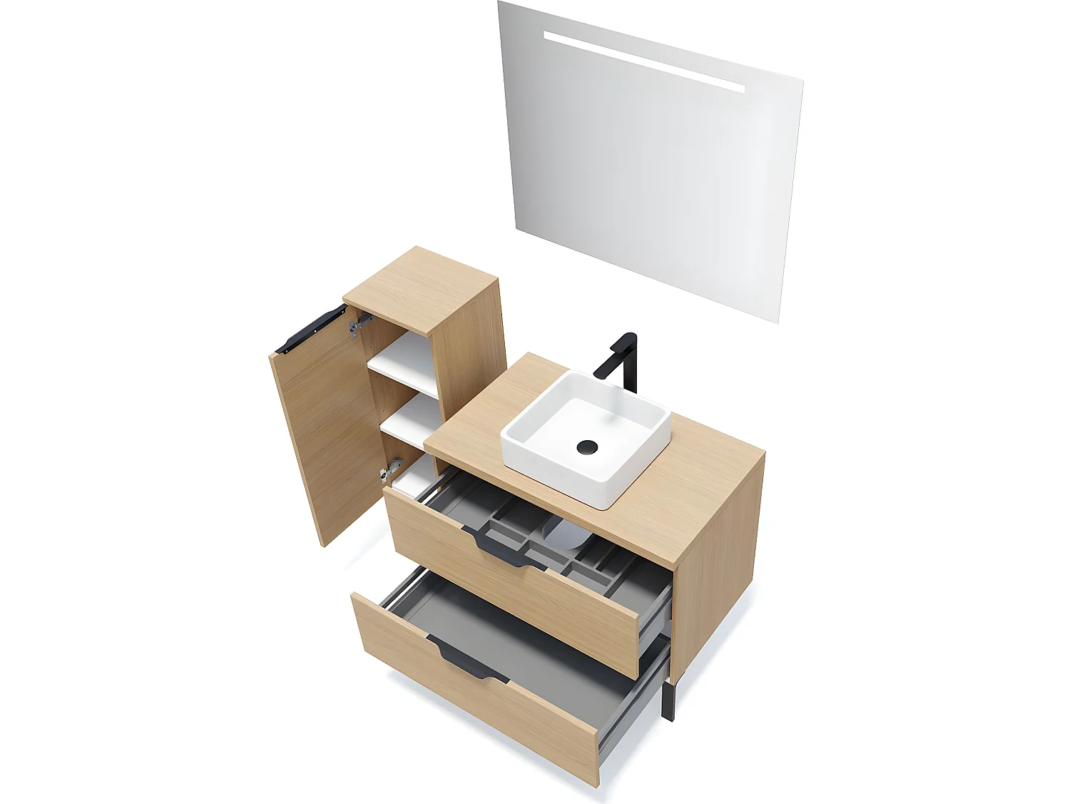 Meuble de salle de bain suspendu vasque à poser 90cm 2 tiroirs Chêne clair + miroir + colonne ouverture gauche - Soho