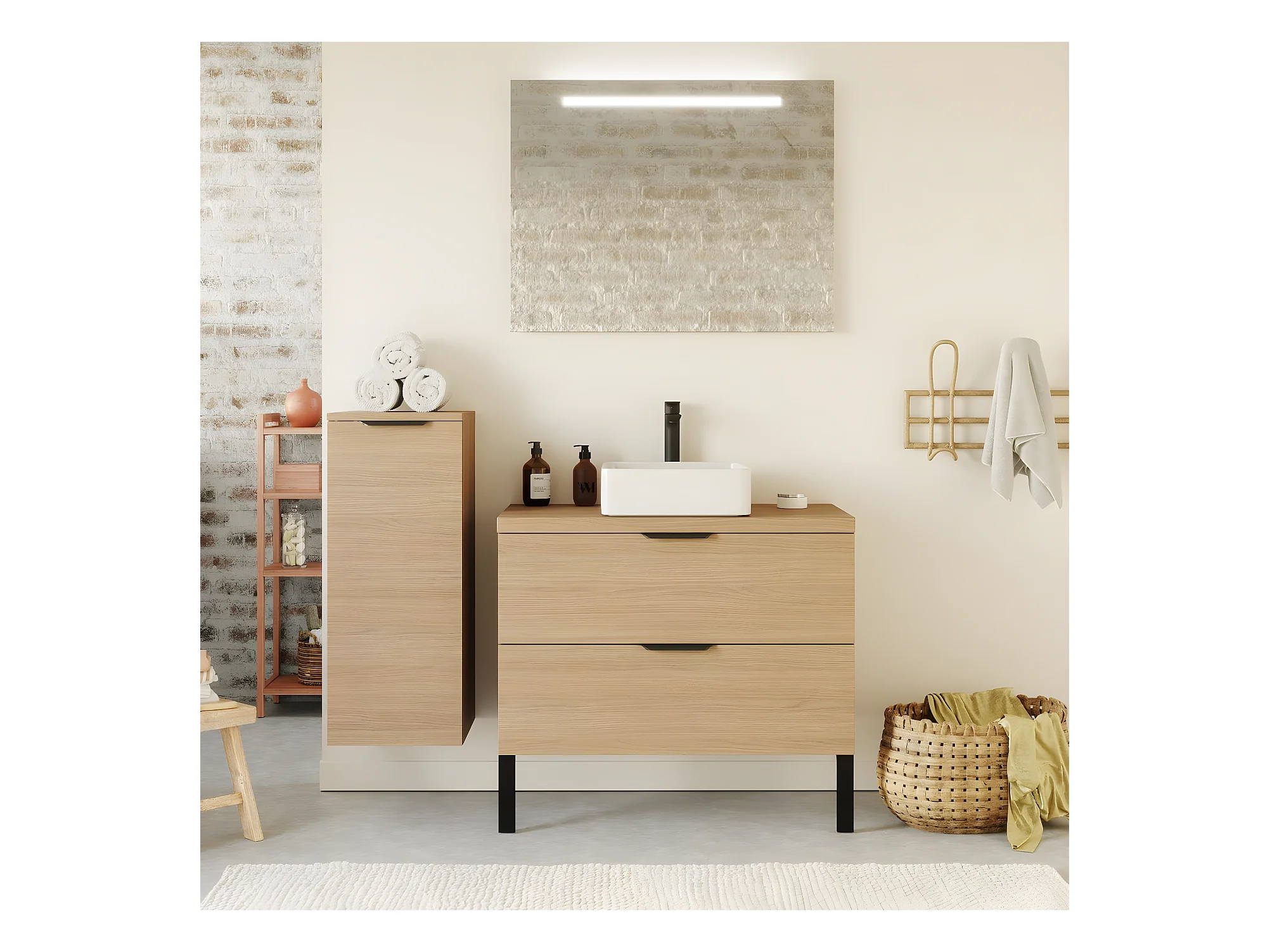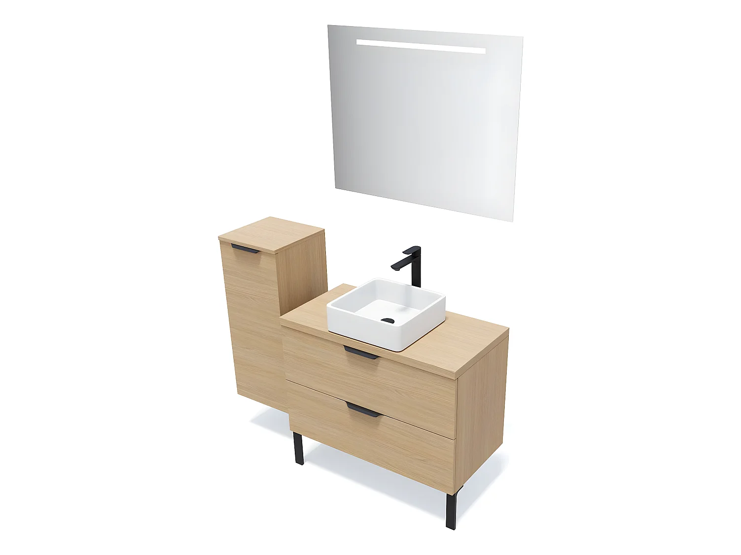 Meuble de salle de bain suspendu vasque à poser 90cm 2 tiroirs Chêne clair + miroir + colonne ouverture gauche - Venice