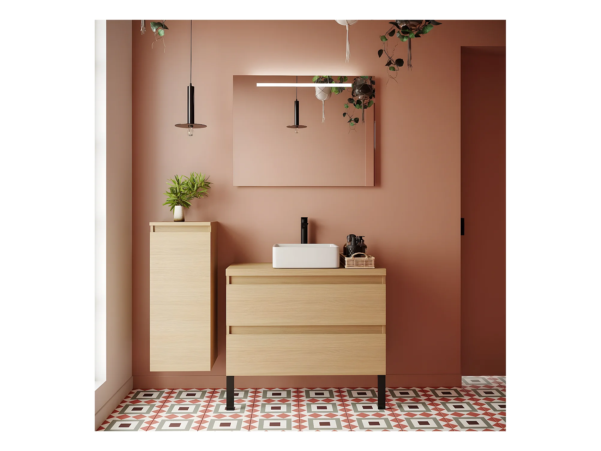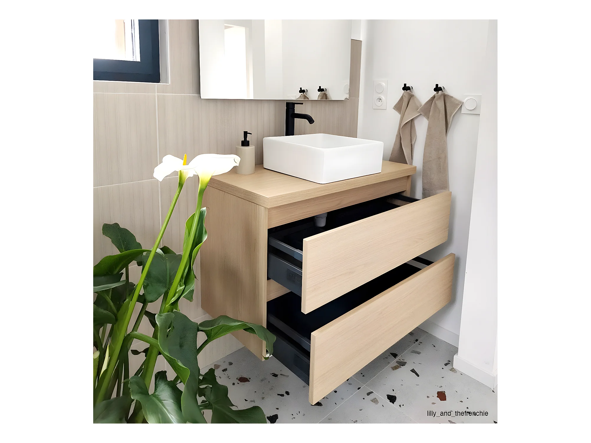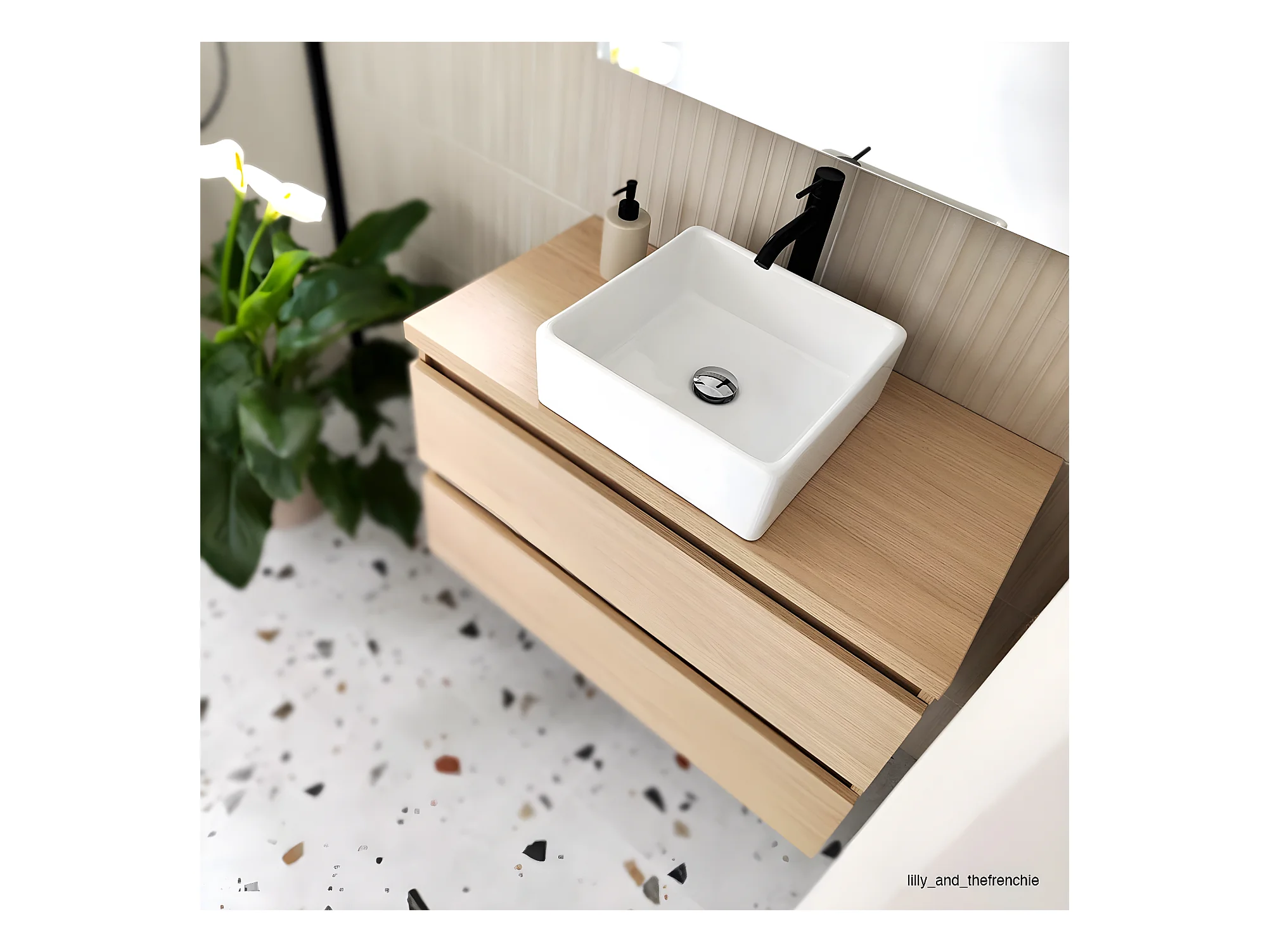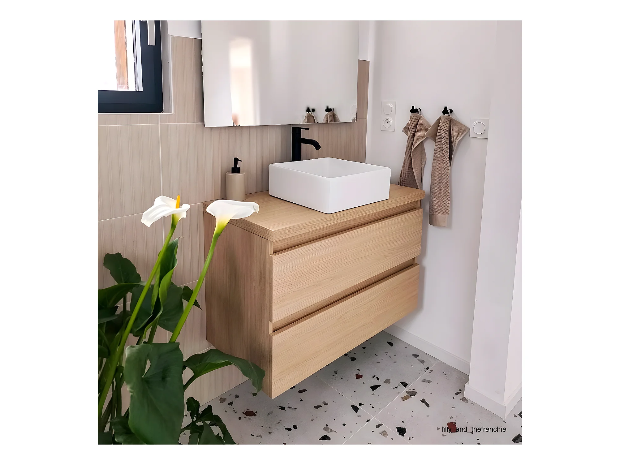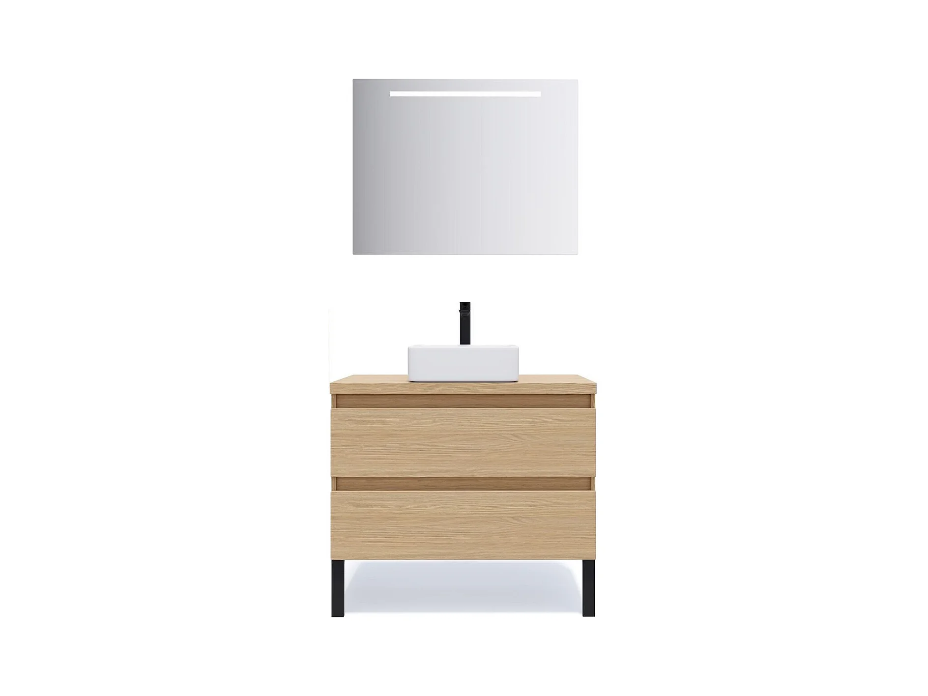 Meuble de salle de bain suspendu vasque à poser 90cm 2 tiroirs Chêne clair + miroir - Hudson