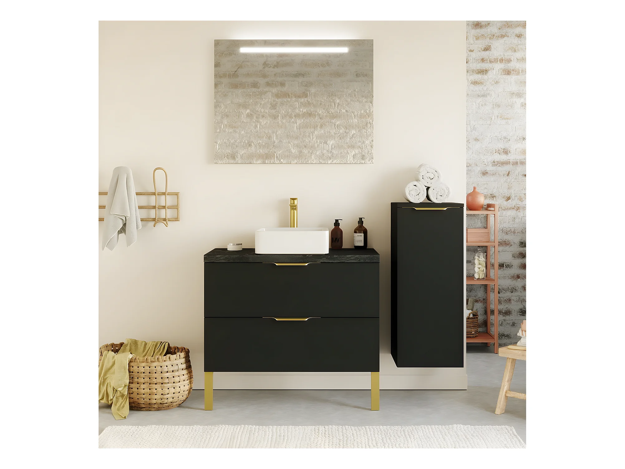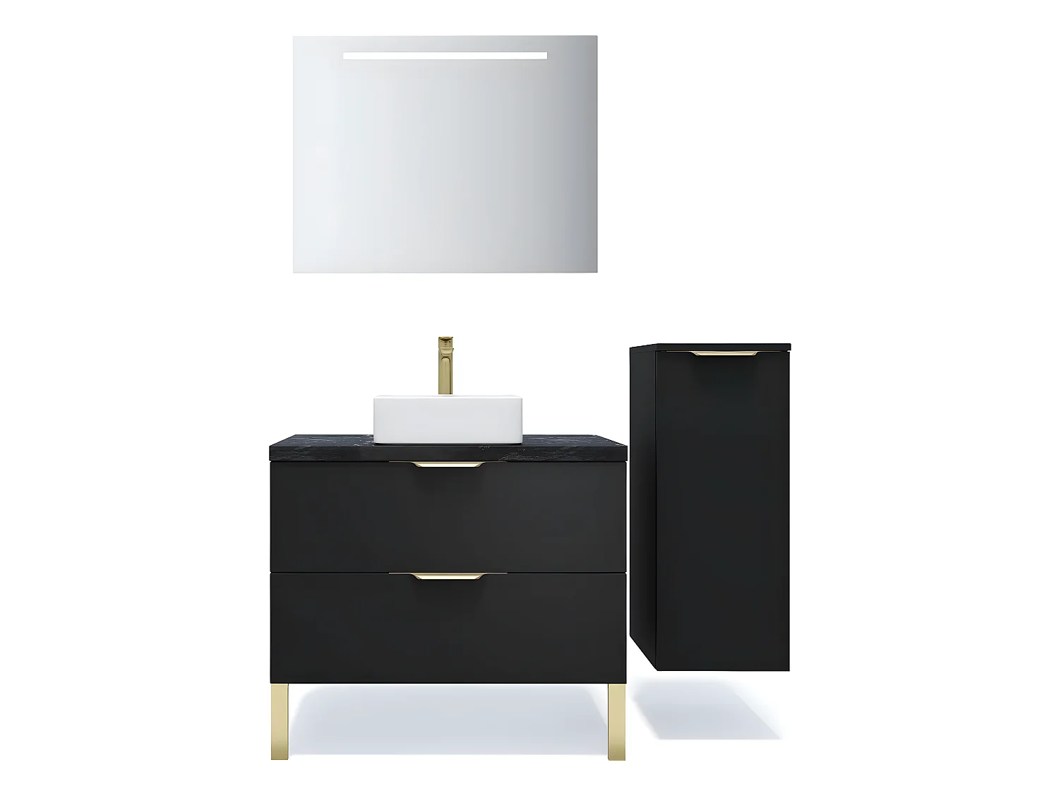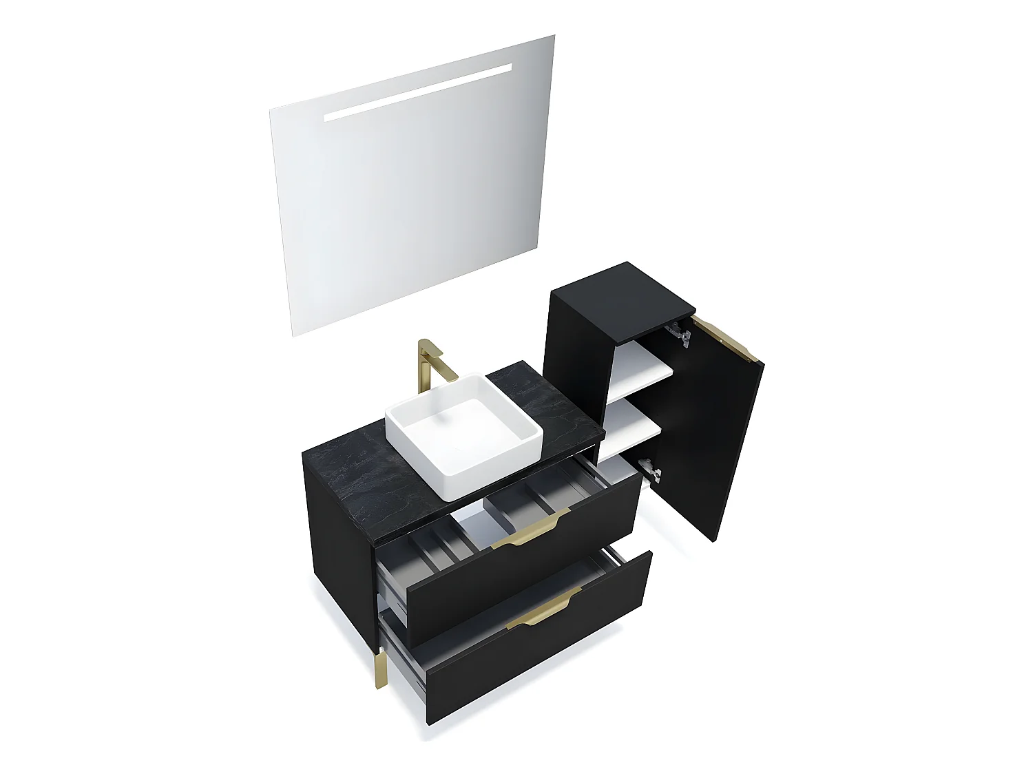 Meuble de salle de bain suspendu vasque à poser 90cm 2 tiroirs Noir + miroir + colonne ouverture droite - Venice