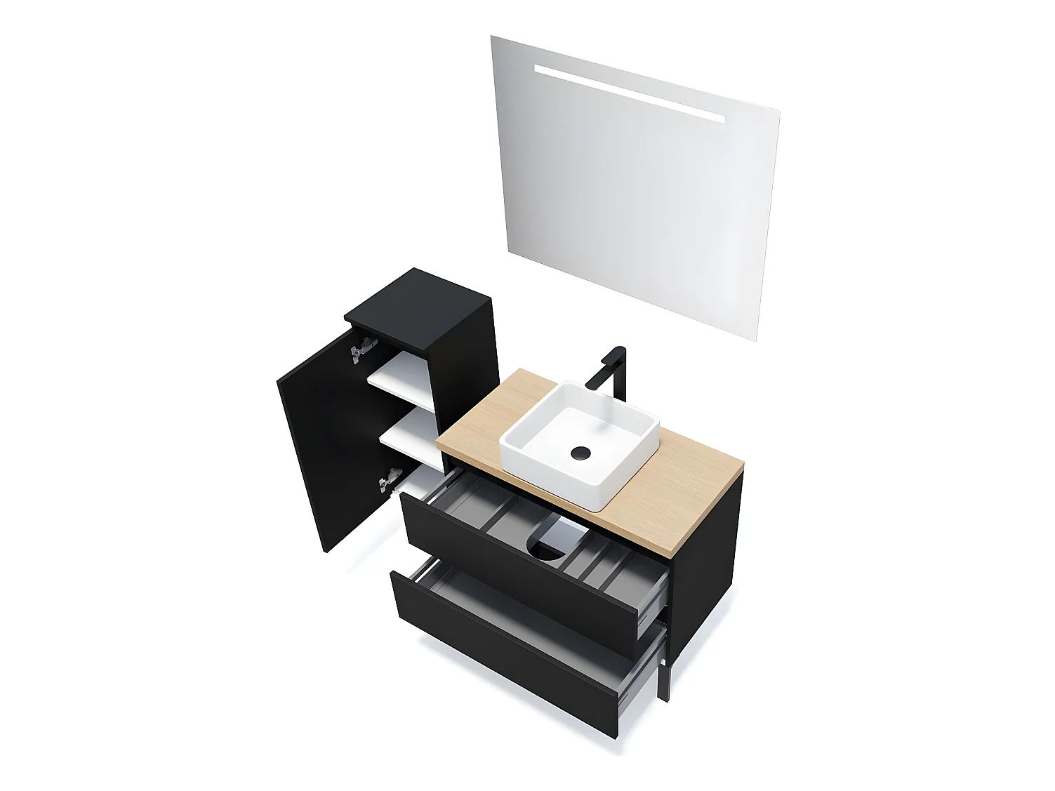 Meuble de salle de bain suspendu vasque à poser 90cm 2 tiroirs Noir + miroir + colonne ouverture gauche - Hudson