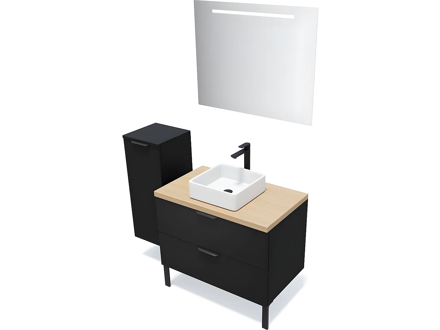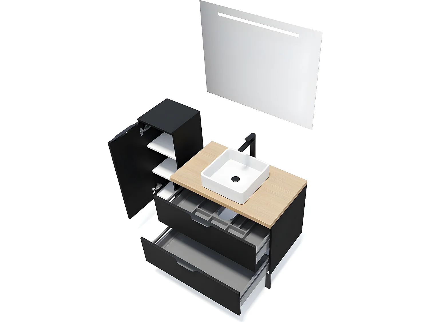 Meuble de salle de bain suspendu vasque à poser 90cm 2 tiroirs Noir + miroir + colonne ouverture gauche - Soho