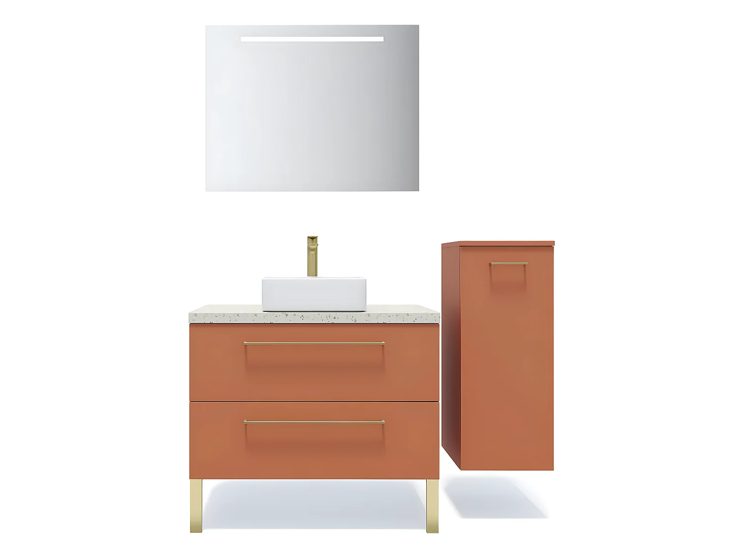 Meuble de salle de bain suspendu vasque à poser 90cm 2 tiroirs Terracotta + miroir + colonne ouverture droite - Glasgow