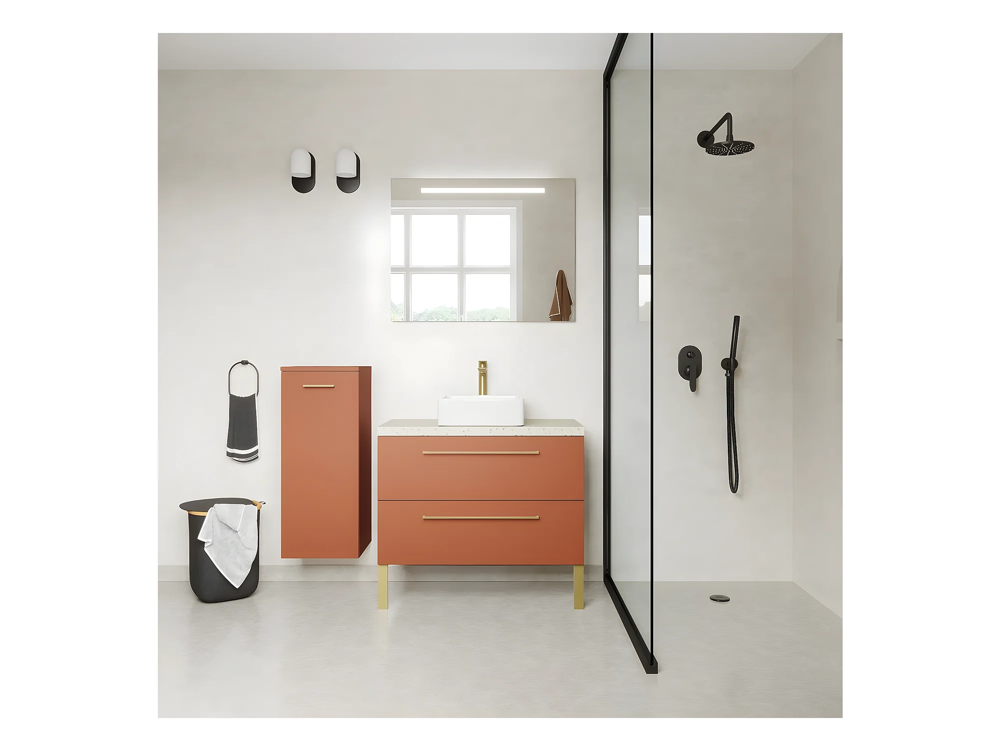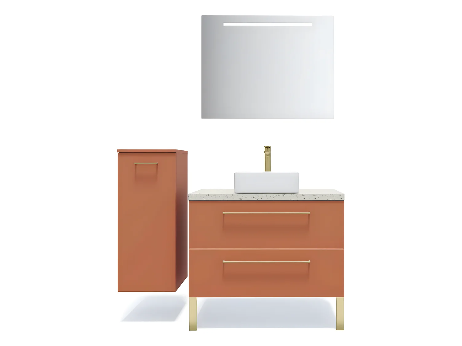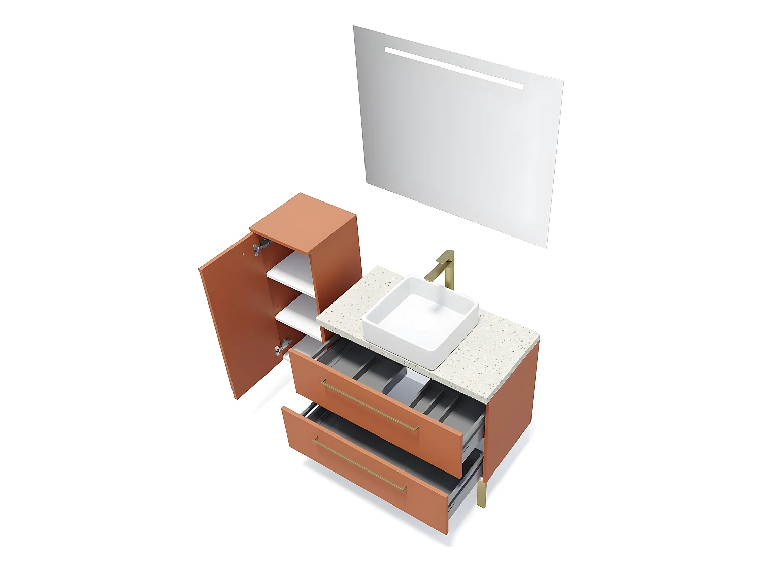 Meuble de salle de bain suspendu vasque à poser 90cm 2 tiroirs Terracotta + miroir + colonne ouverture gauche - Glasgow