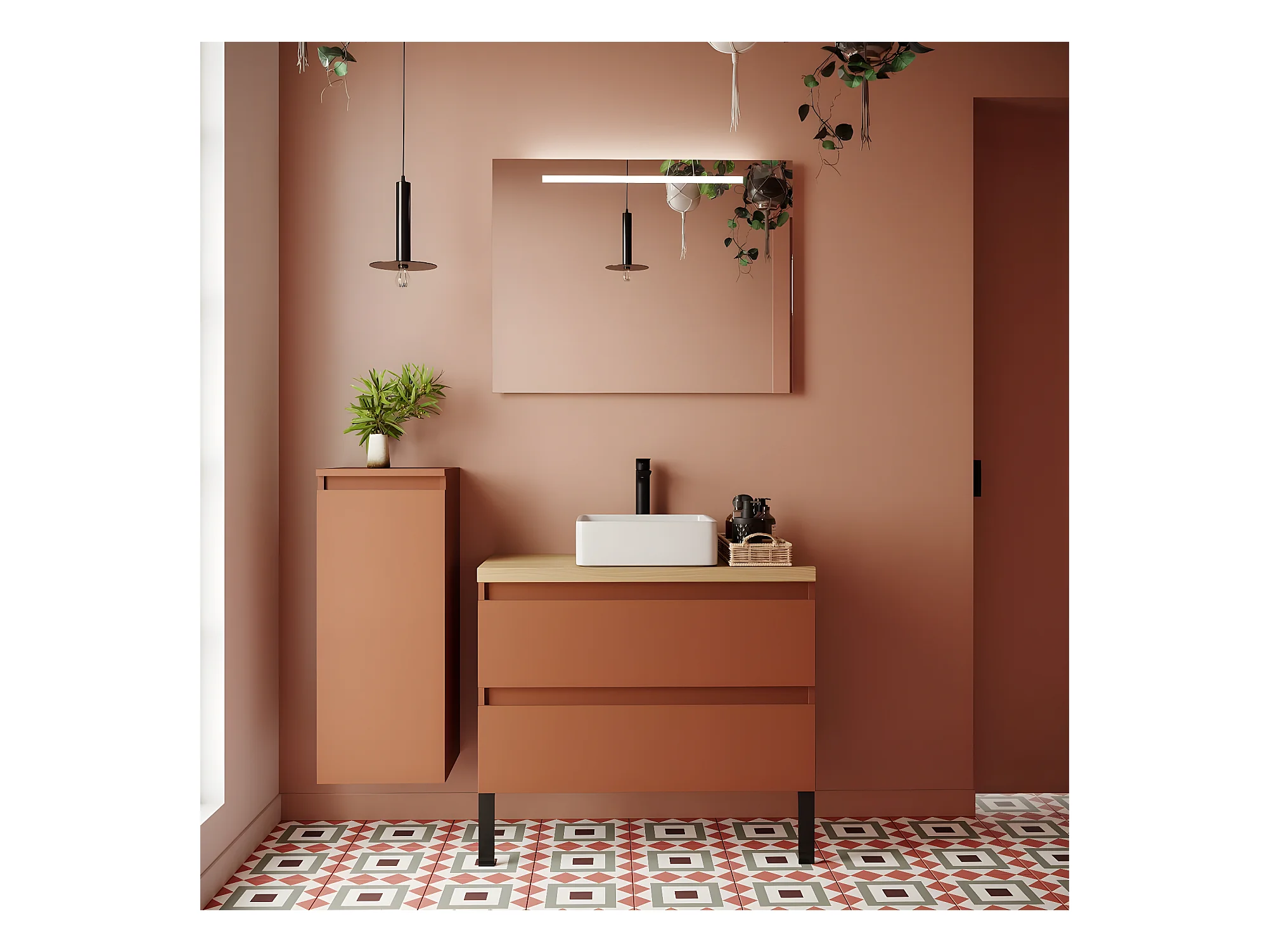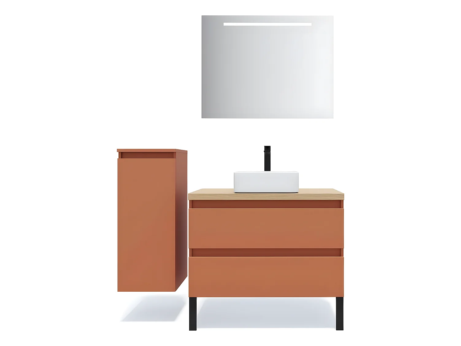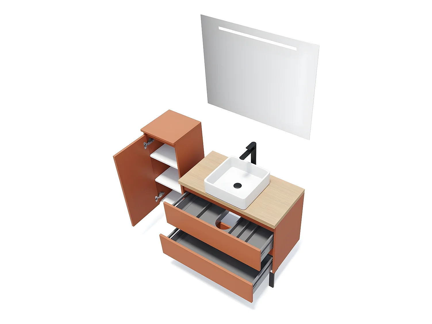 Meuble de salle de bain suspendu vasque à poser 90cm 2 tiroirs Terracotta + miroir + colonne ouverture gauche - Hudson
