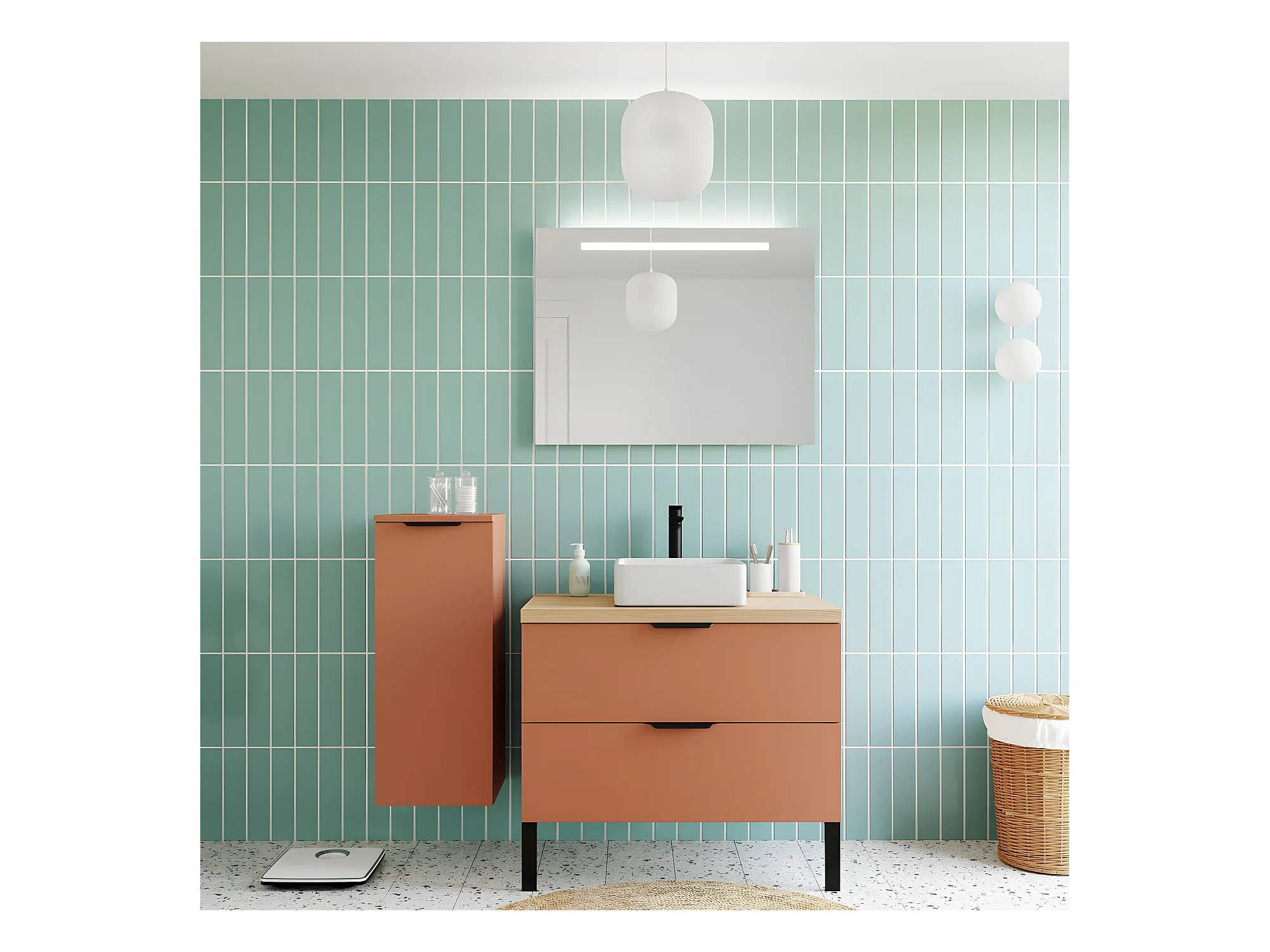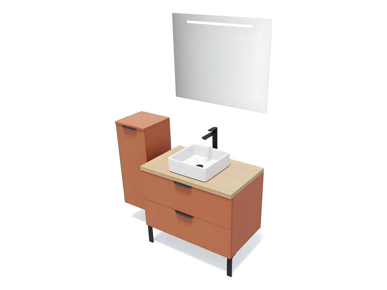 Meuble de salle de bain suspendu vasque à poser 90cm 2 tiroirs Terracotta + miroir + colonne ouverture gauche - Soho