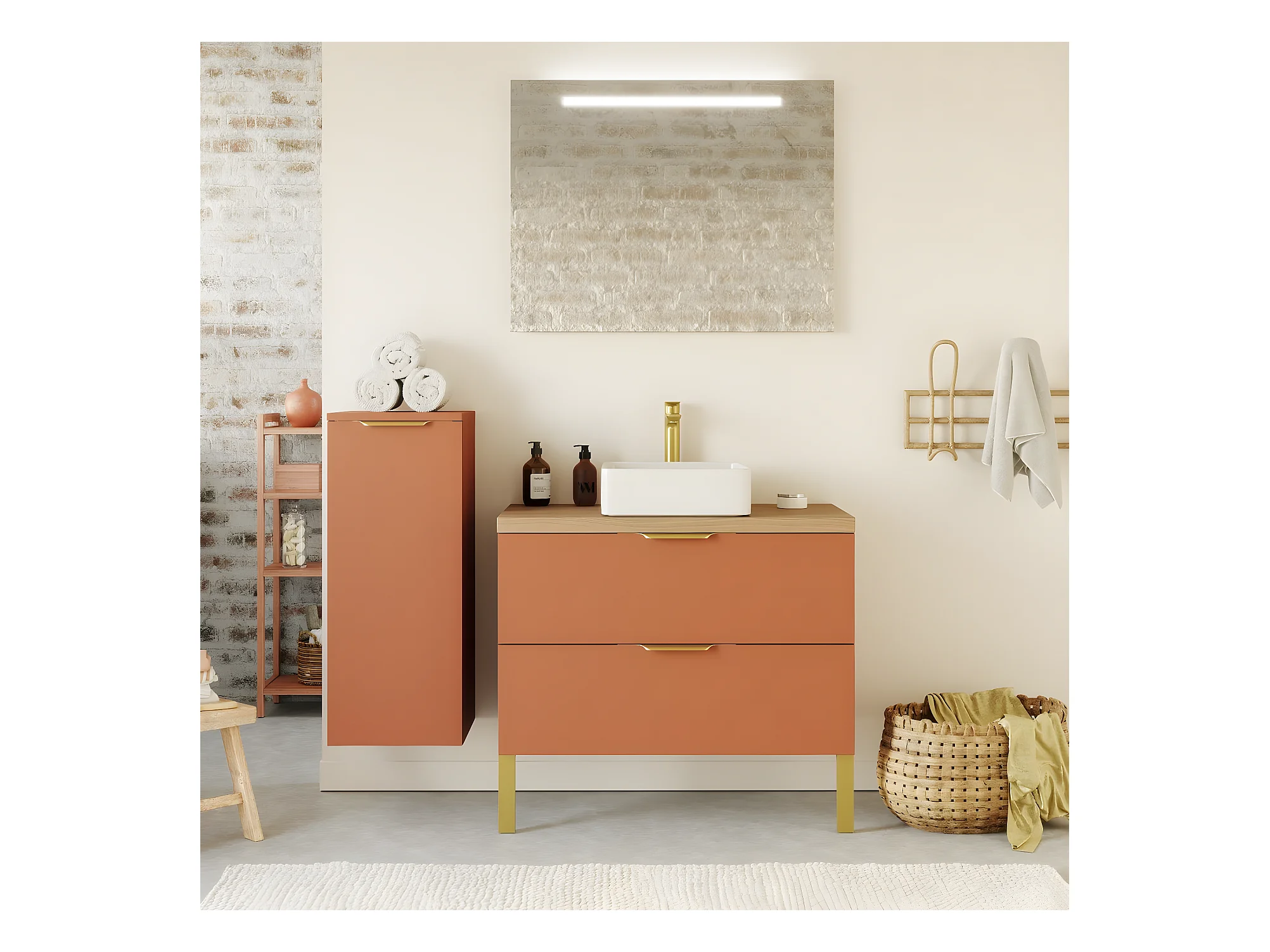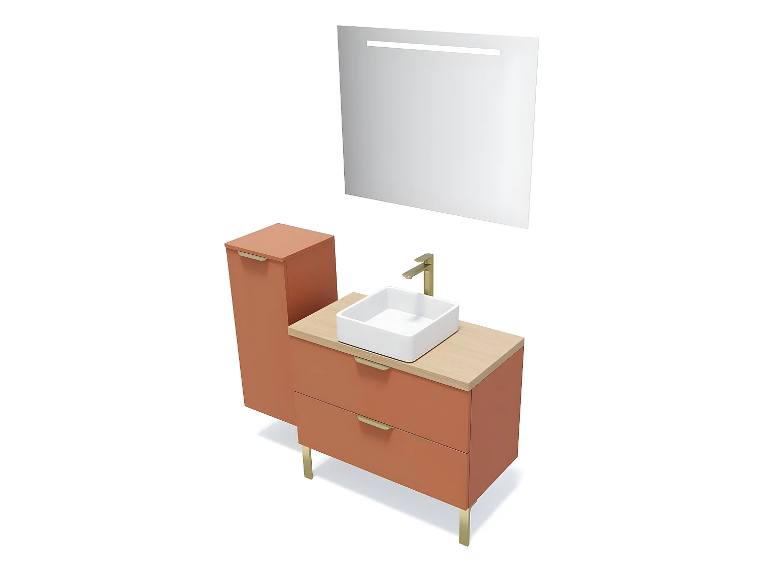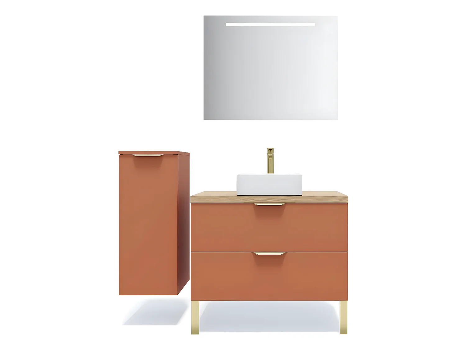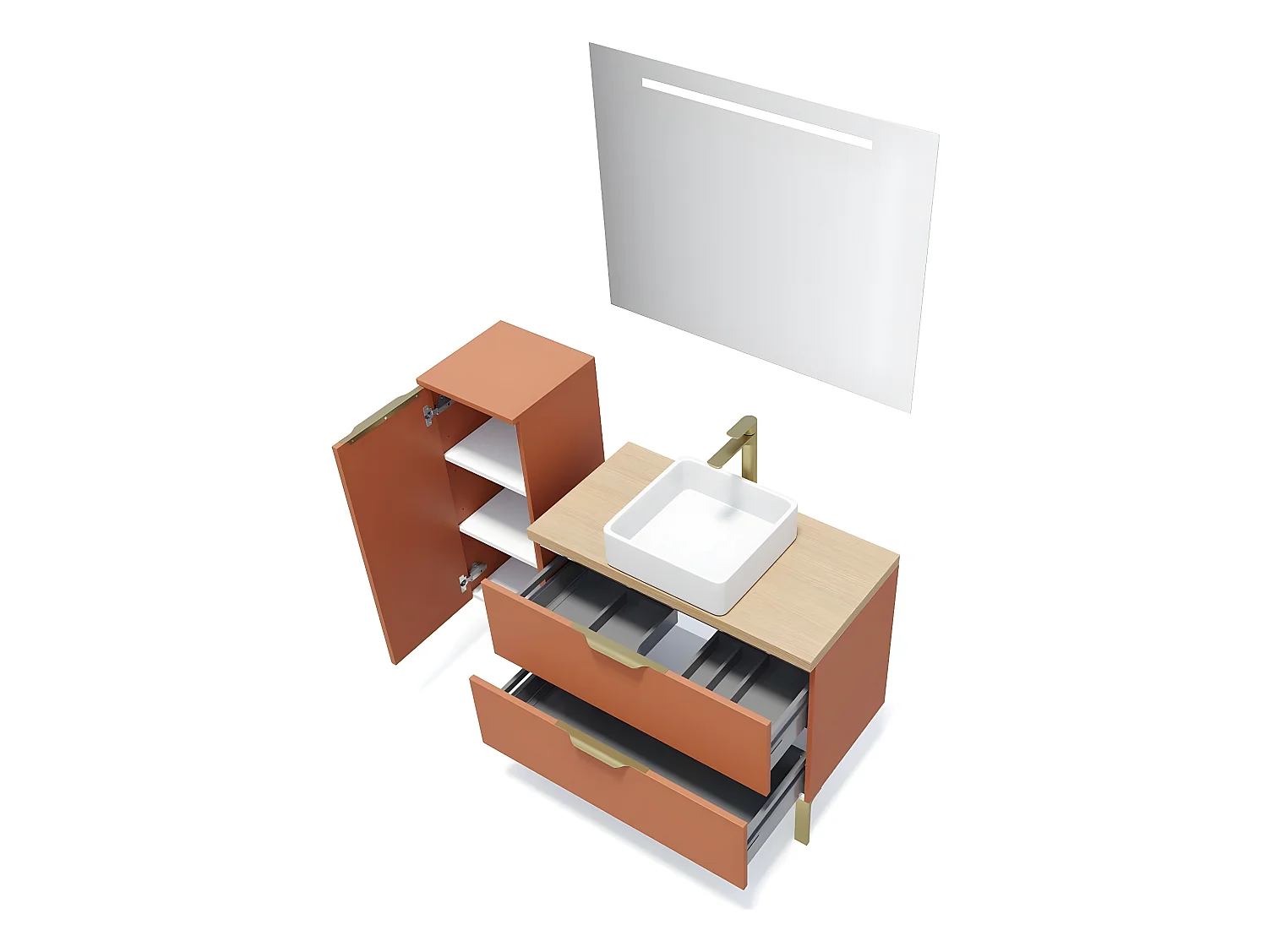 Meuble de salle de bain suspendu vasque à poser 90cm 2 tiroirs Terracotta + miroir + colonne ouverture gauche - Venice