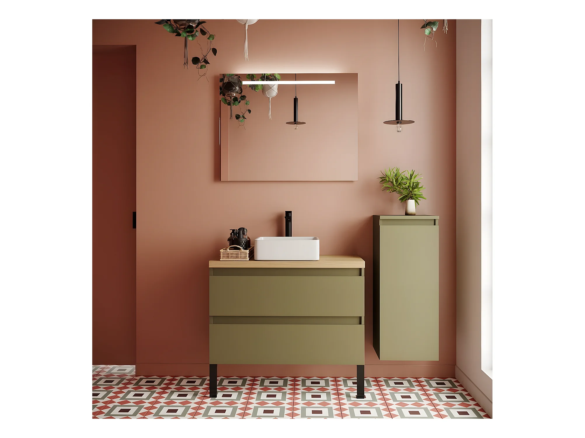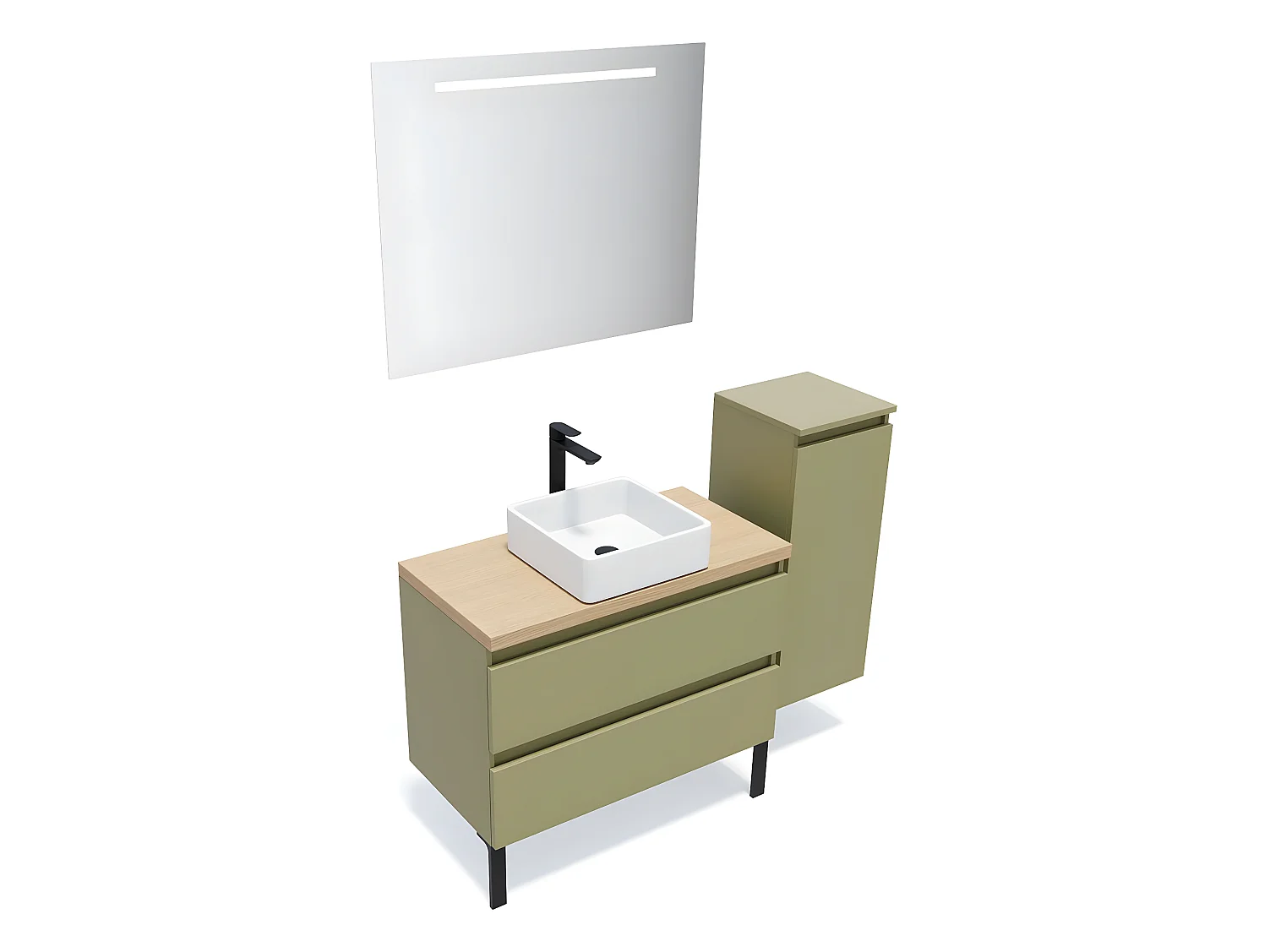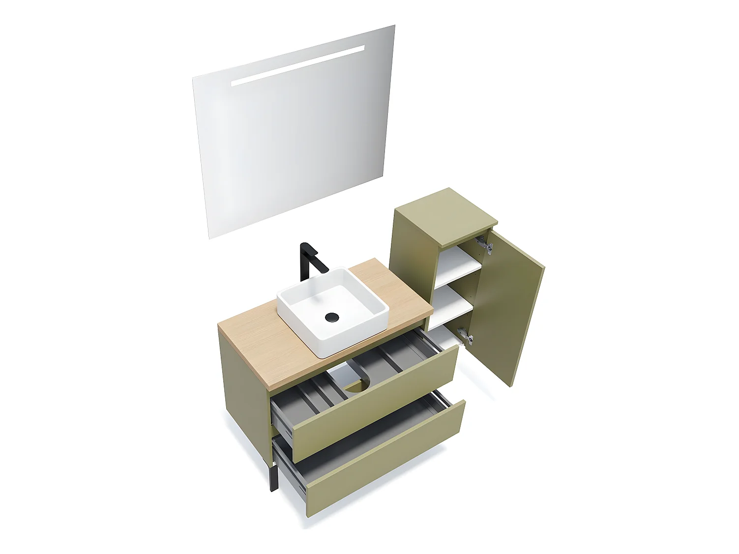 Meuble de salle de bain suspendu vasque à poser 90cm 2 tiroirs Vert olive + miroir + colonne ouverture droite - Hudson