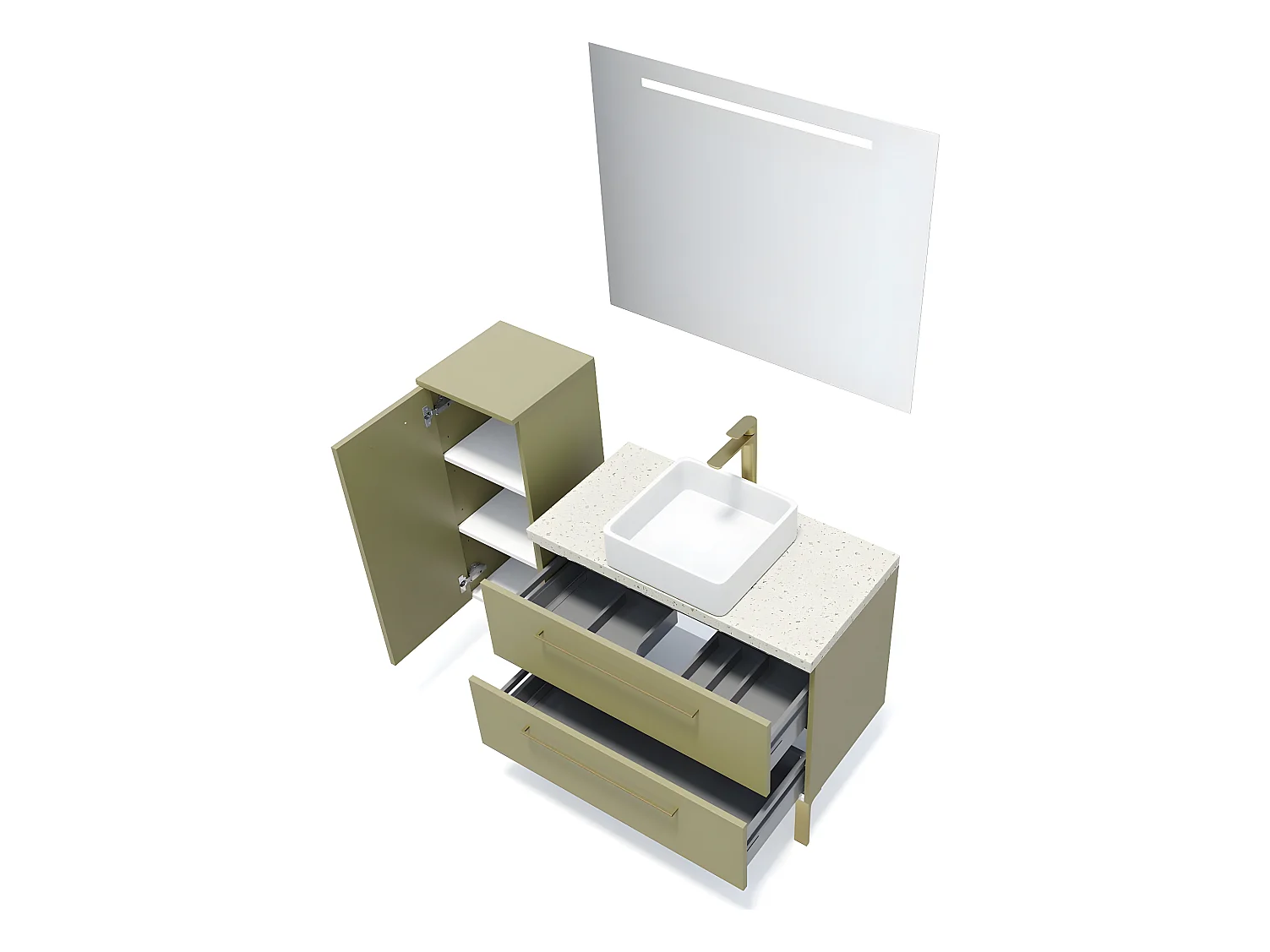 Meuble de salle de bain suspendu vasque à poser 90cm 2 tiroirs Vert olive + miroir + colonne ouverture gauche - Glasgow