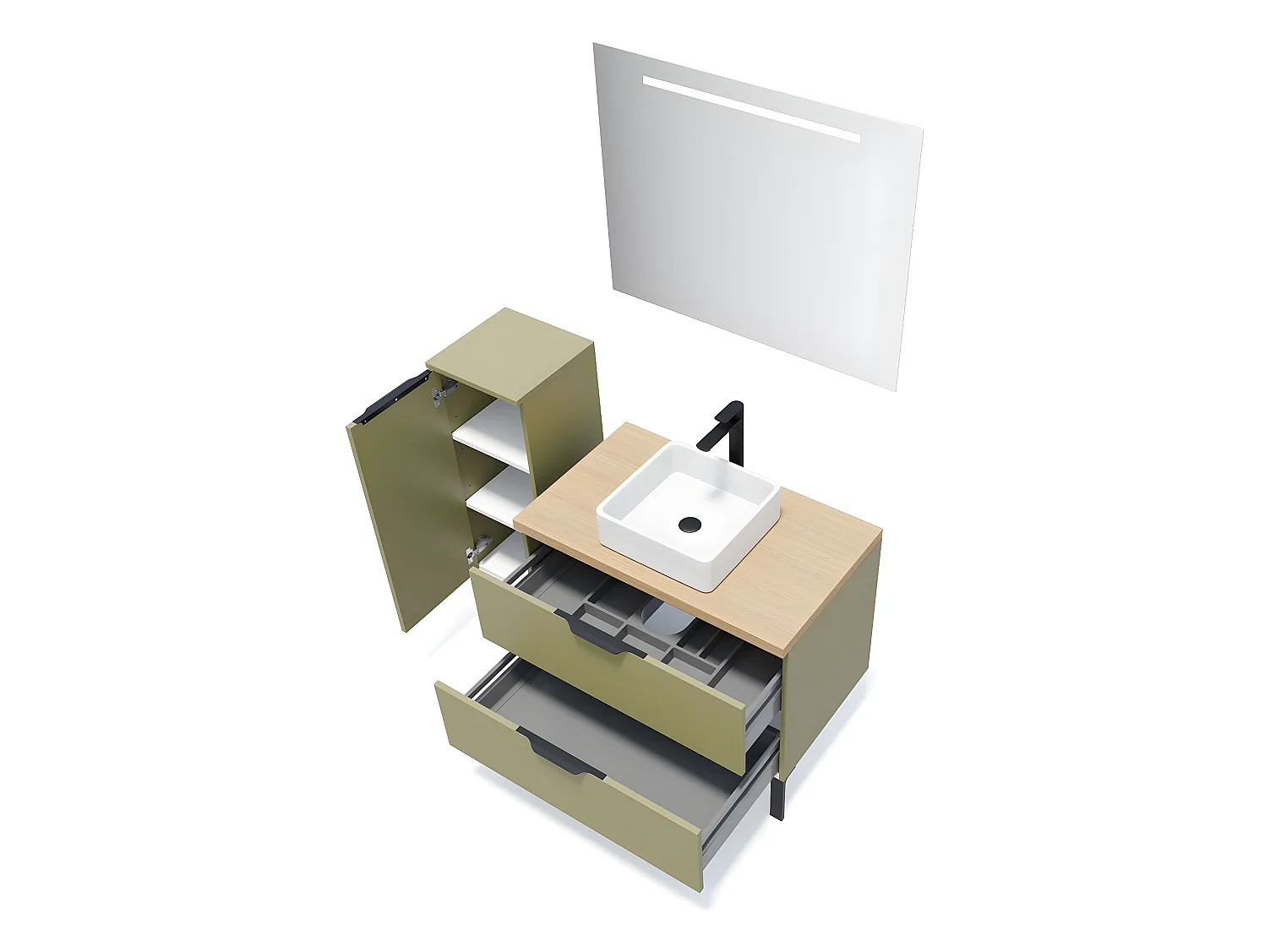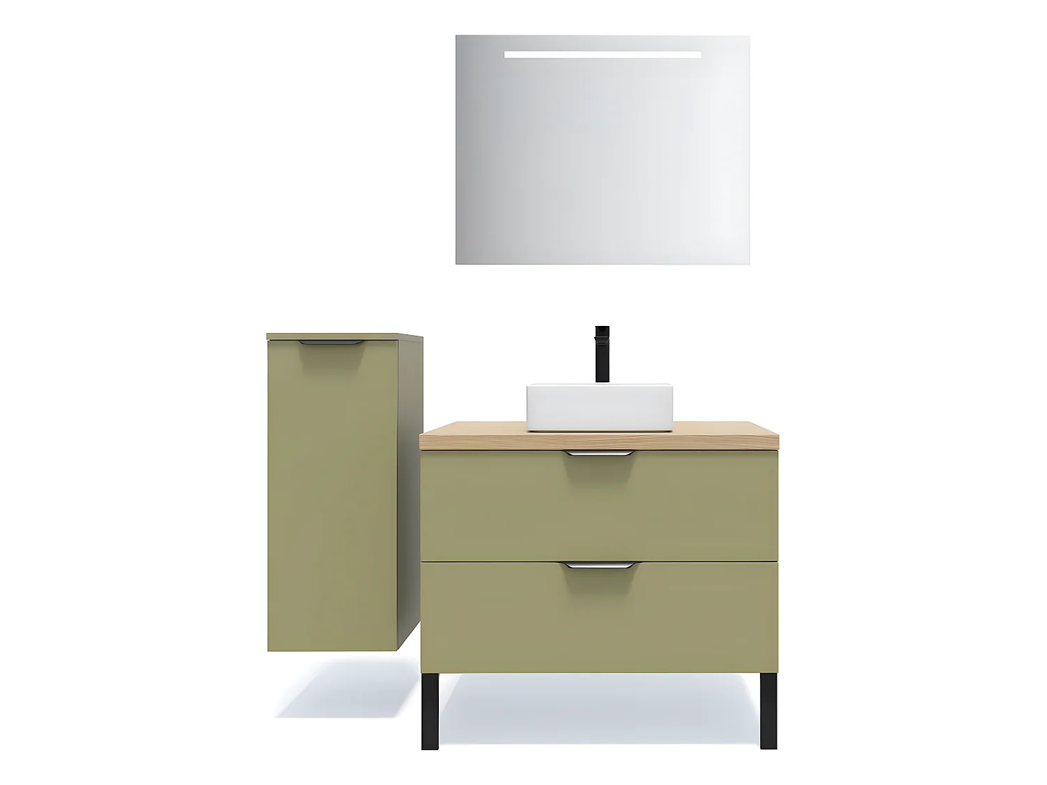 Meuble de salle de bain suspendu vasque à poser 90cm 2 tiroirs Vert olive + miroir + colonne ouverture gauche - Soho