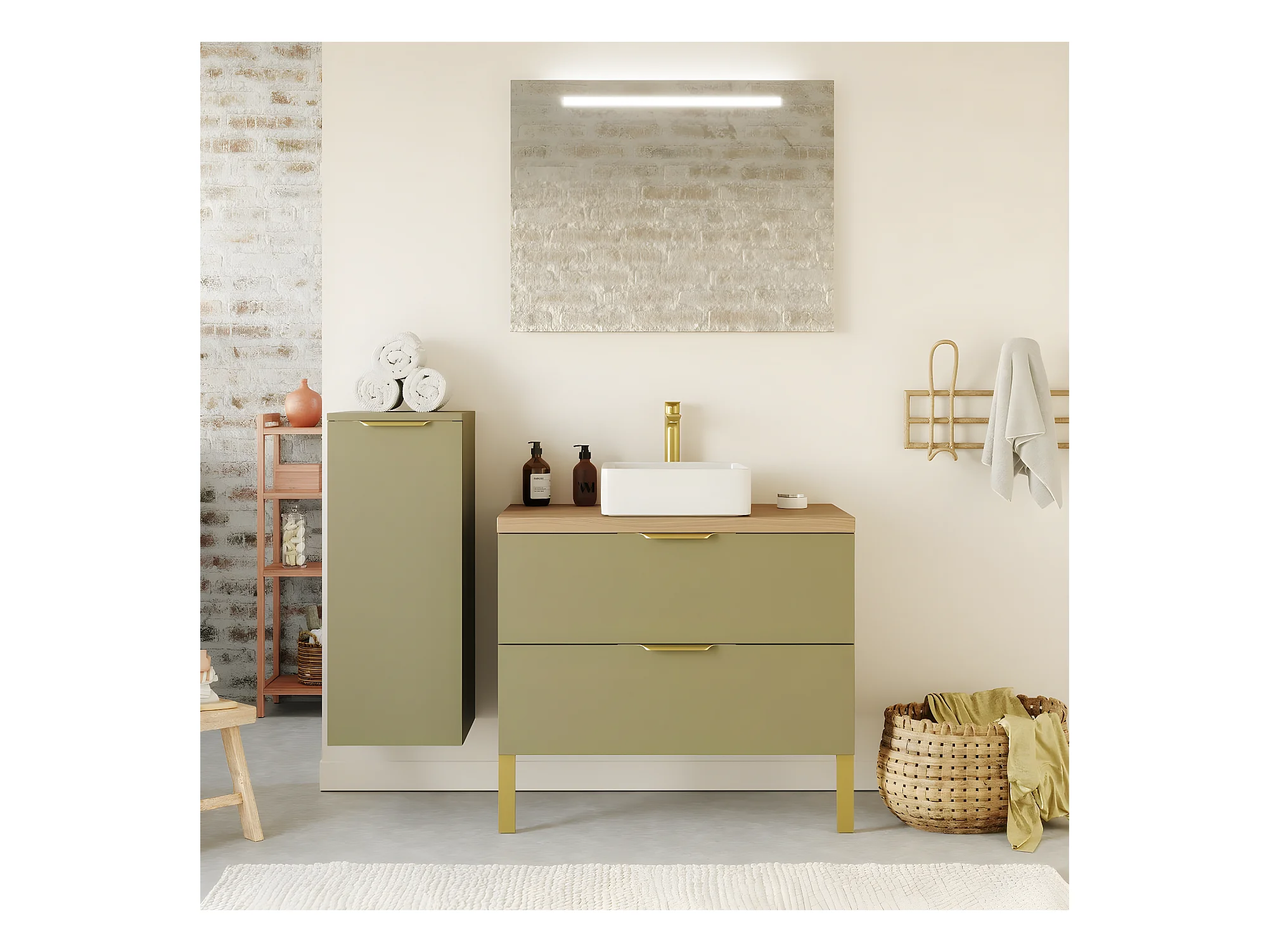 Meuble de salle de bain suspendu vasque à poser 90cm 2 tiroirs Vert olive + miroir + colonne ouverture gauche - Venice