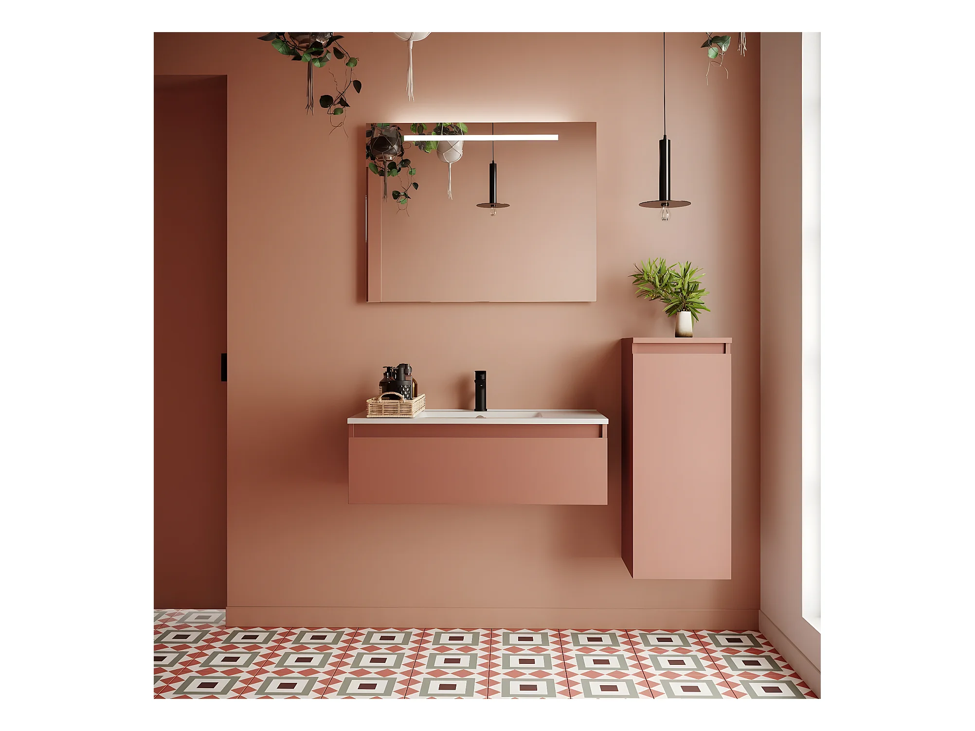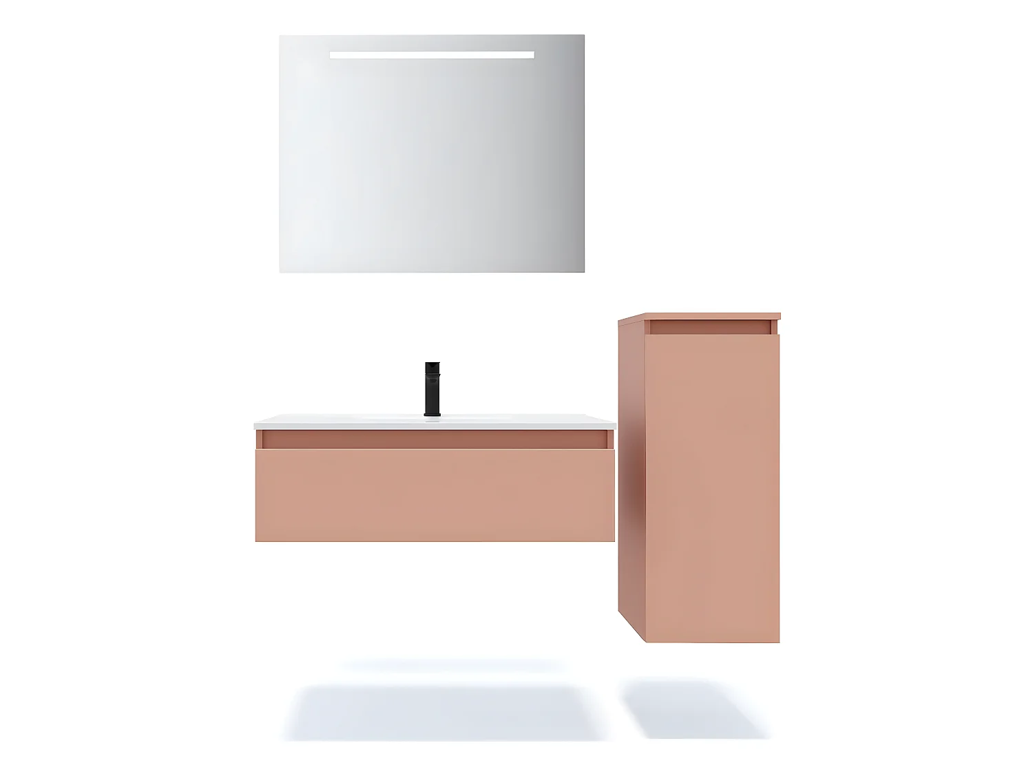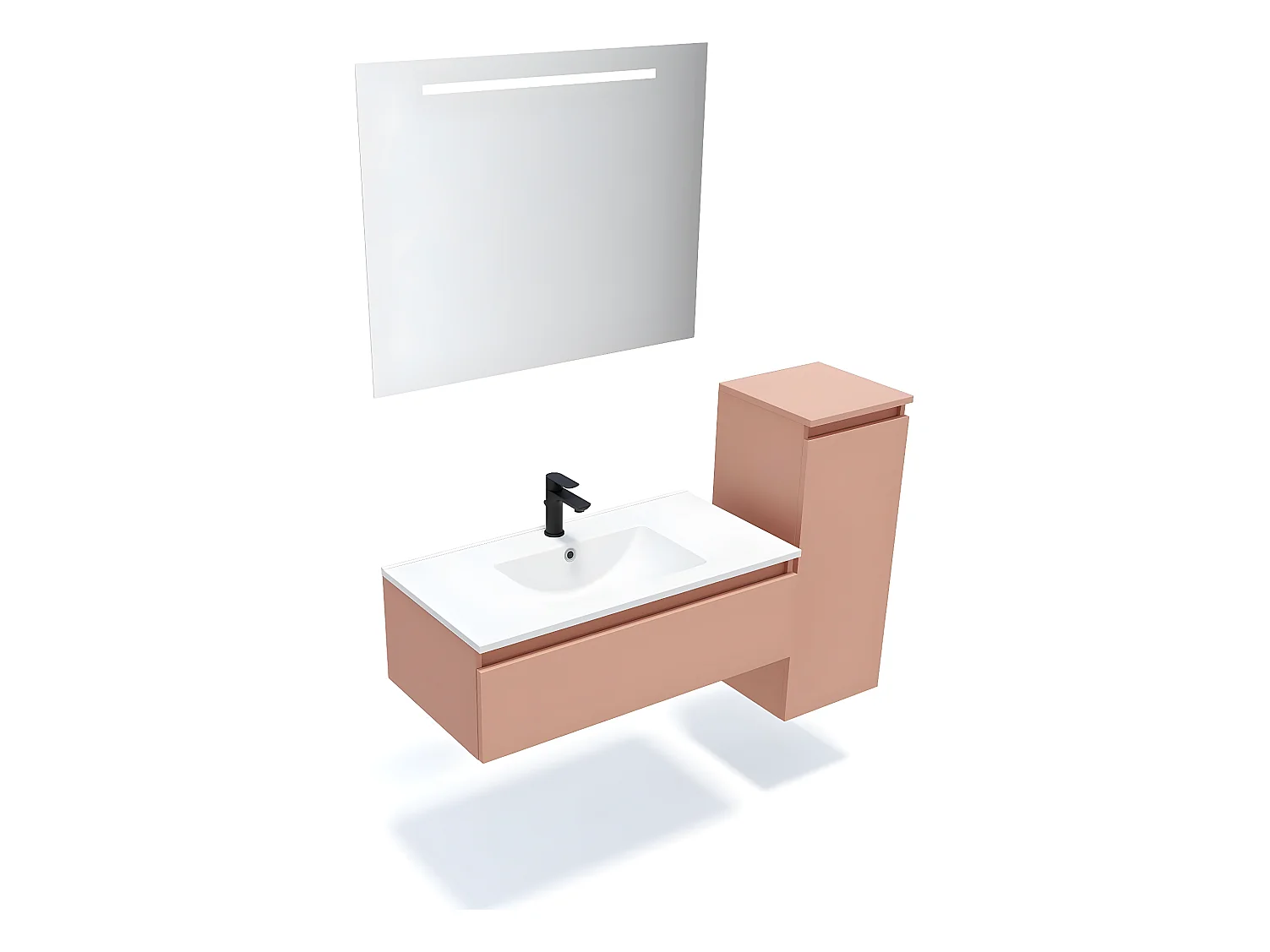 Meuble de salle de bain suspendu vasque intégrée 90cm 1 tiroir Abricot + miroir + colonne ouverture droite - Hudson