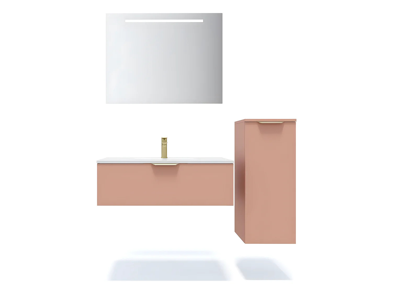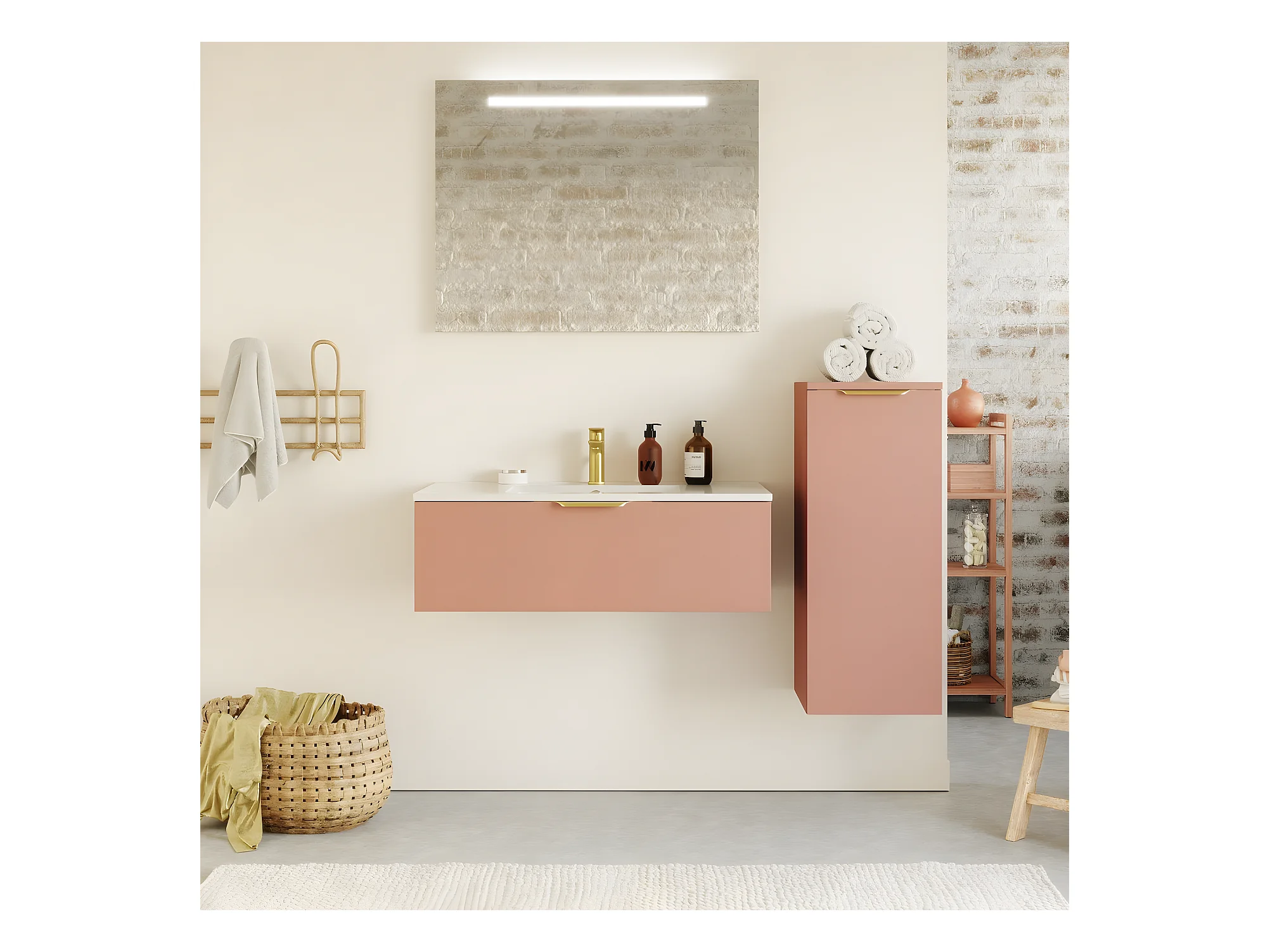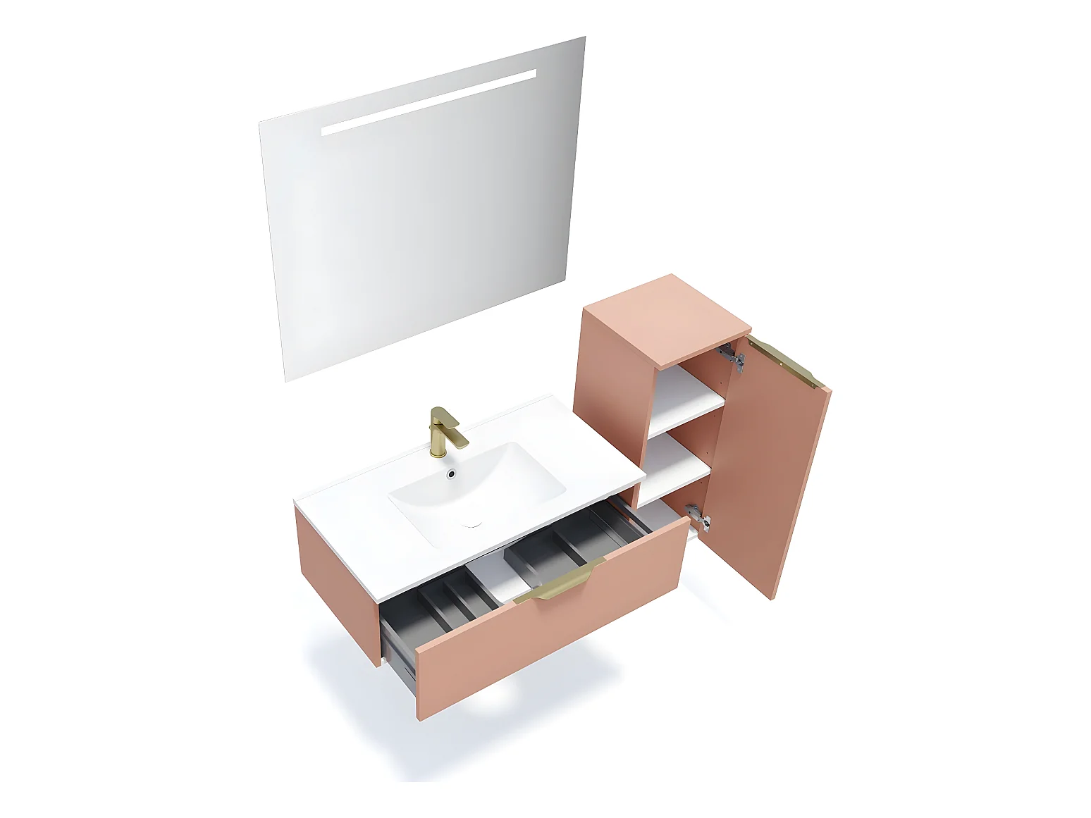 Meuble de salle de bain suspendu vasque intégrée 90cm 1 tiroir Abricot + miroir + colonne ouverture droite - Venice