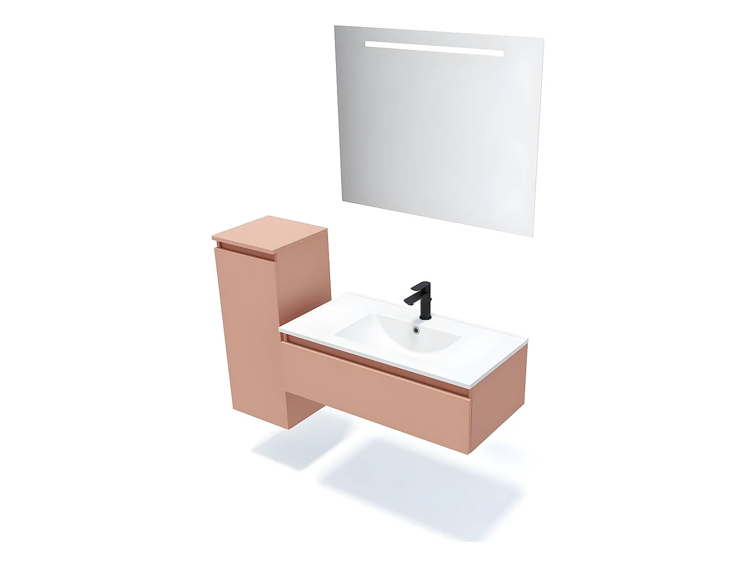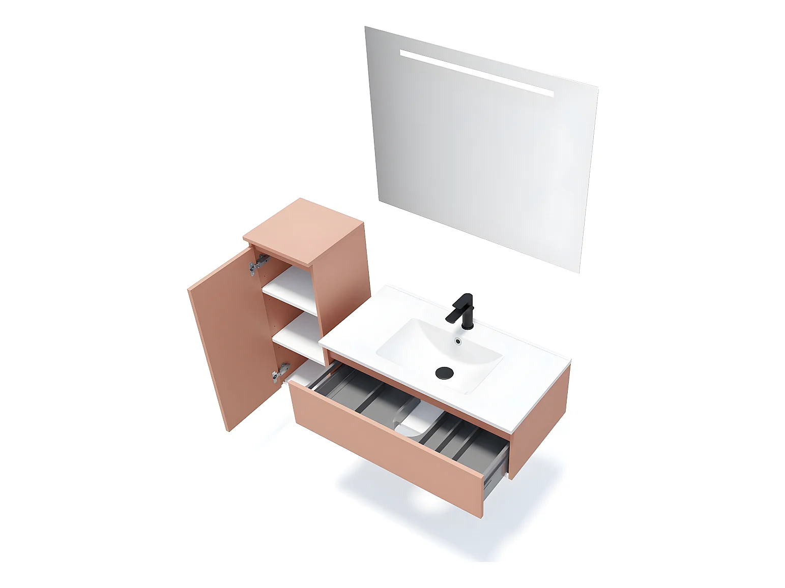 Meuble de salle de bain suspendu vasque intégrée 90cm 1 tiroir Abricot + miroir + colonne ouverture gauche - Hudson