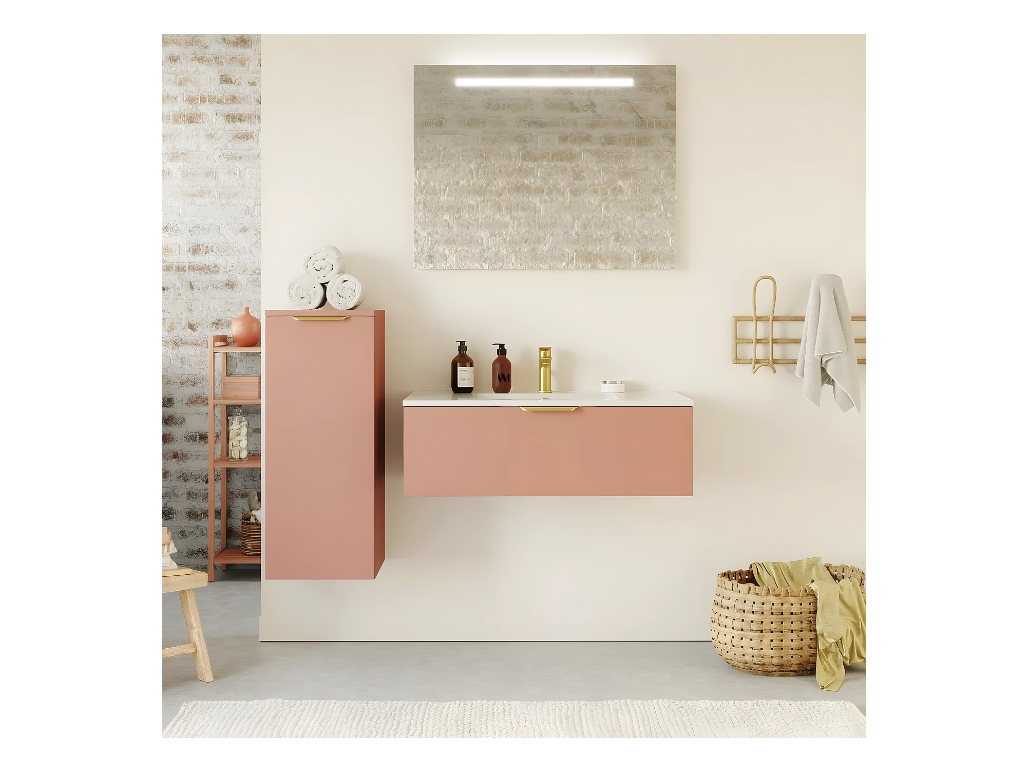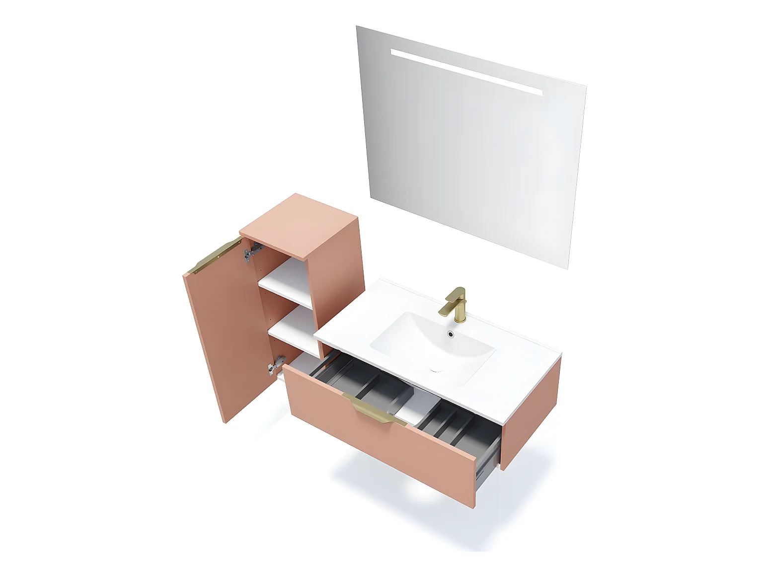 Meuble de salle de bain suspendu vasque intégrée 90cm 1 tiroir Abricot + miroir + colonne ouverture gauche - Venice