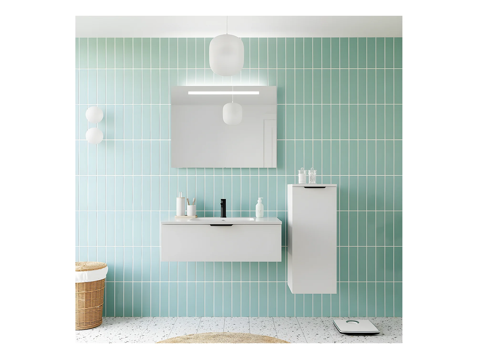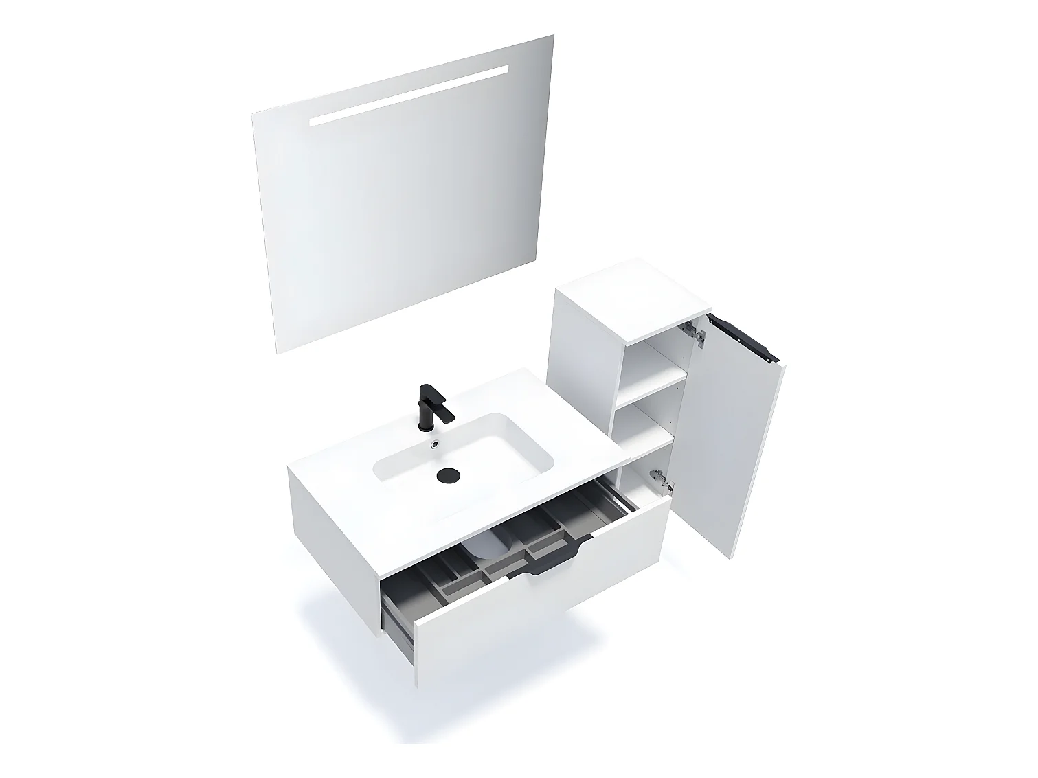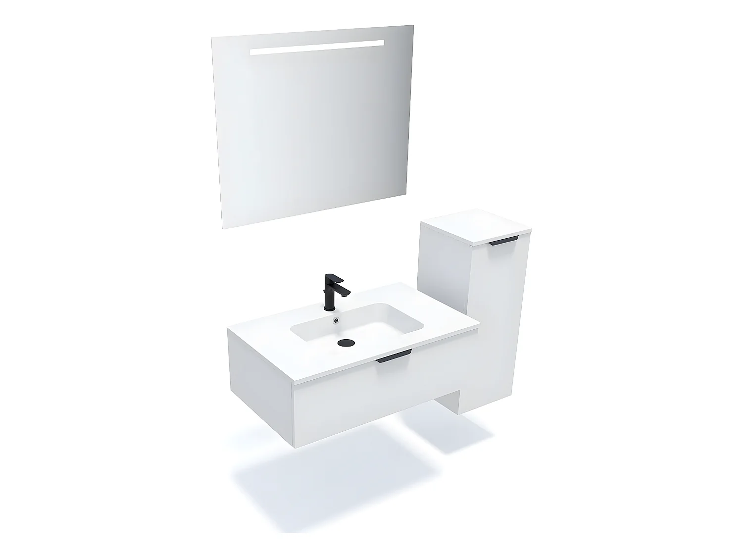 Meuble de salle de bain suspendu vasque intégrée 90cm 1 tiroir Blanc + miroir + colonne ouverture droite - Soho
