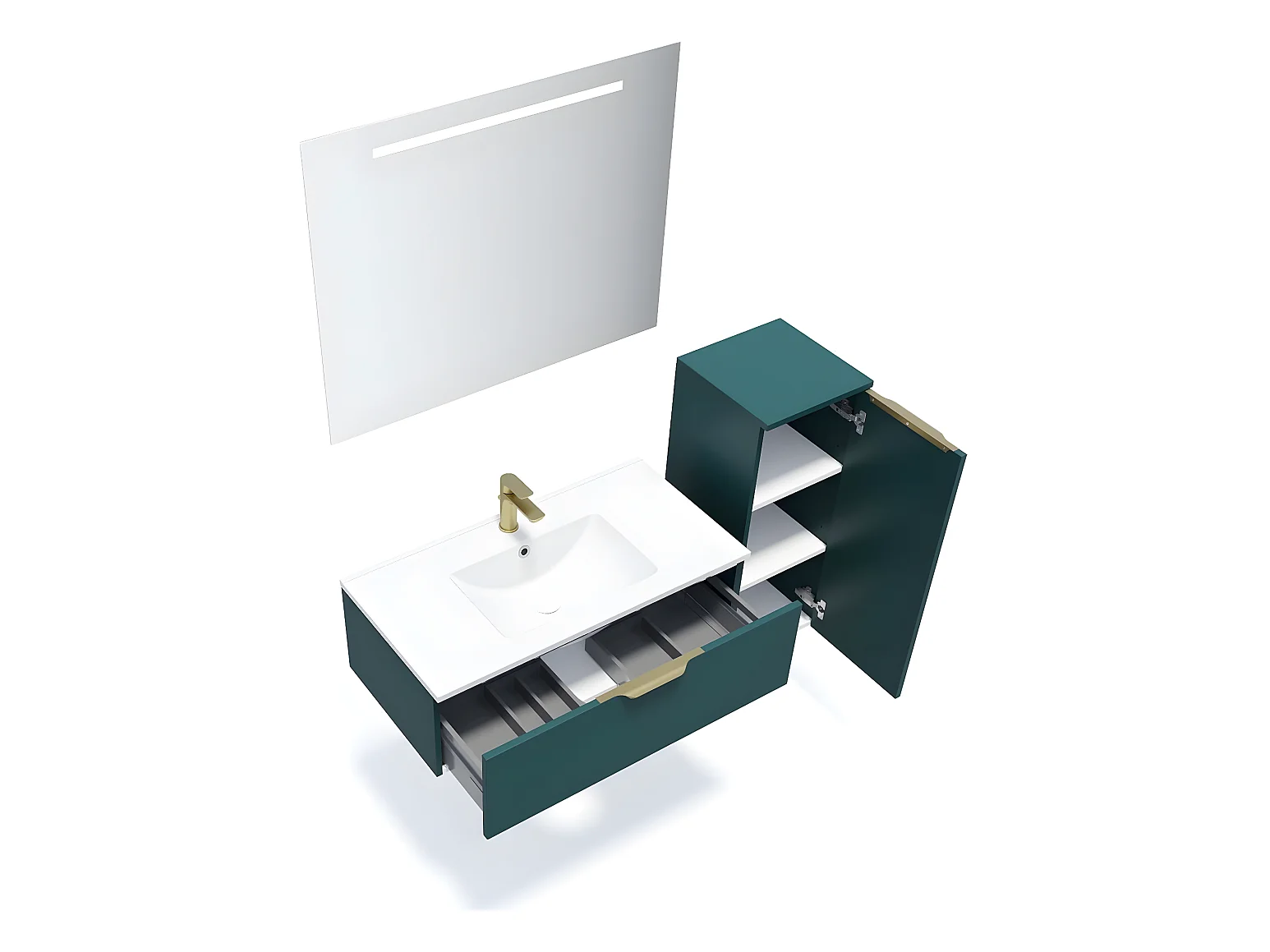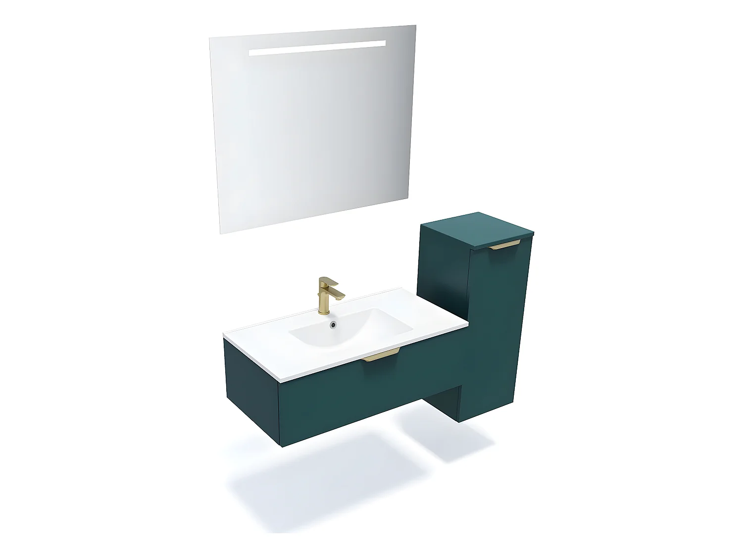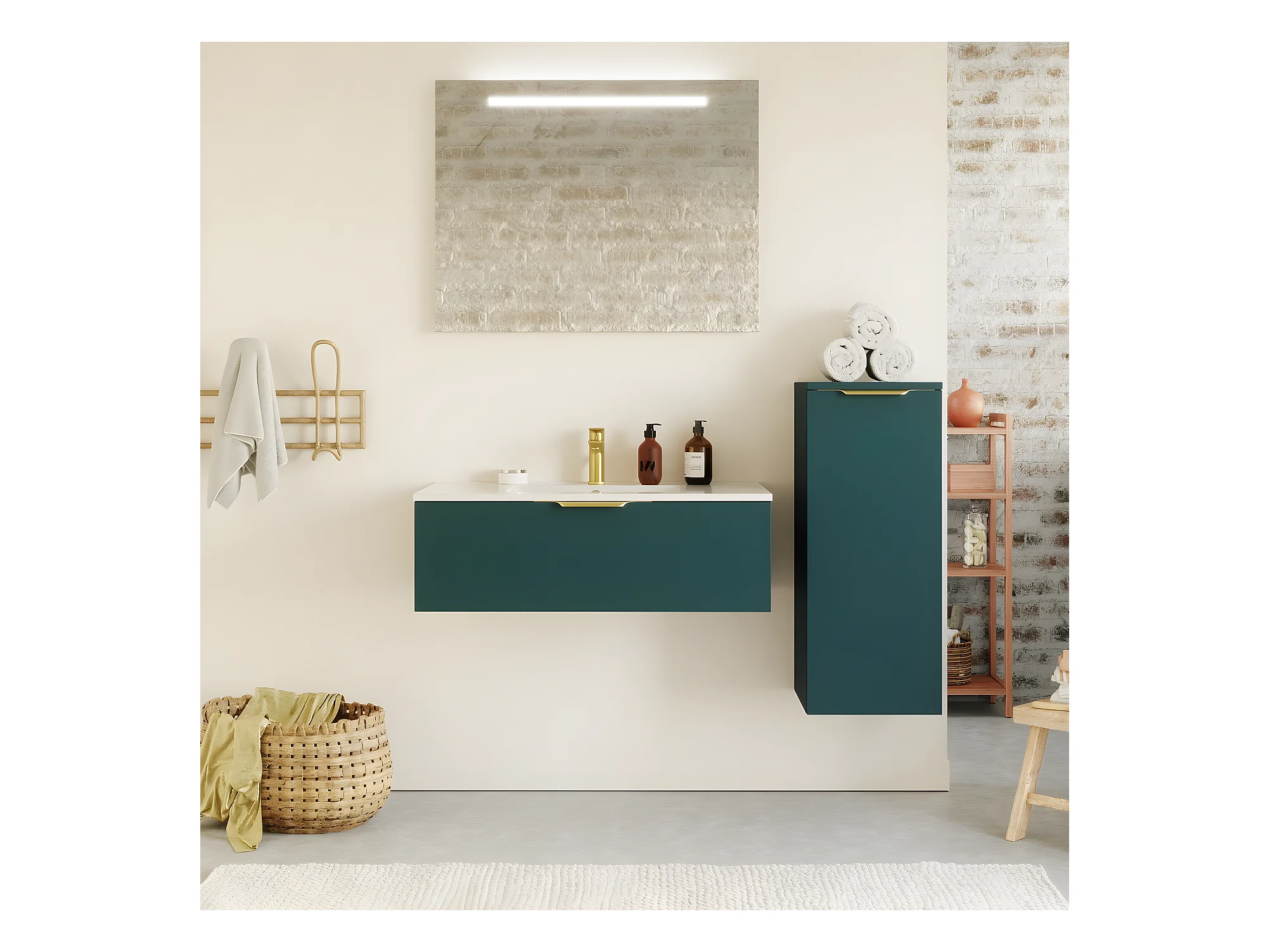 Meuble de salle de bain suspendu vasque intégrée 90cm 1 tiroir Bleu + miroir + colonne ouverture droite - Venice