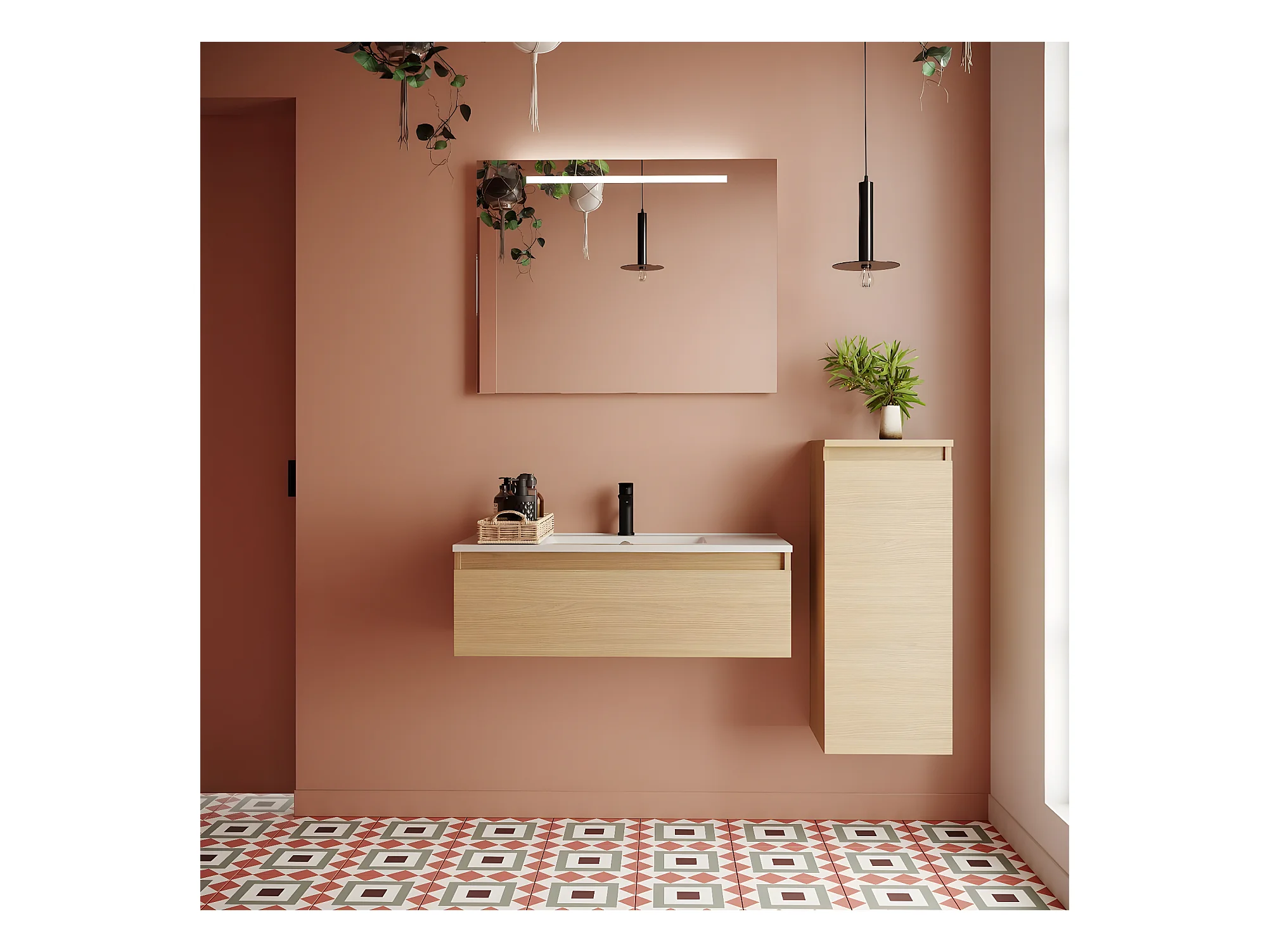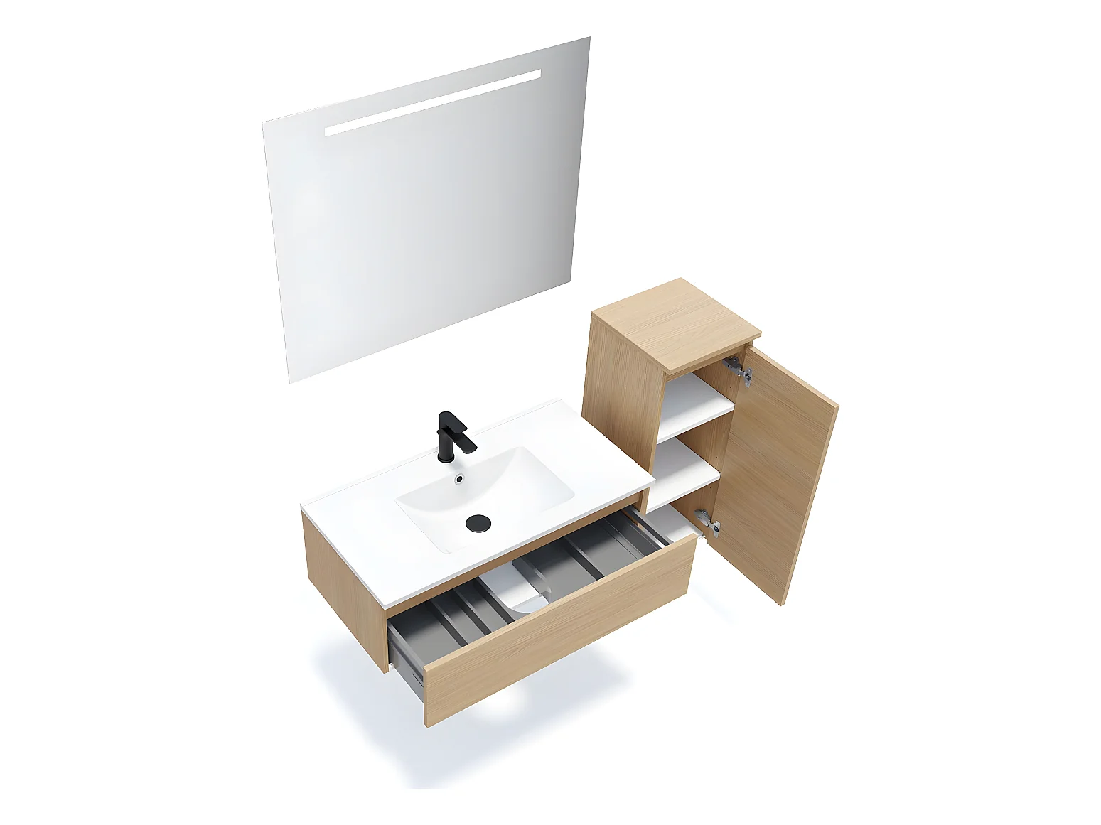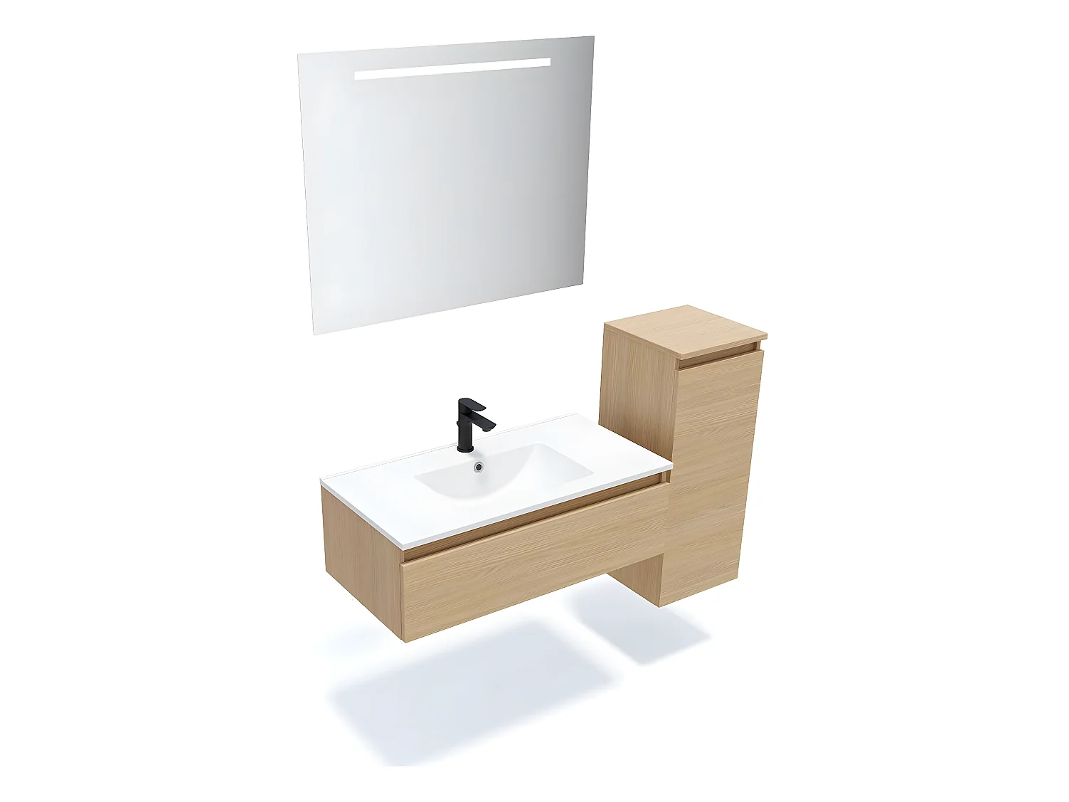 Meuble de salle de bain suspendu vasque intégrée 90cm 1 tiroir Chêne clair + miroir + colonne ouverture droite - Hudson