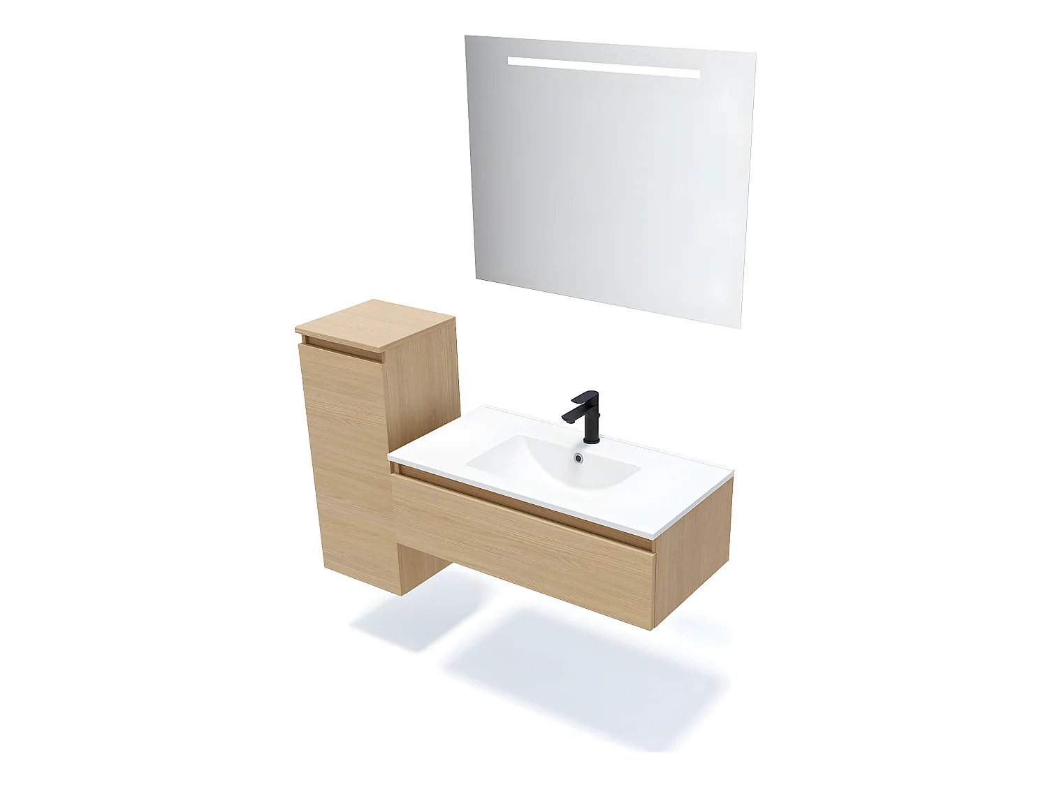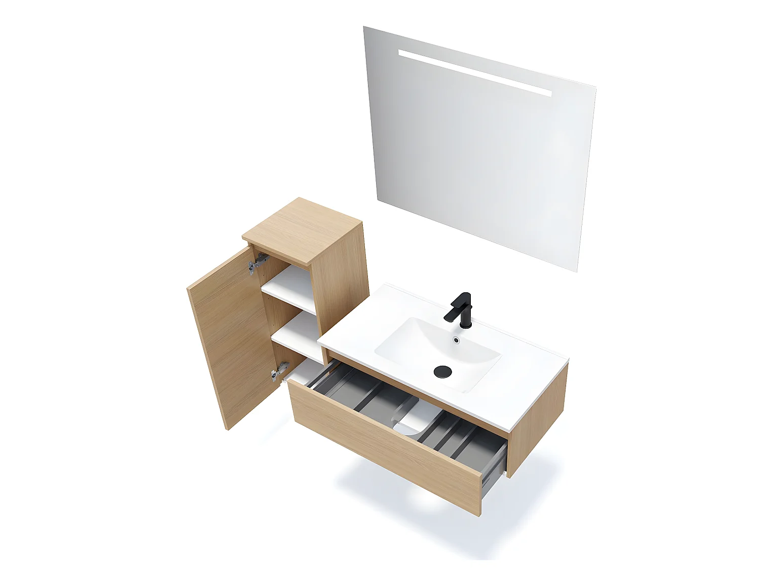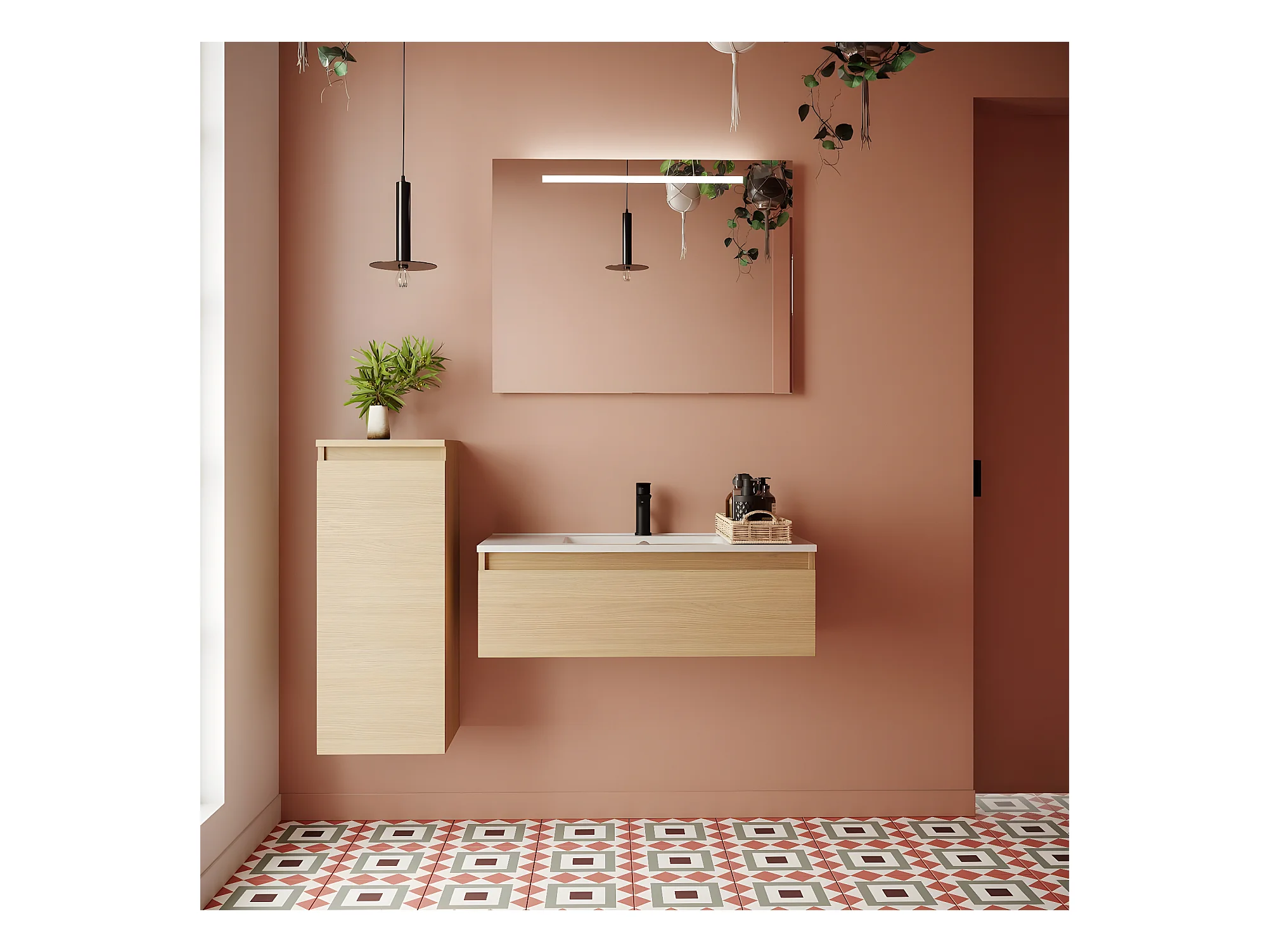 Meuble de salle de bain suspendu vasque intégrée 90cm 1 tiroir Chêne clair + miroir + colonne ouverture gauche - Hudson
