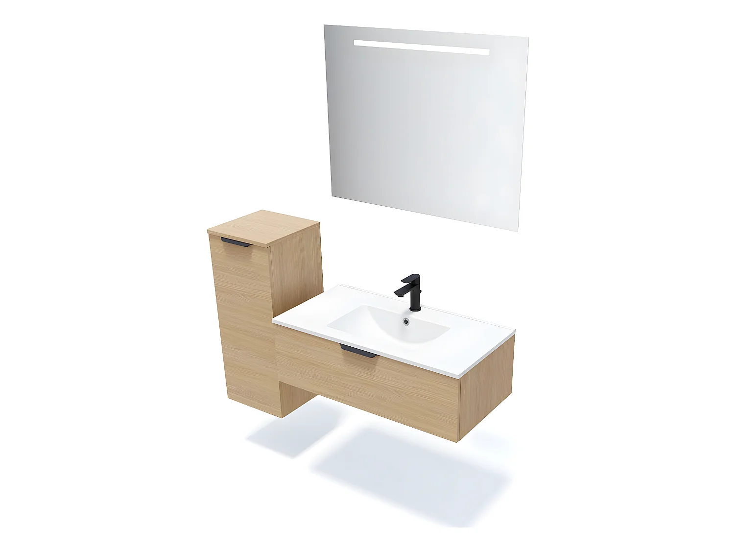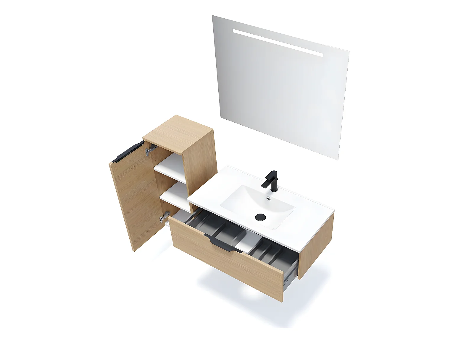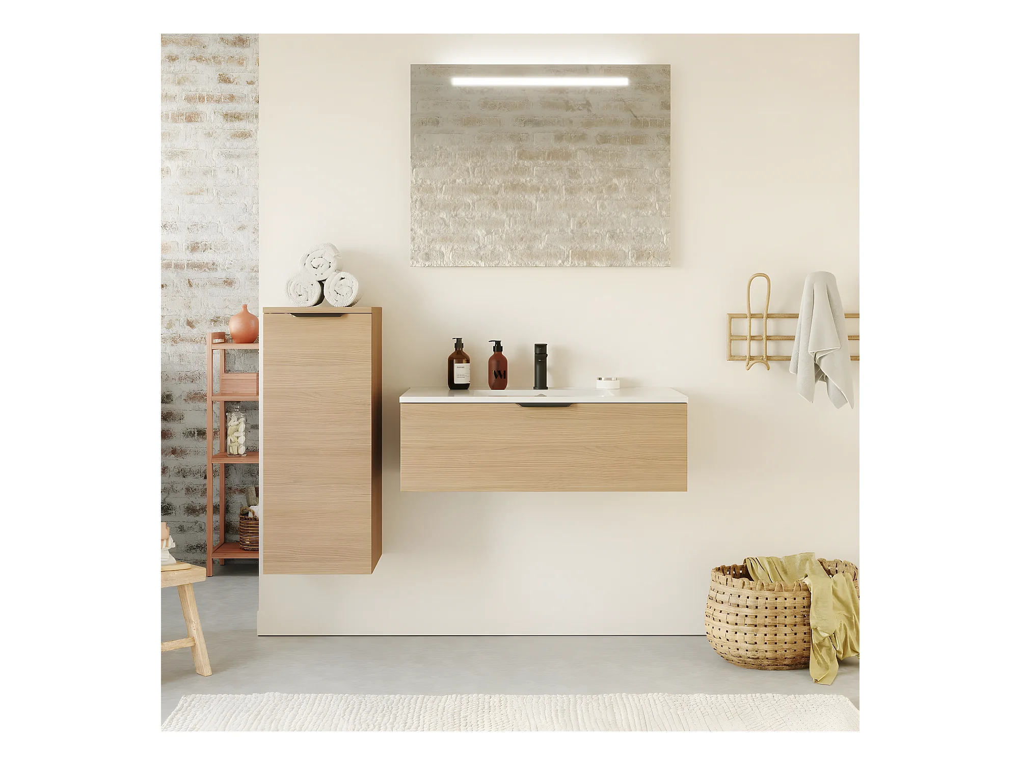 Meuble de salle de bain suspendu vasque intégrée 90cm 1 tiroir Chêne clair + miroir + colonne ouverture gauche - Venice