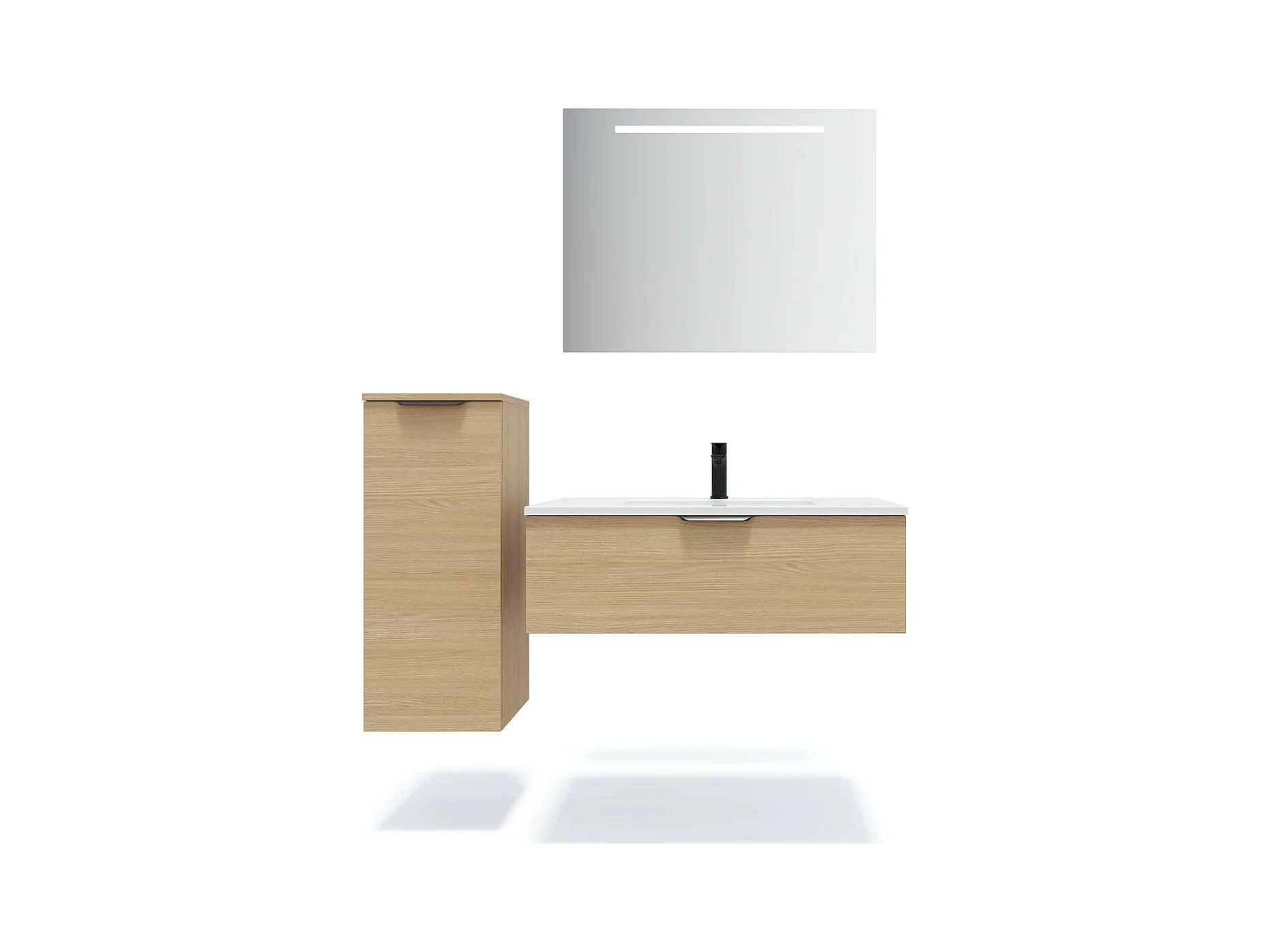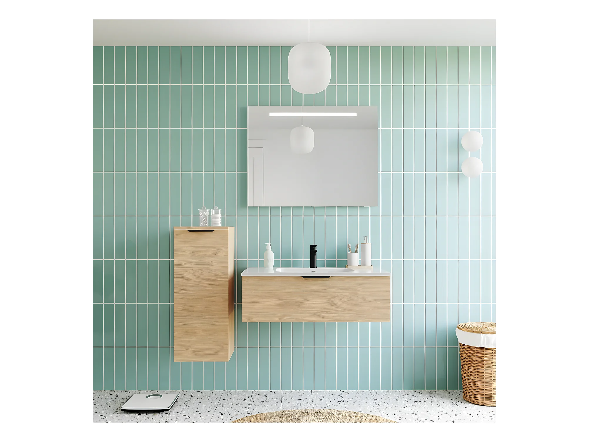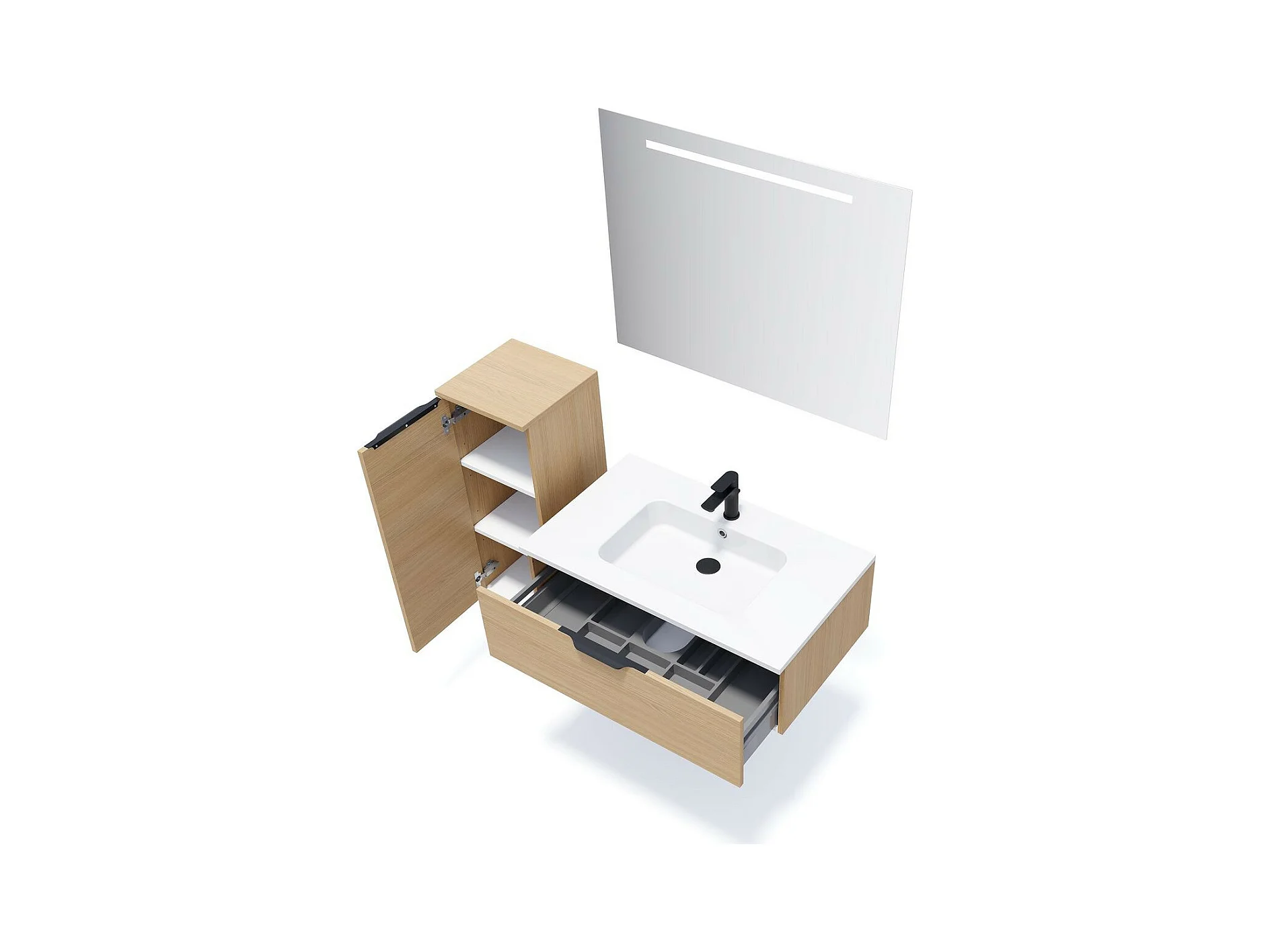 Meuble de salle de bain suspendu vasque intégrée 90cm 1 tiroir Chêne clair + miroir - Soho
