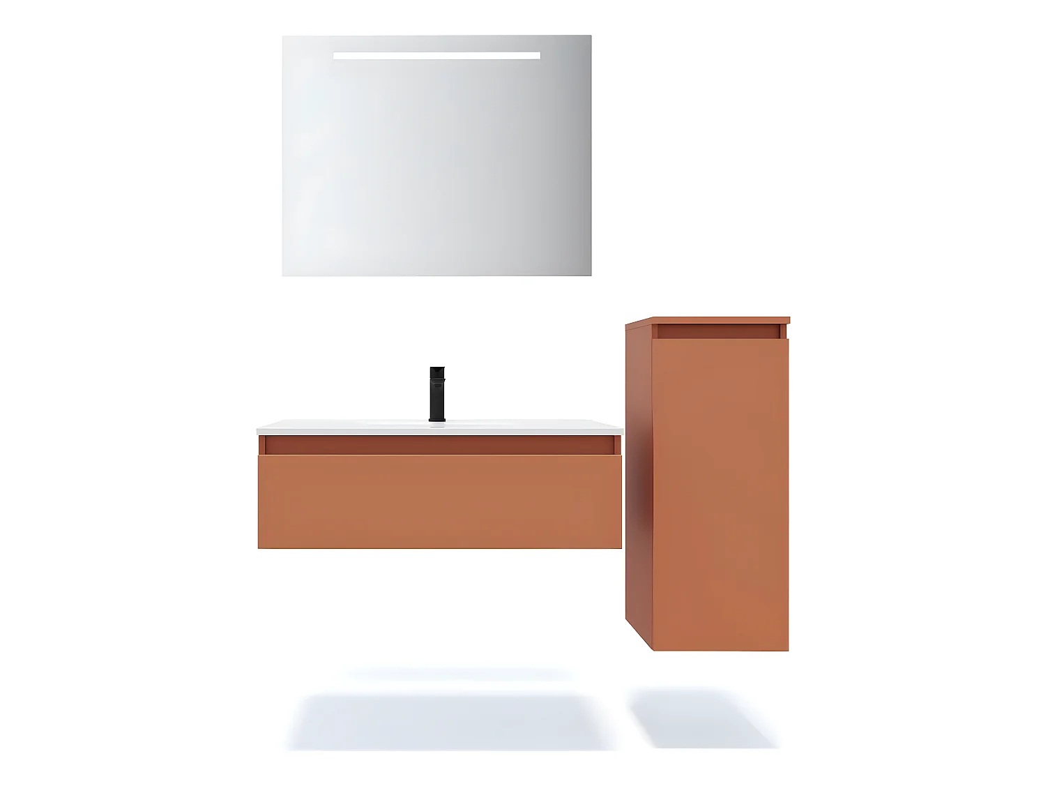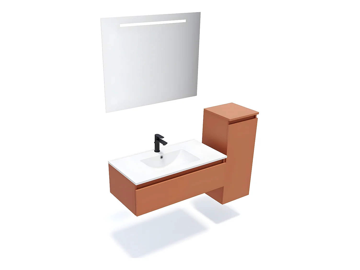 Meuble de salle de bain suspendu vasque intégrée 90cm 1 tiroir Terracotta + miroir + colonne ouverture droite - Hudson