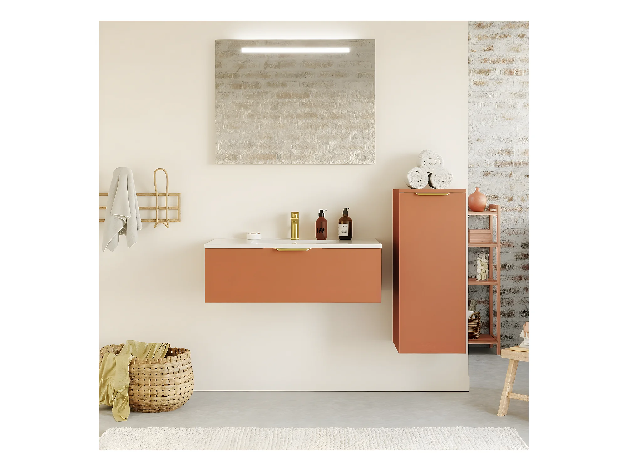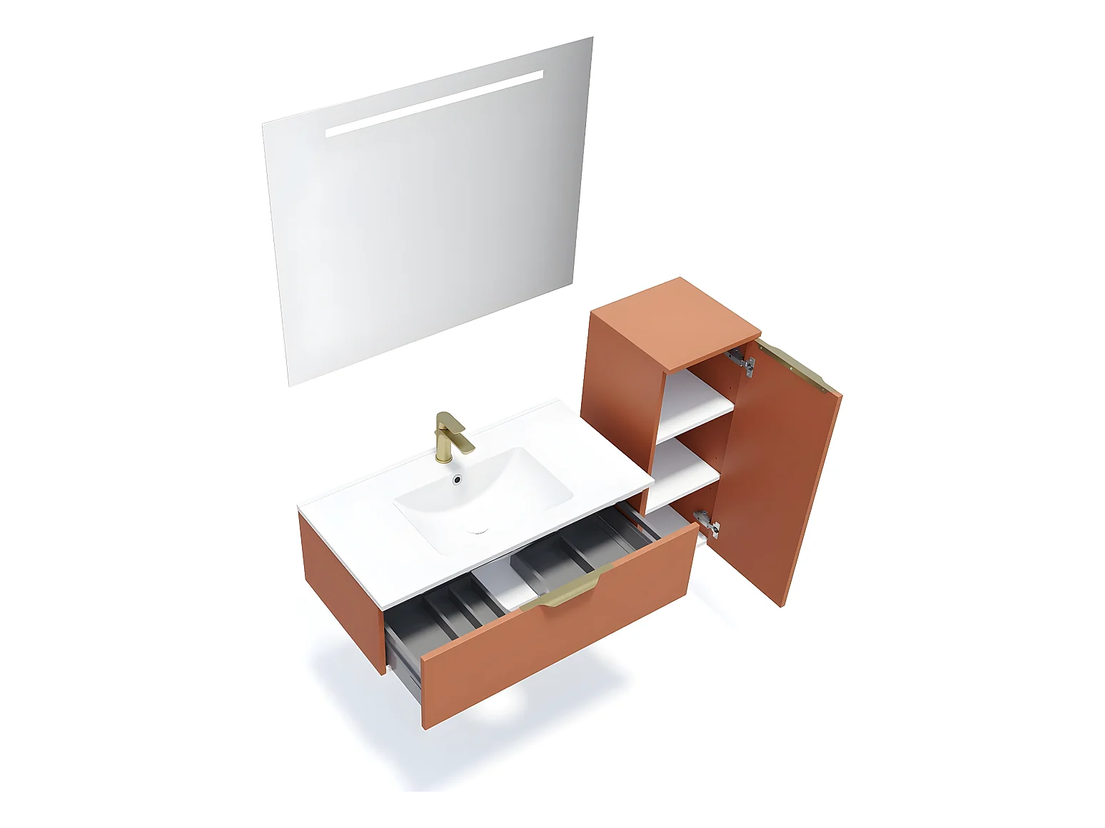 Meuble de salle de bain suspendu vasque intégrée 90cm 1 tiroir Terracotta + miroir + colonne ouverture droite - Venice