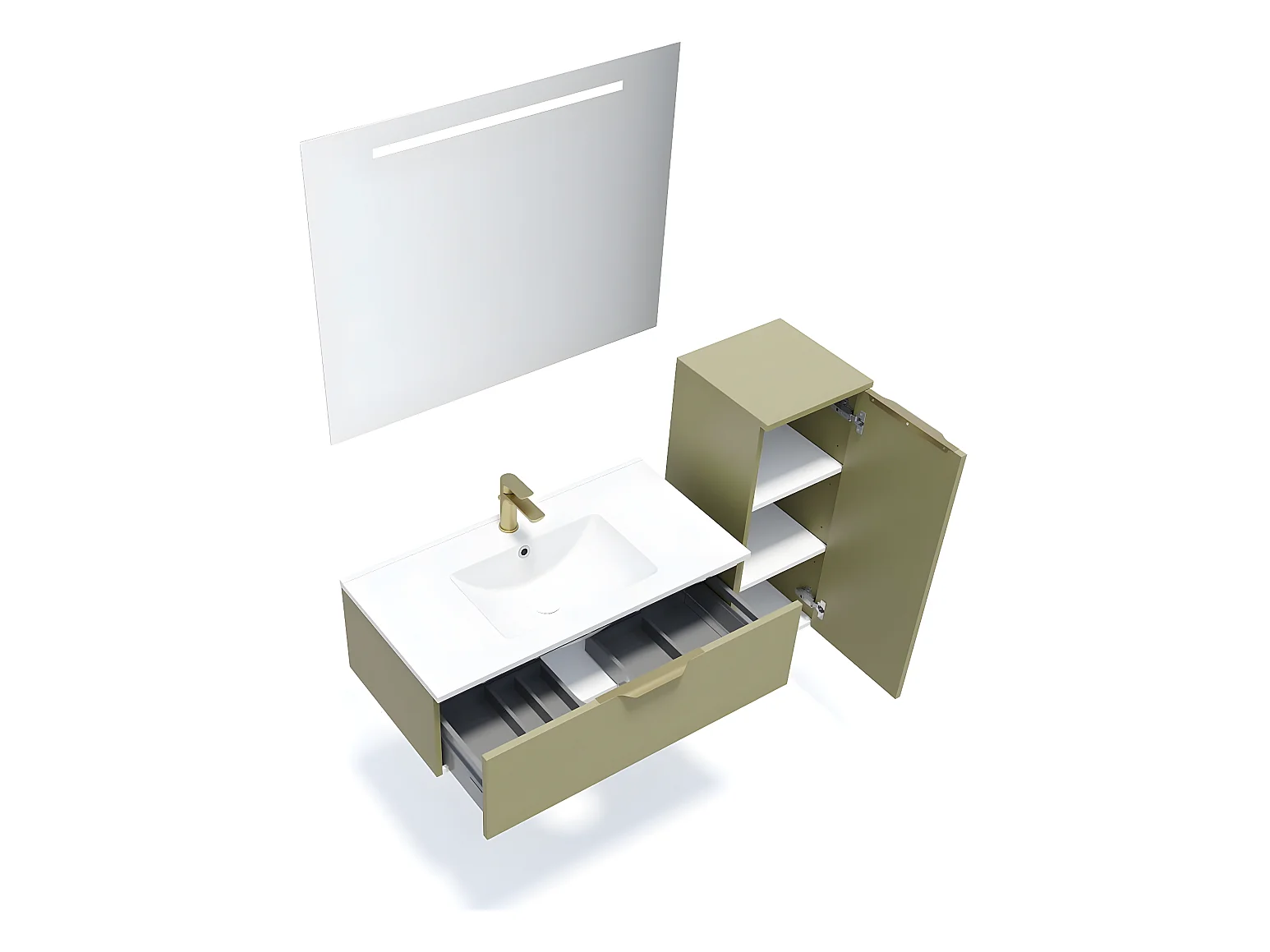 Meuble de salle de bain suspendu vasque intégrée 90cm 1 tiroir Vert olive + miroir + colonne ouverture droite - Venice