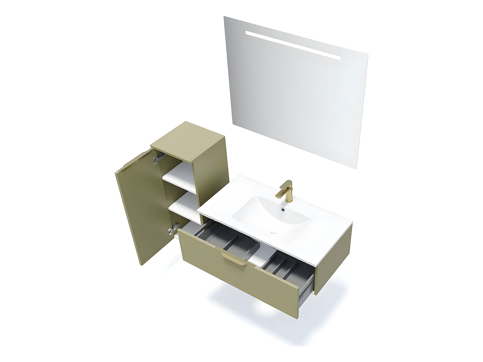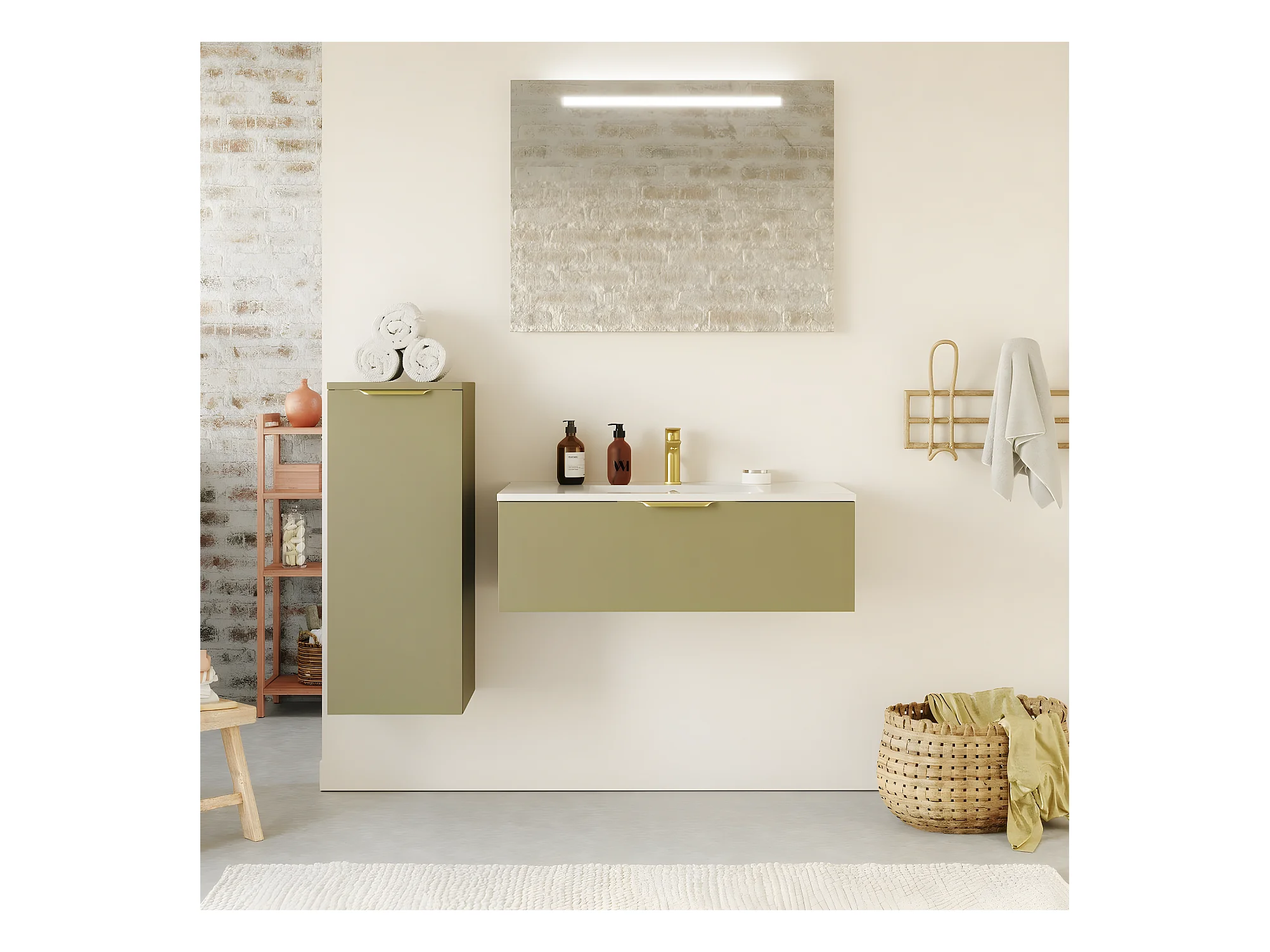 Meuble de salle de bain suspendu vasque intégrée 90cm 1 tiroir Vert olive + miroir + colonne ouverture gauche - Venice