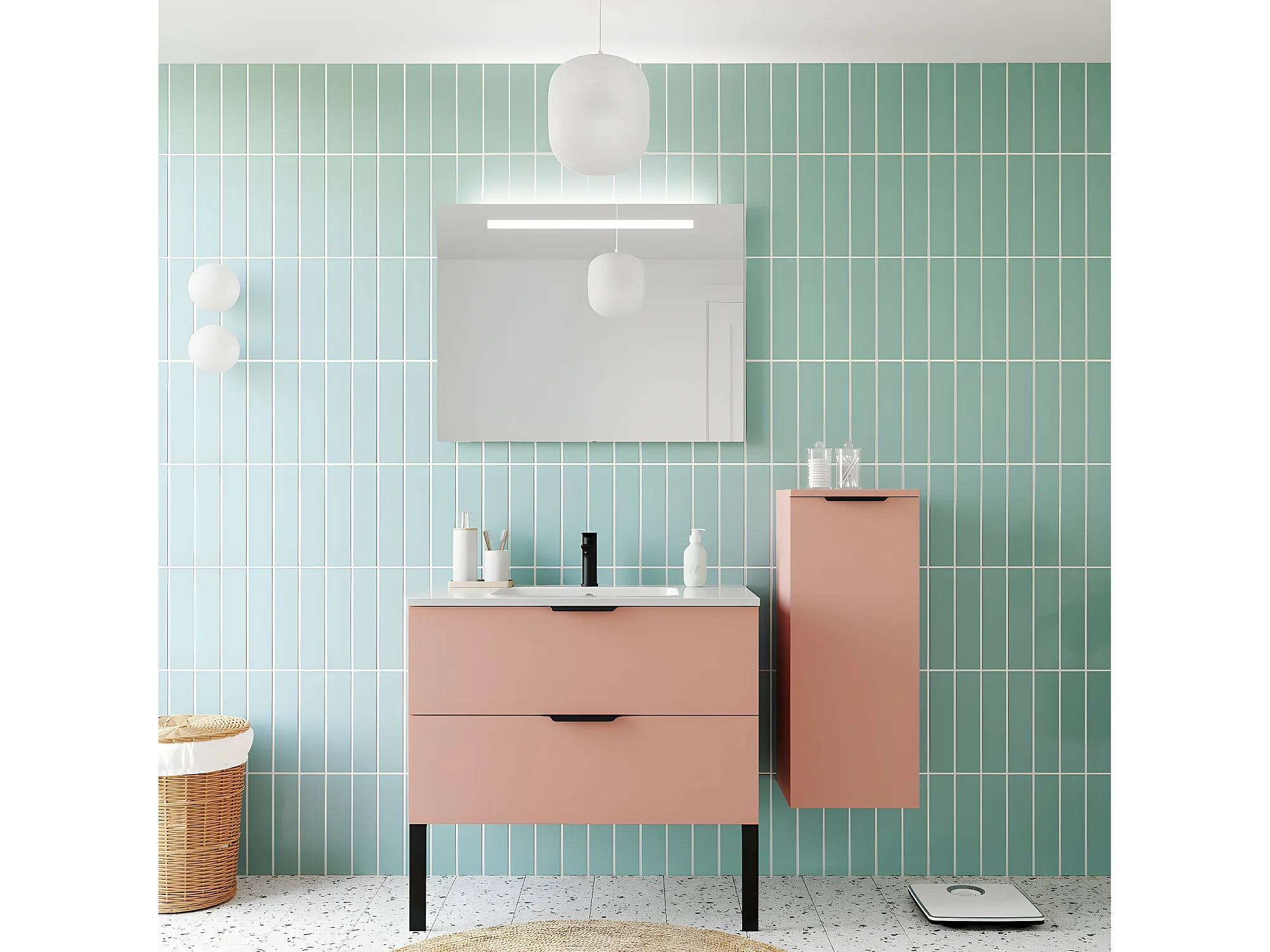 Meuble de salle de bain suspendu vasque intégrée 90cm 2 tiroirs Abricot + miroir + colonne ouverture droite - Soho