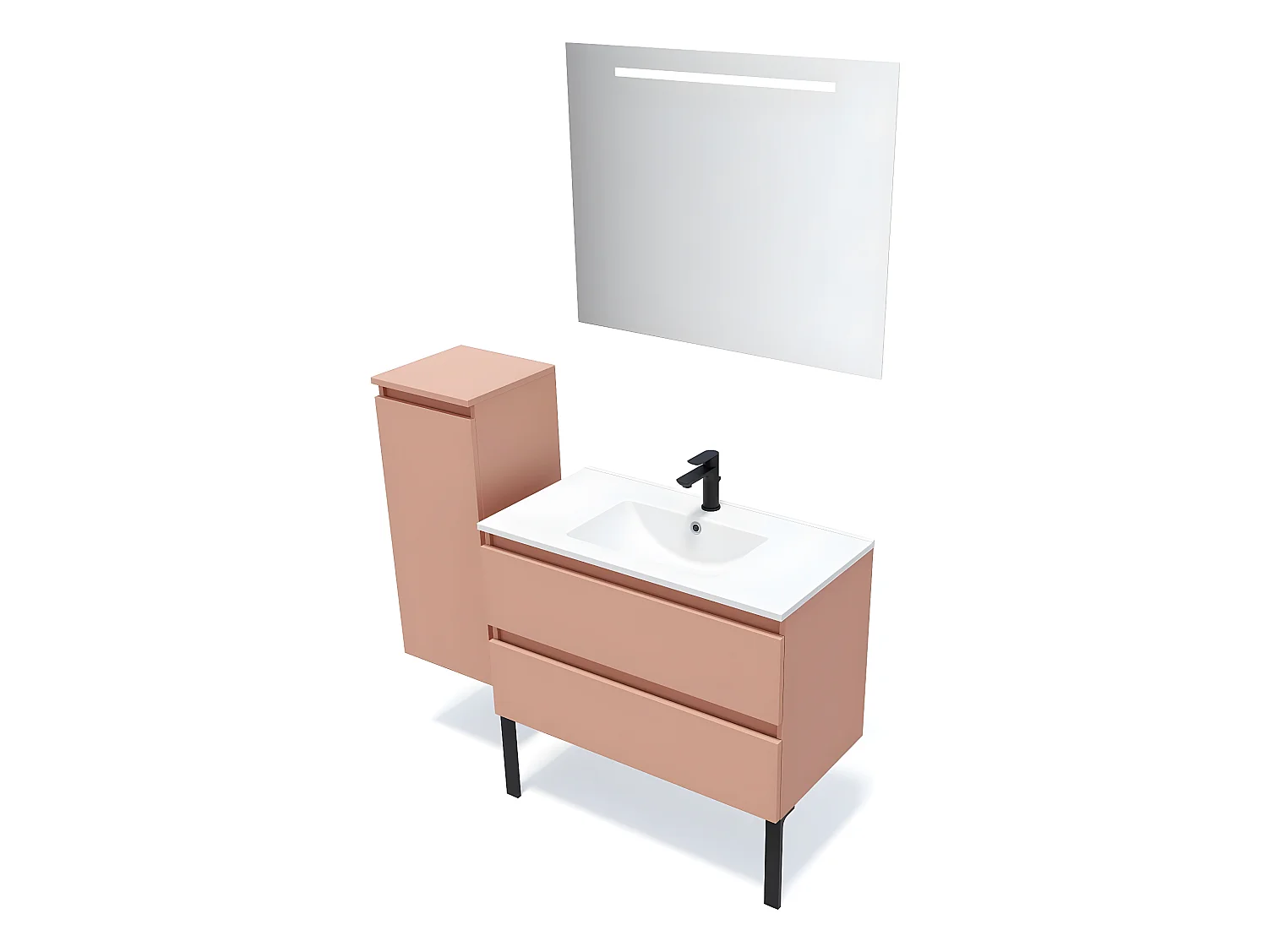 Meuble de salle de bain suspendu vasque intégrée 90cm 2 tiroirs Abricot + miroir + colonne ouverture gauche - Hudson