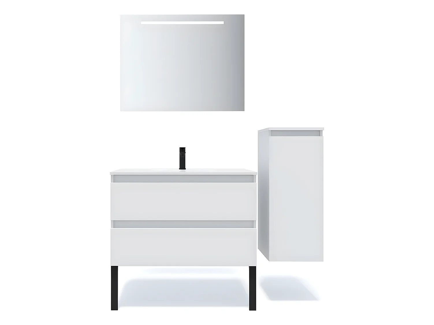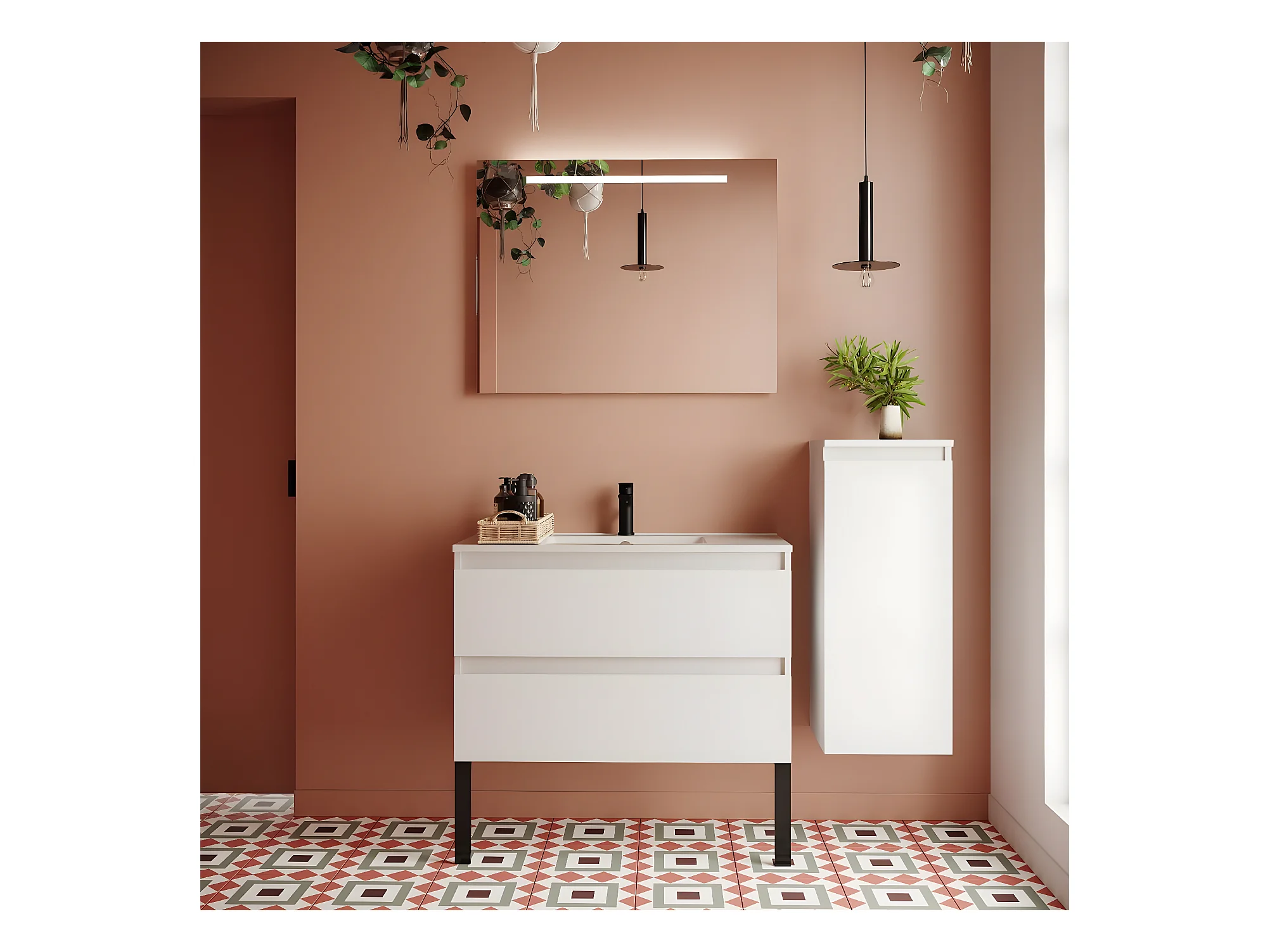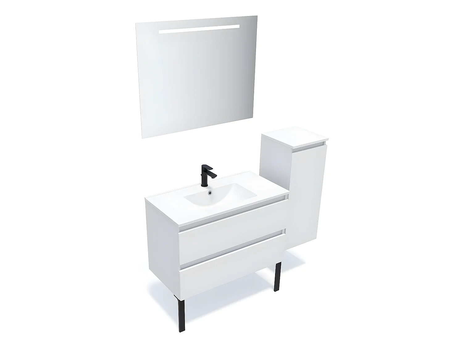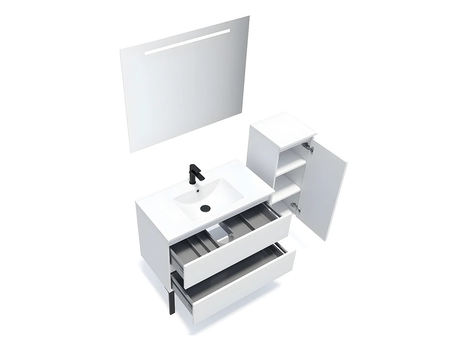 Meuble de salle de bain suspendu vasque intégrée 90cm 2 tiroirs Blanc + miroir + colonne ouverture droite - Hudson