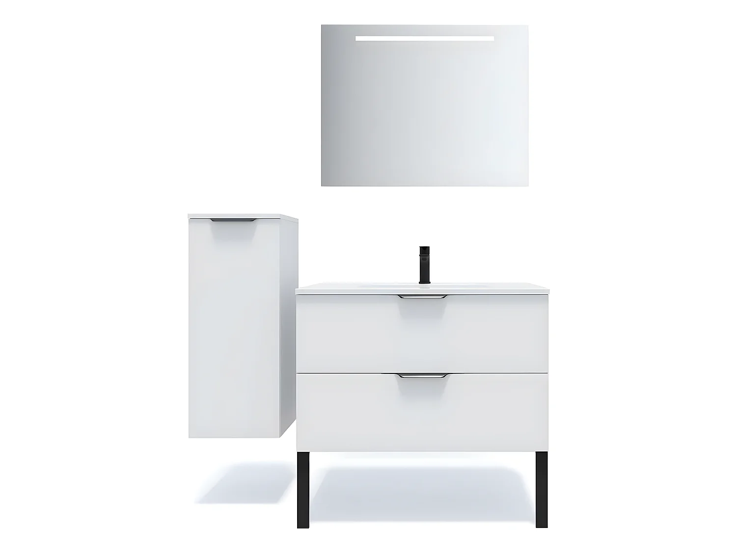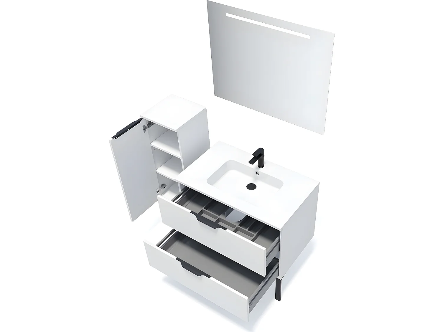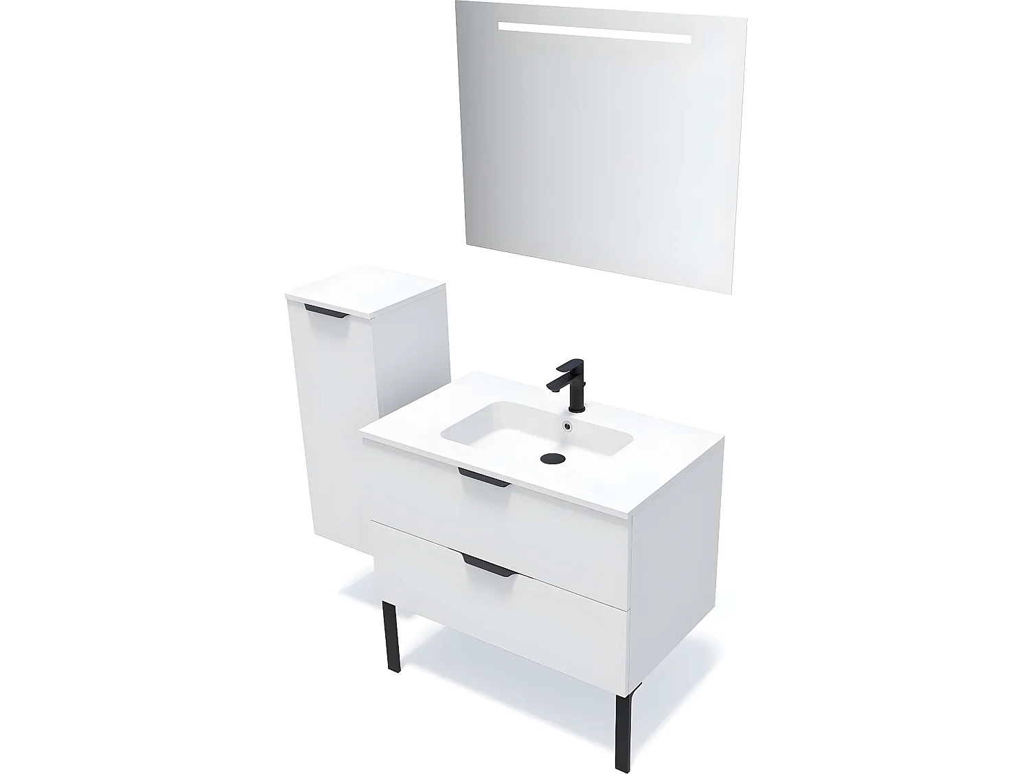 Meuble de salle de bain suspendu vasque intégrée 90cm 2 tiroirs Blanc + miroir + colonne ouverture gauche - Soho