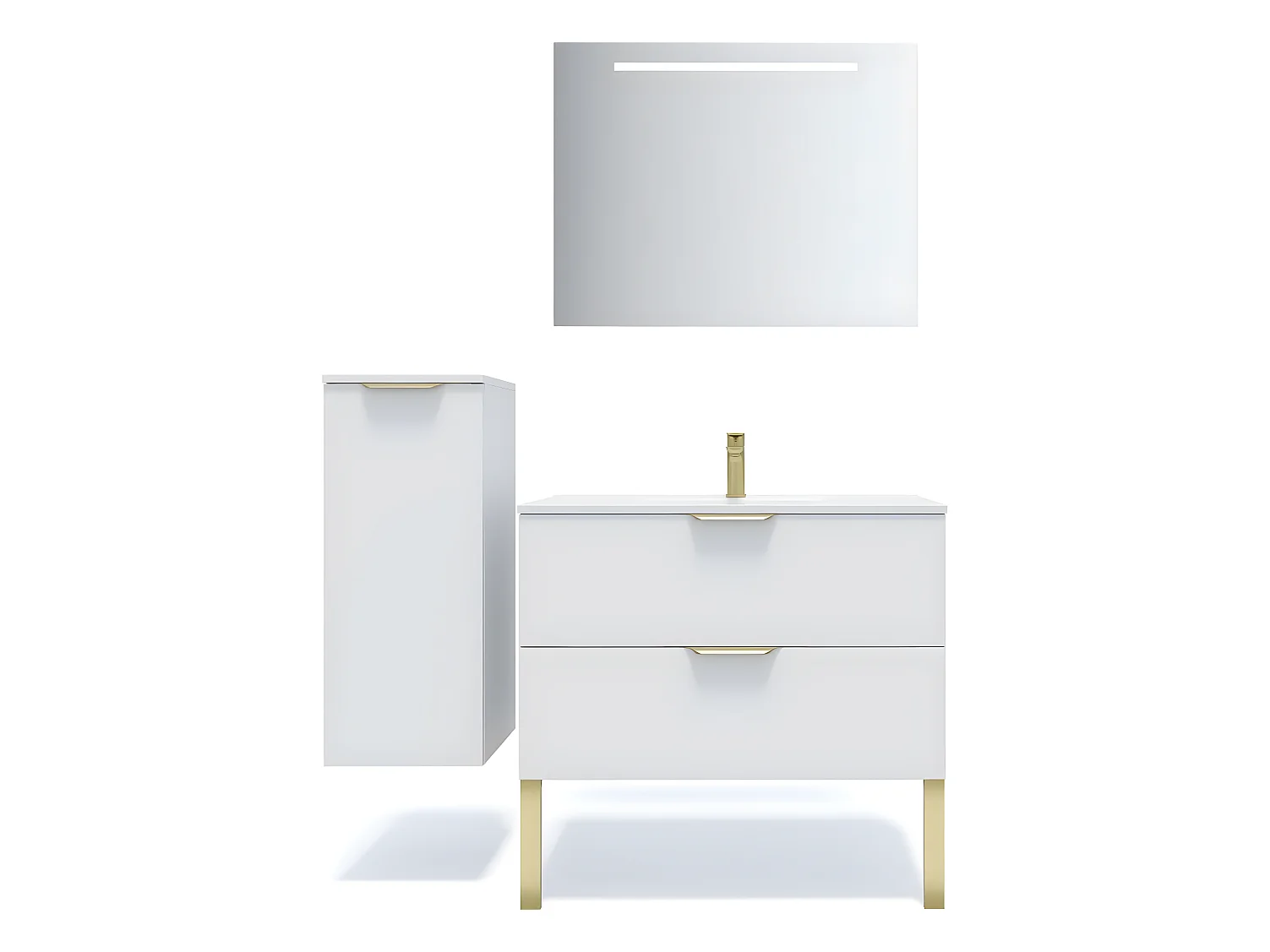 Meuble de salle de bain suspendu vasque intégrée 90cm 2 tiroirs Blanc + miroir + colonne ouverture gauche - Venice