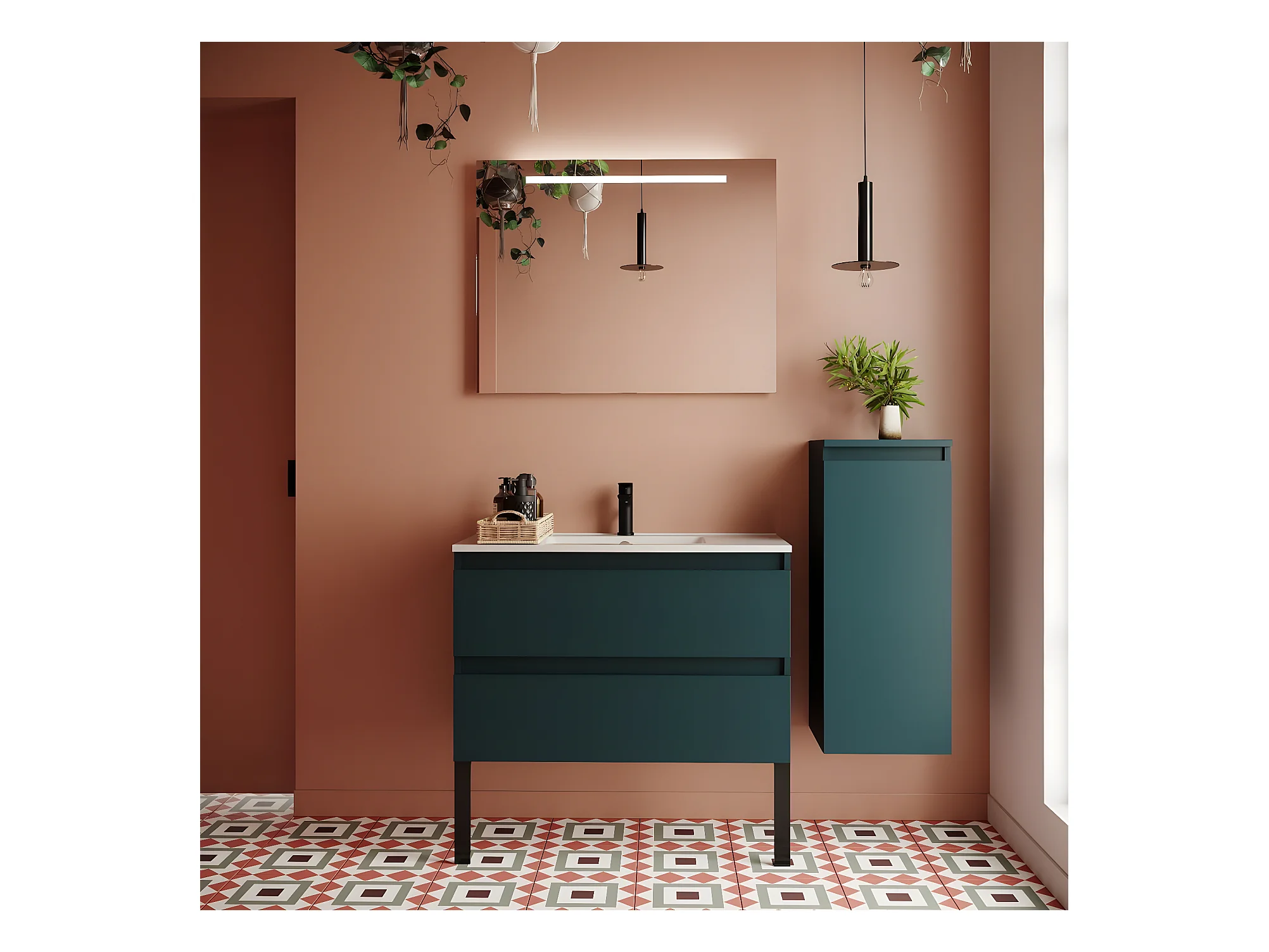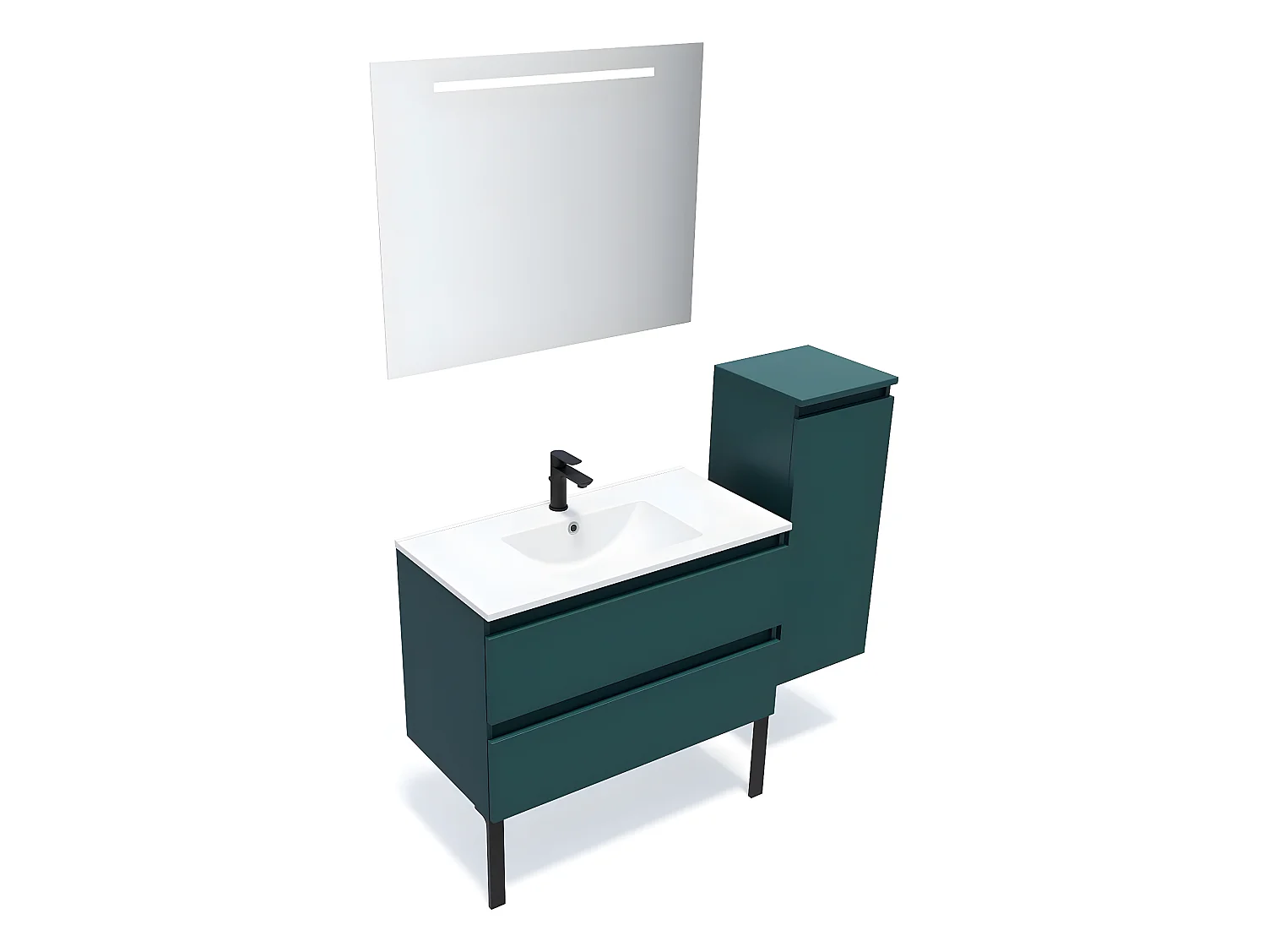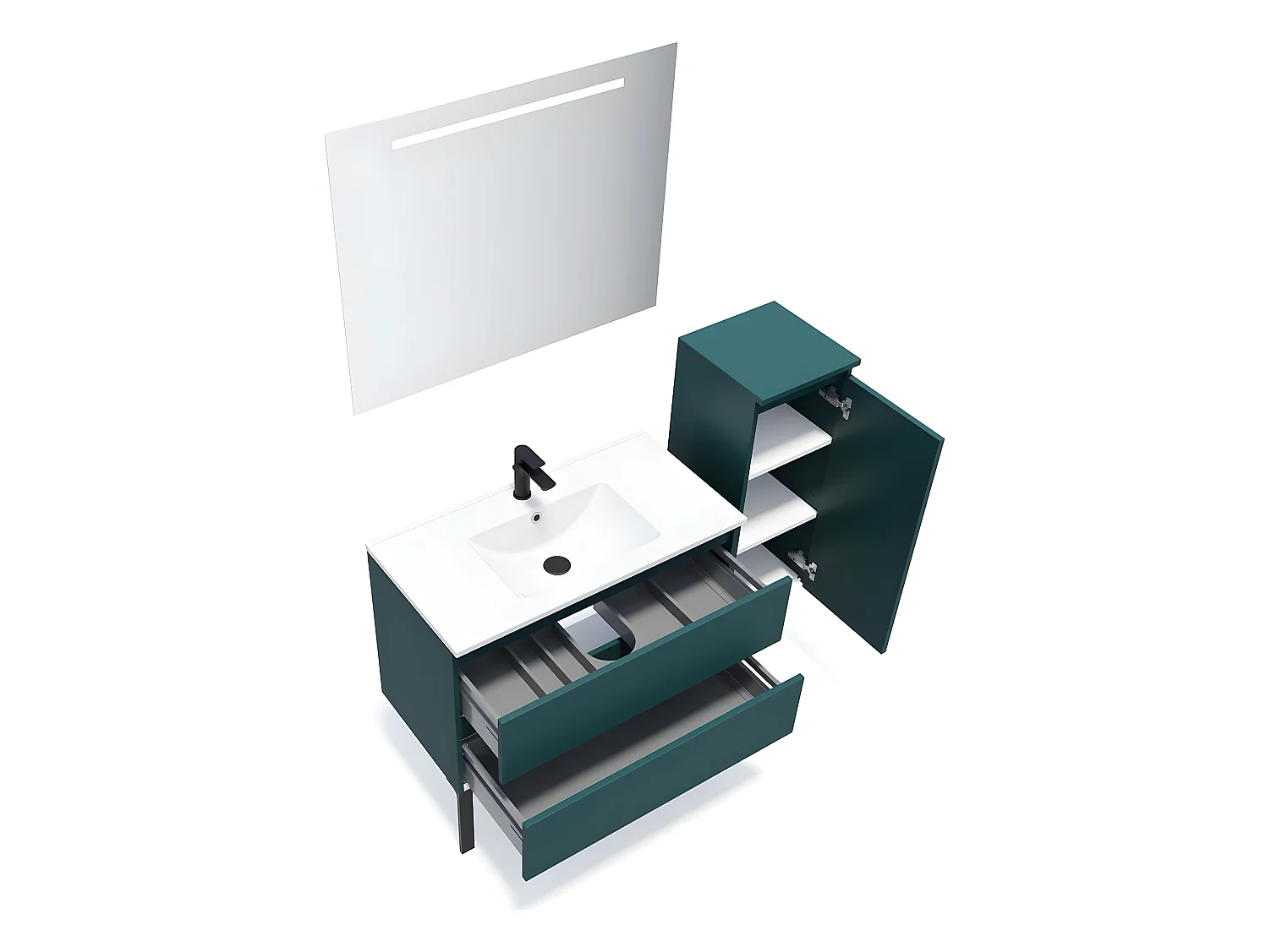 Meuble de salle de bain suspendu vasque intégrée 90cm 2 tiroirs Bleu + miroir + colonne ouverture droite - Hudson