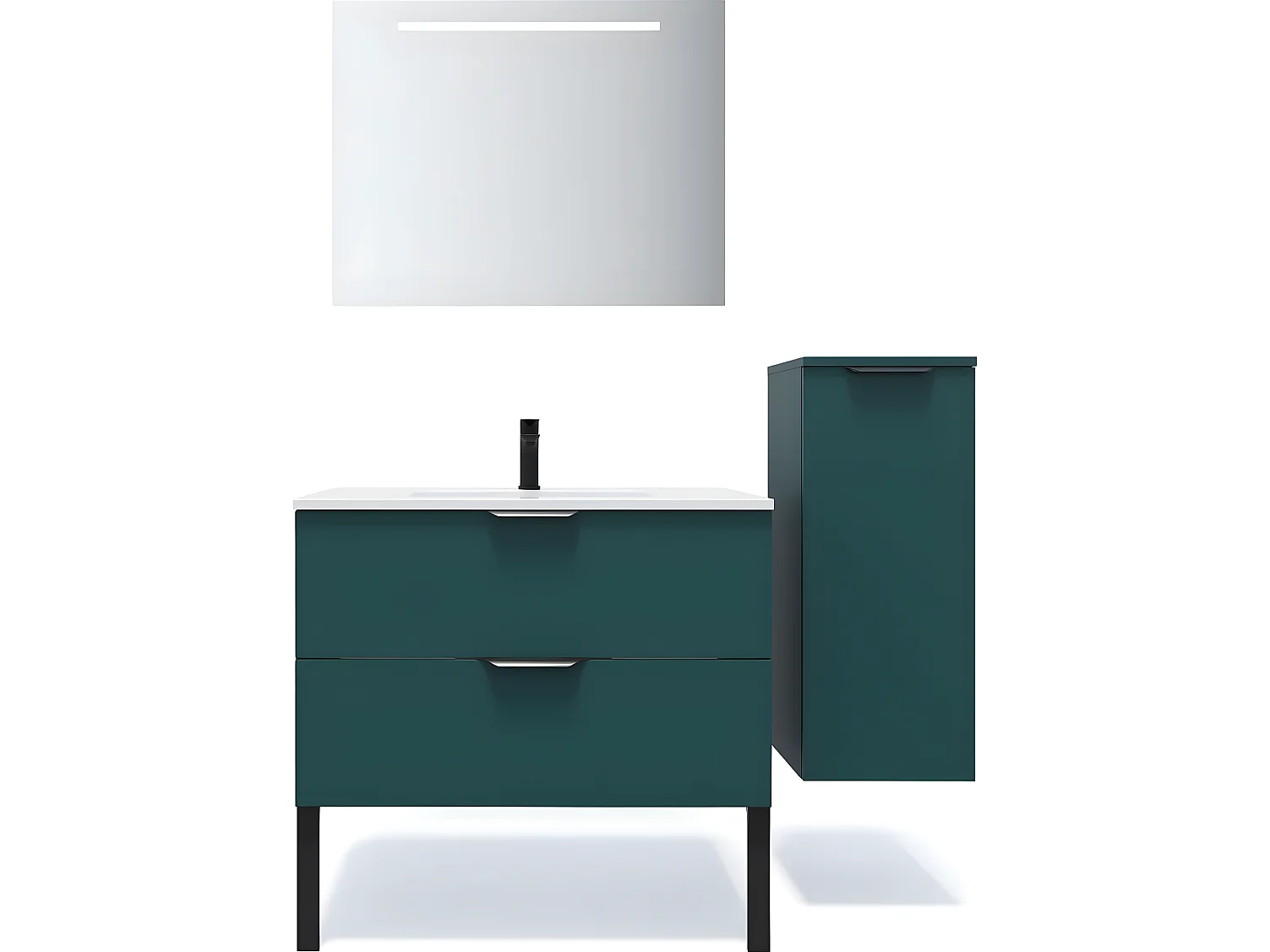 Meuble de salle de bain suspendu vasque intégrée 90cm 2 tiroirs Bleu + miroir + colonne ouverture droite - Soho
