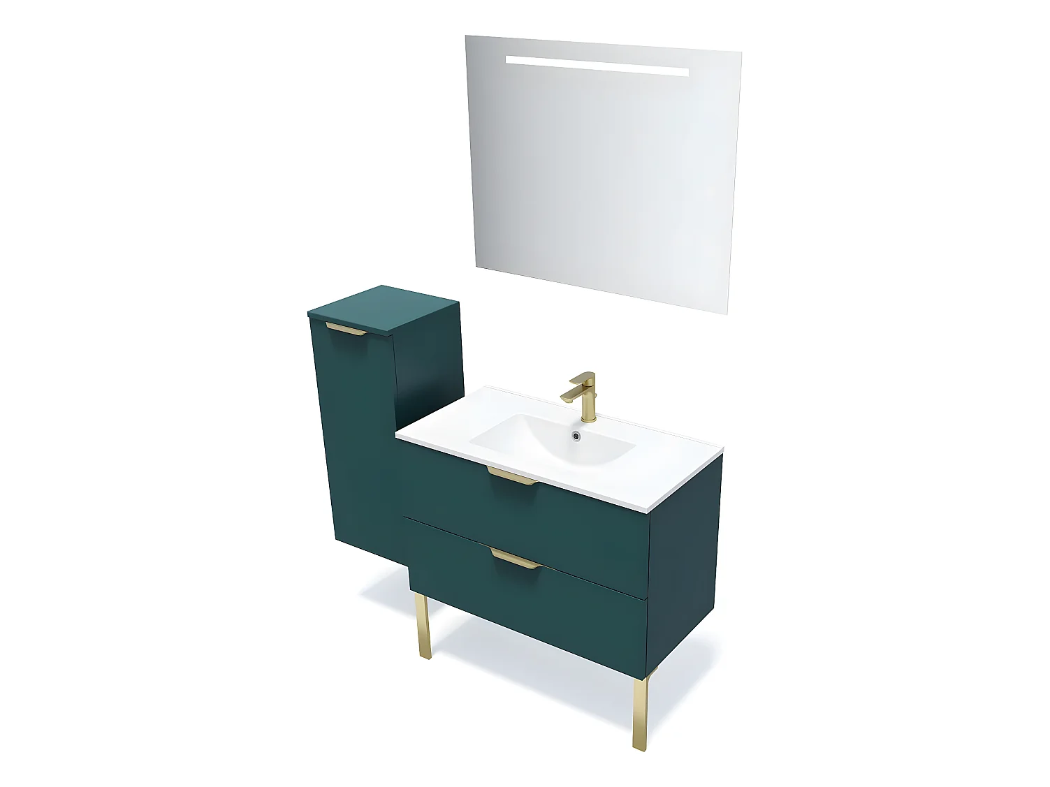Meuble de salle de bain suspendu vasque intégrée 90cm 2 tiroirs Bleu + miroir + colonne ouverture gauche - Venice