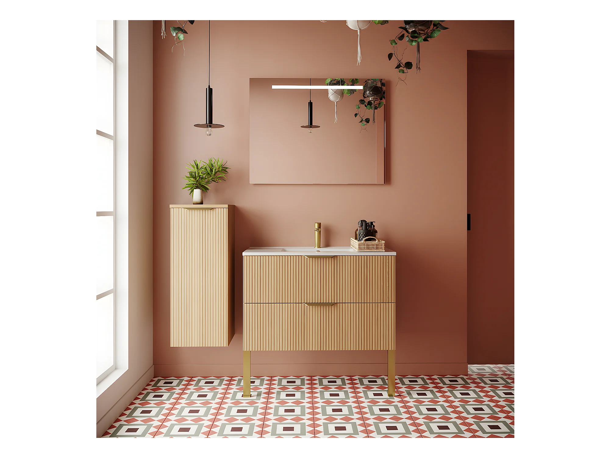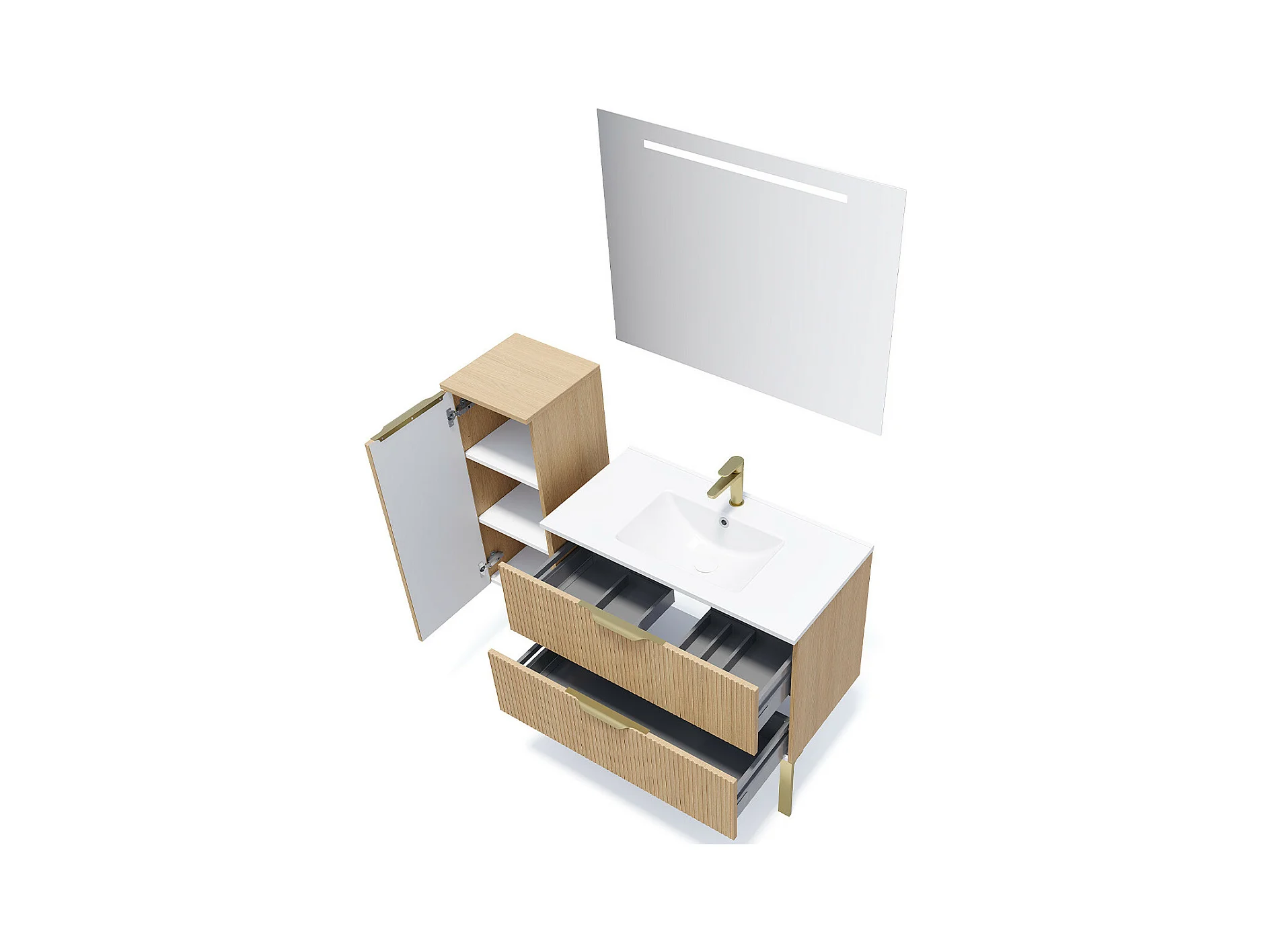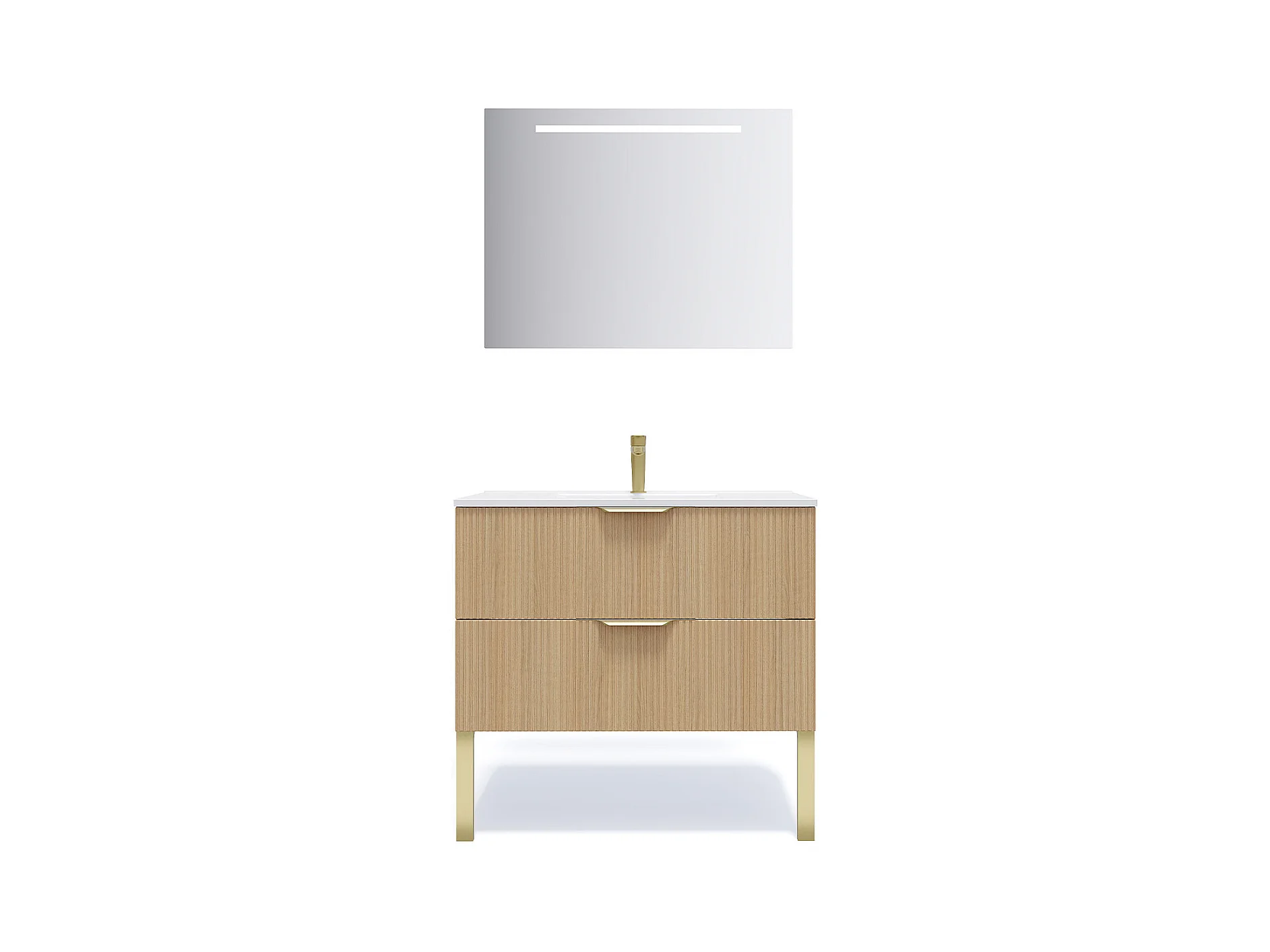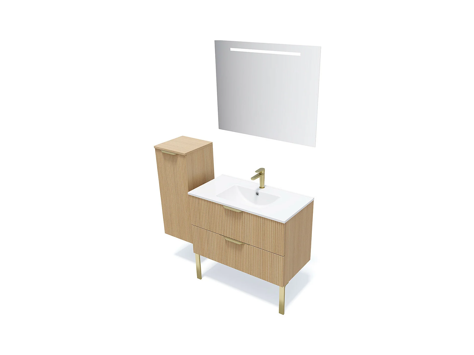 Meuble de salle de bain suspendu vasque intégrée 90cm 2 tiroirs Chêne cannelé + miroir - Venice