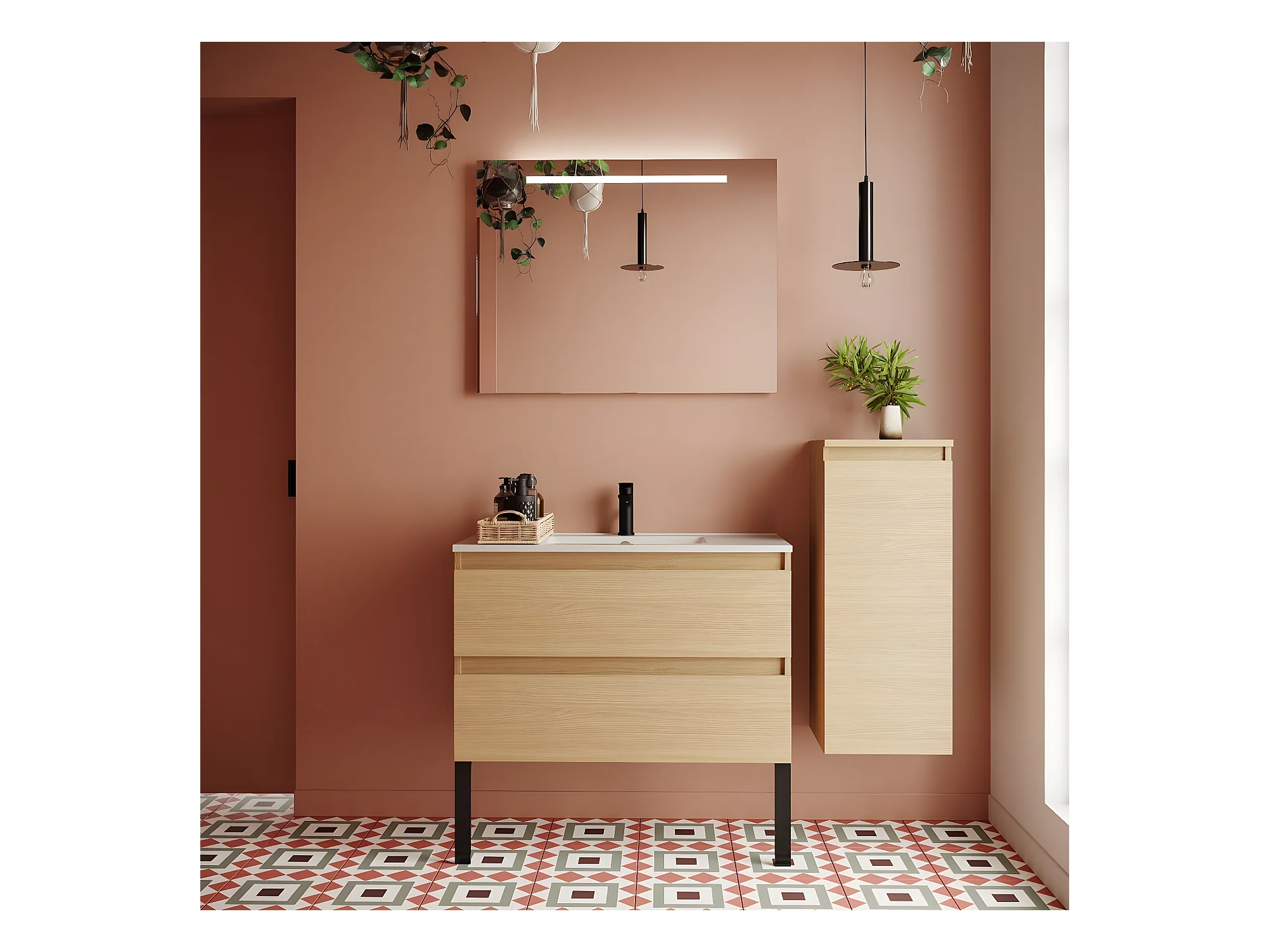 Meuble de salle de bain suspendu vasque intégrée 90cm 2 tiroirs Chêne clair + miroir + colonne ouverture droite - Hudson