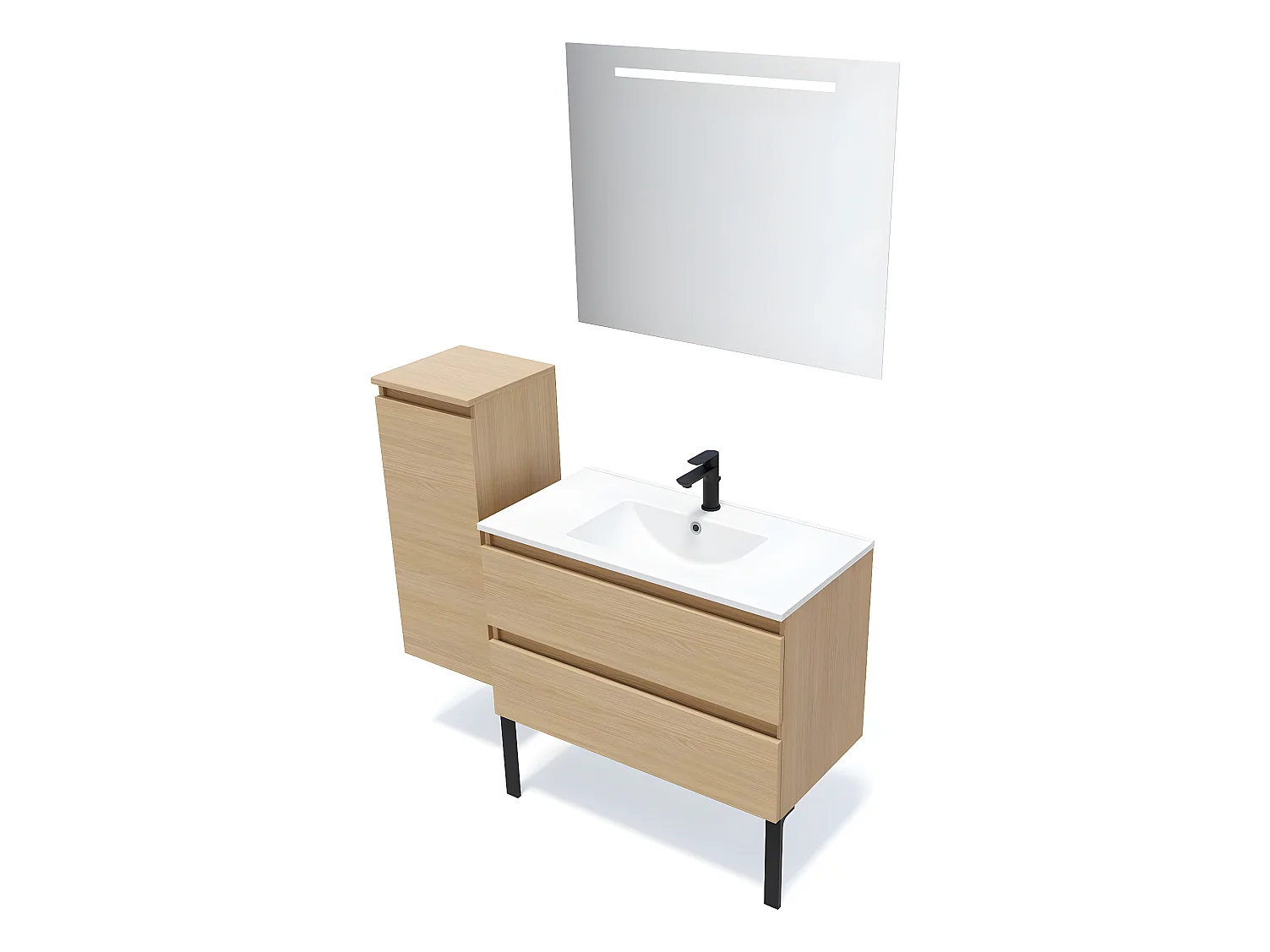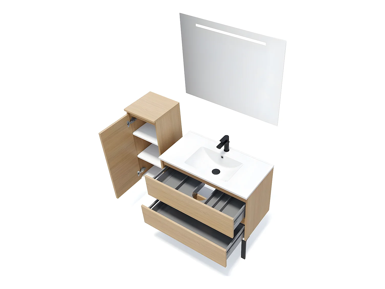 Meuble de salle de bain suspendu vasque intégrée 90cm 2 tiroirs Chêne clair + miroir + colonne ouverture gauche - Hudson